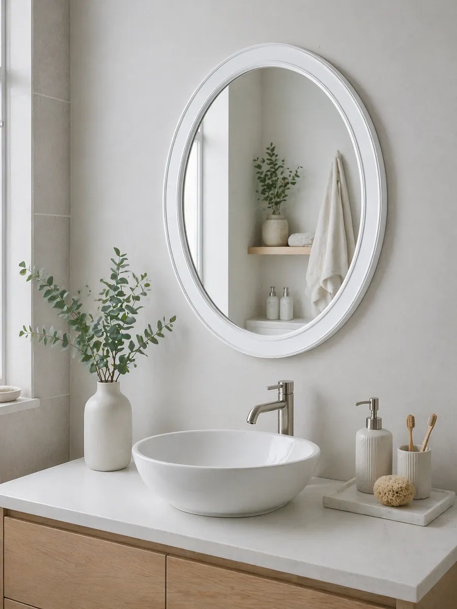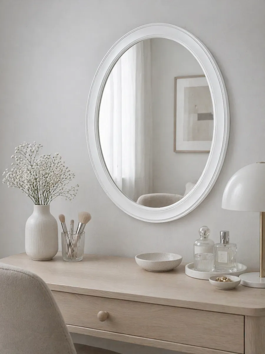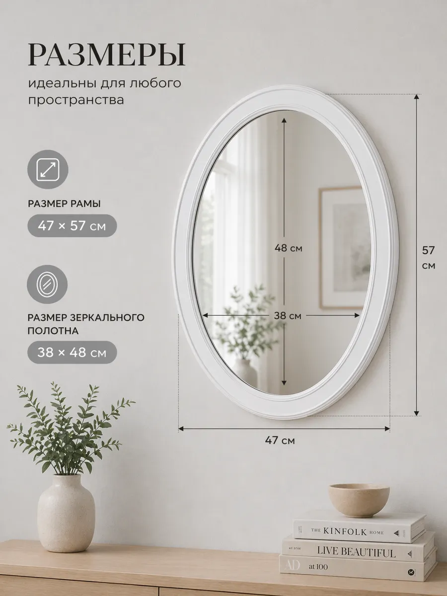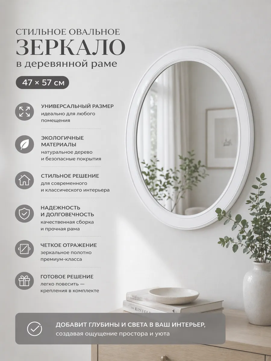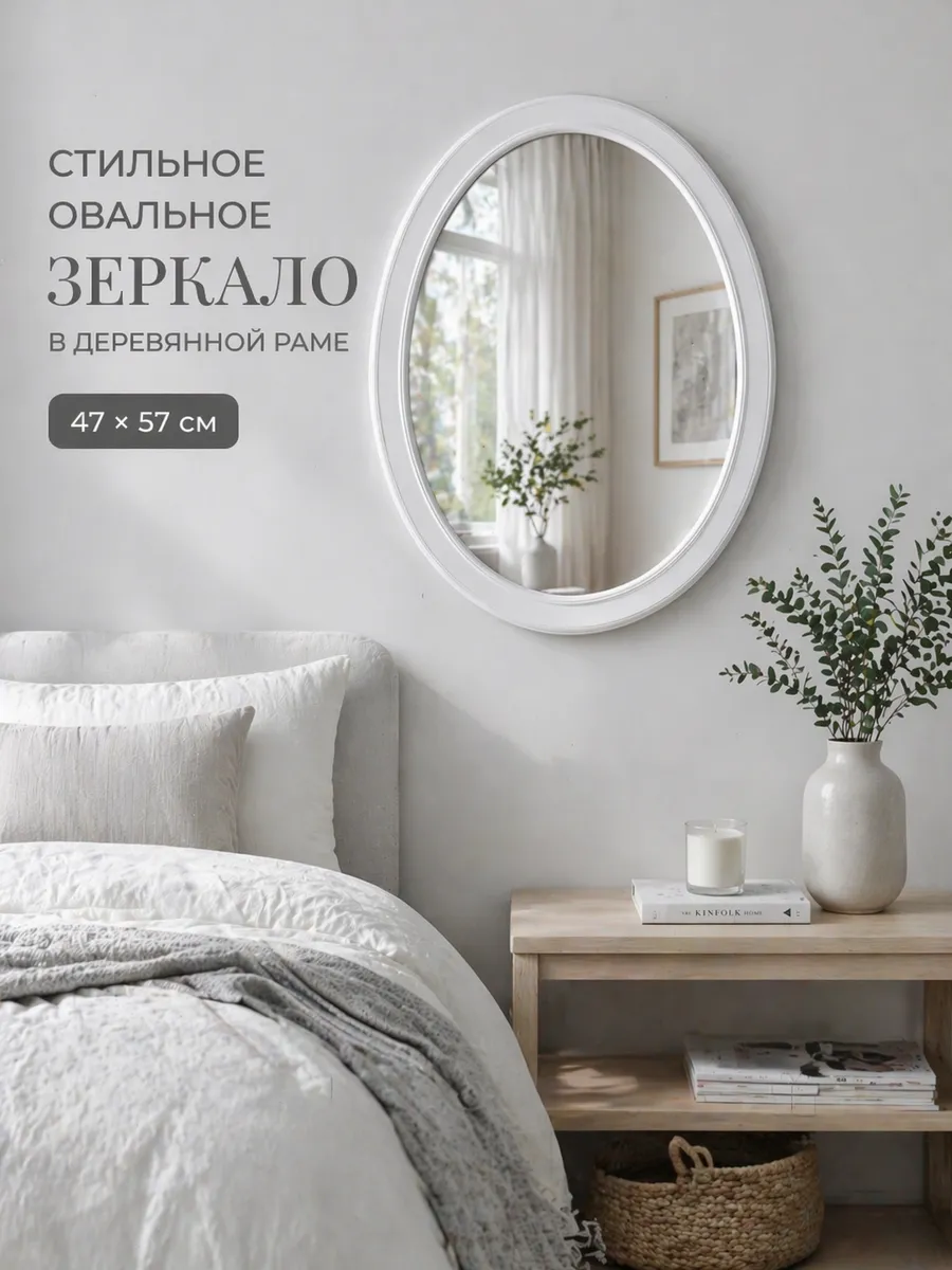 Элегантное овальное зеркало в деревянной раме — универсальное решение для спальни, прихожей, ванной комнаты или зоны туалетного столика.