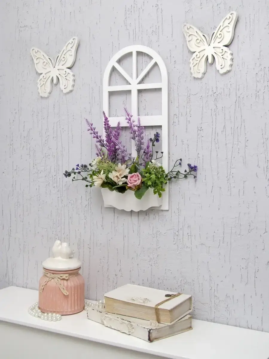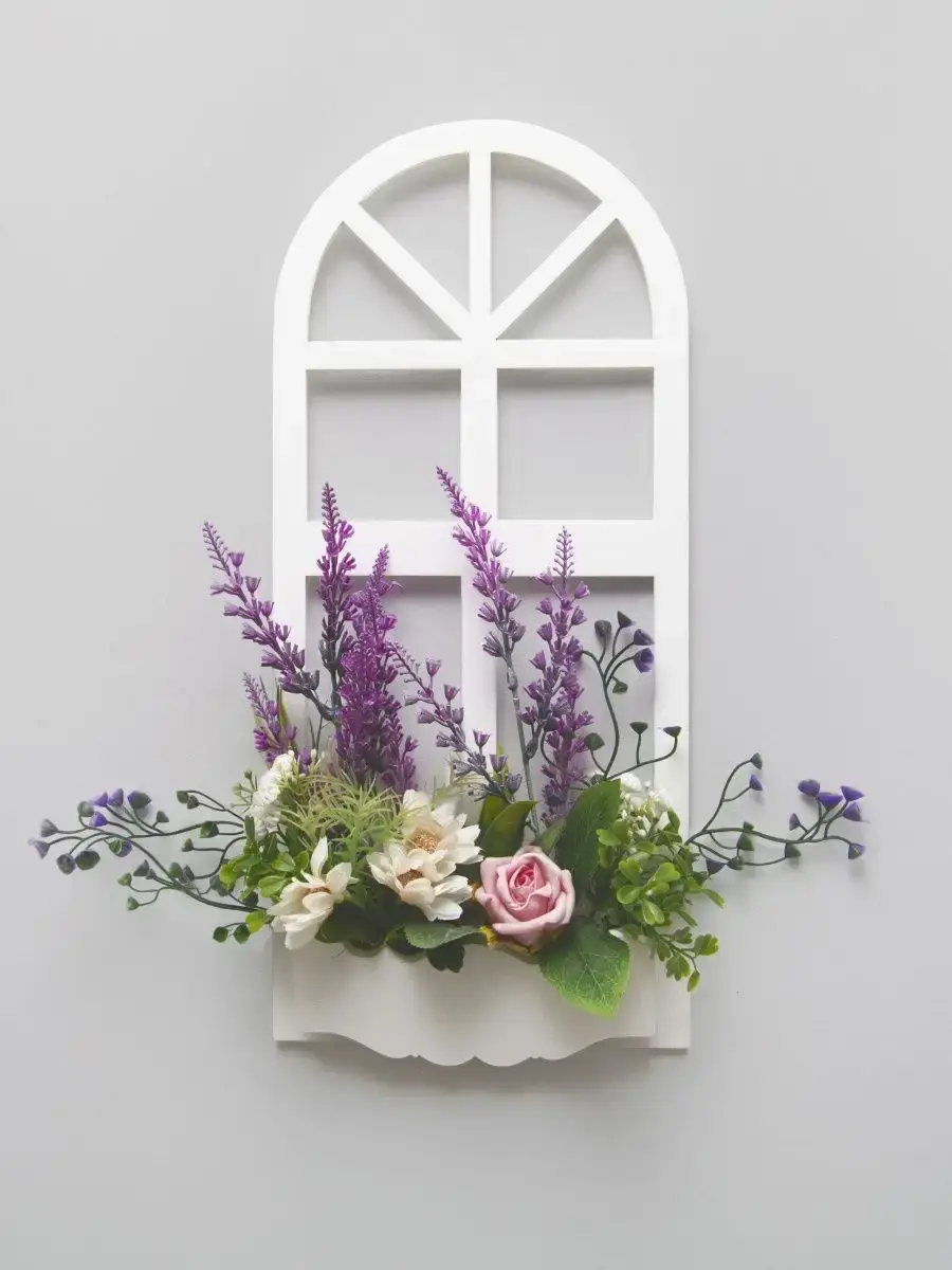Украшение настенное для интерьера с искусственными интерьерными цветами . Композиция настенная в деревянном кашпо-окно с цветами, ВНИМАНИЕ! Размеры фальш-окна композиций отличаются (18х40см или 38х21см) Размер конкретной модели указан в карусели фотографий. Крепление на зубчатый крепеж , саморез для стены в комплекте. Отличное украшение к зеркалу, в прихожей, ванной или для кухни, где живым цветам недостаточно света. Всегда будут радовать и добавлять уюта в дом. Прекрасный подарок для дома, дачи или салона красоты. По желанию самостоятельно можно дополнить светодиодными нитями (светодиодной гирляндой). Уход : обдуть феном, протирать влажной тканью , обработать антистатиком..