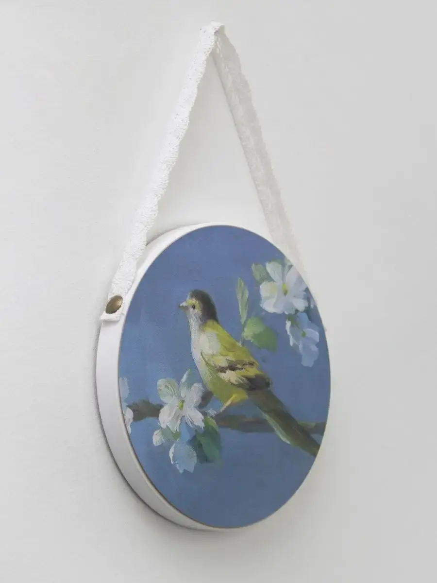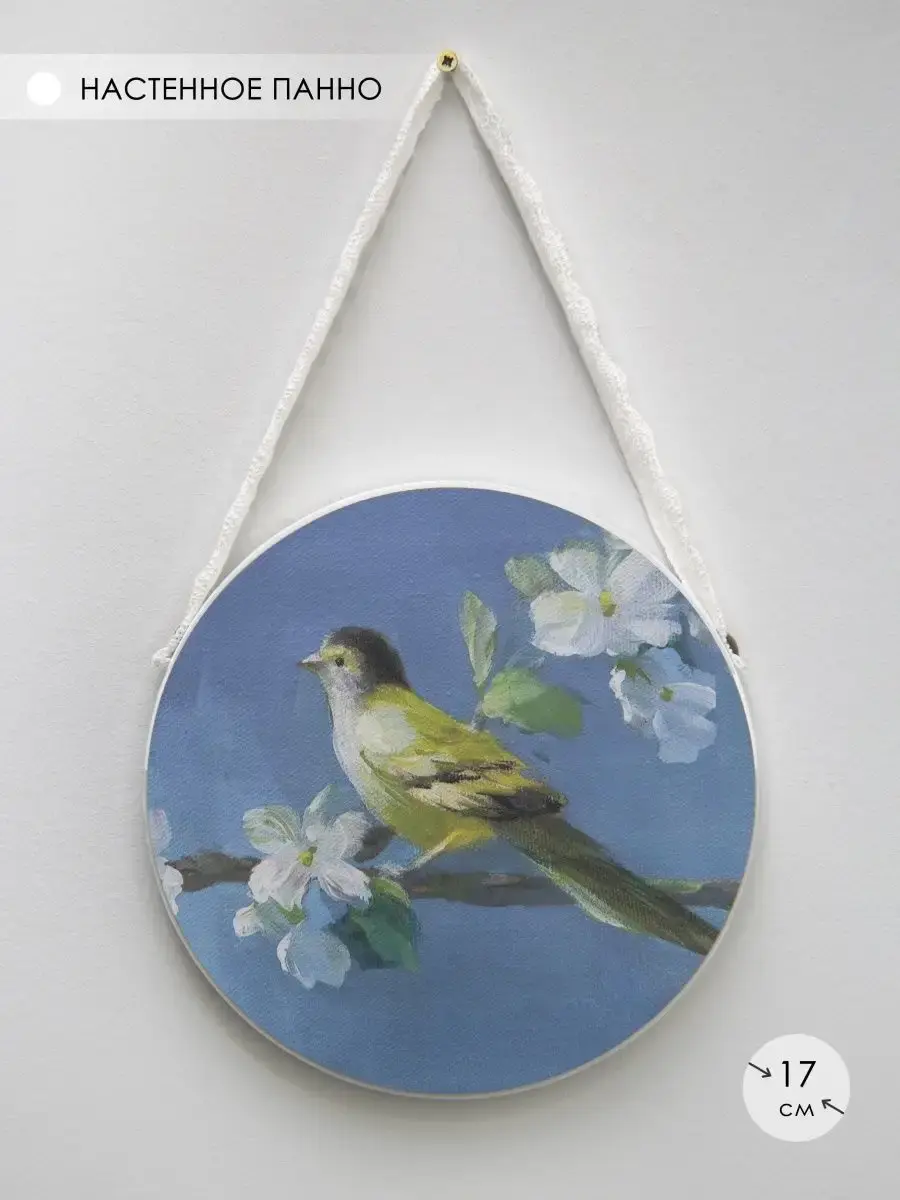 Панно на стену изготовлено из МДФ 16 мм, печать на натуральном холсте, холст покрыт лаком - декор можно протирать влажной тканью. Диаметр панно без ленты 17 см. Панно на ленте добавит изящества интерьеру кухни, спальни, прихожей, гостиной. Модуль панно можно использовать как самостоятельный элемент декора, так и в сочетании с другими панно серий "Птички" и "Райский сад".