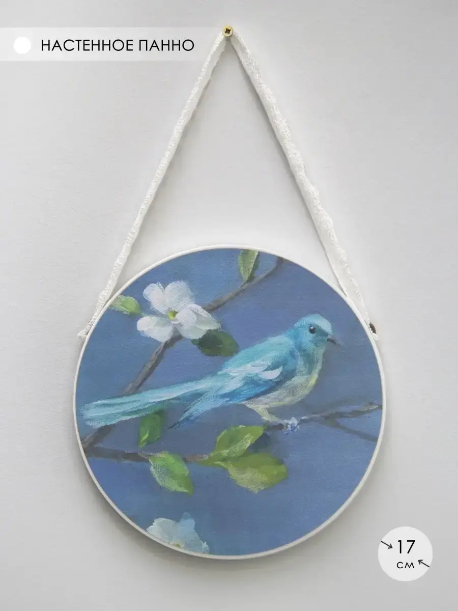 Панно на стену изготовлено из МДФ 16 мм, печать на натуральном холсте, холст покрыт лаком - декор можно протирать влажной тканью. Диаметр панно без ленты 17 см. Панно на ленте добавит изящества интерьеру кухни, спальни, прихожей, гостиной. Модуль панно можно использовать как самостоятельный элемент декора, так и в сочетании с другими панно серий "Птички" и "Райский сад".