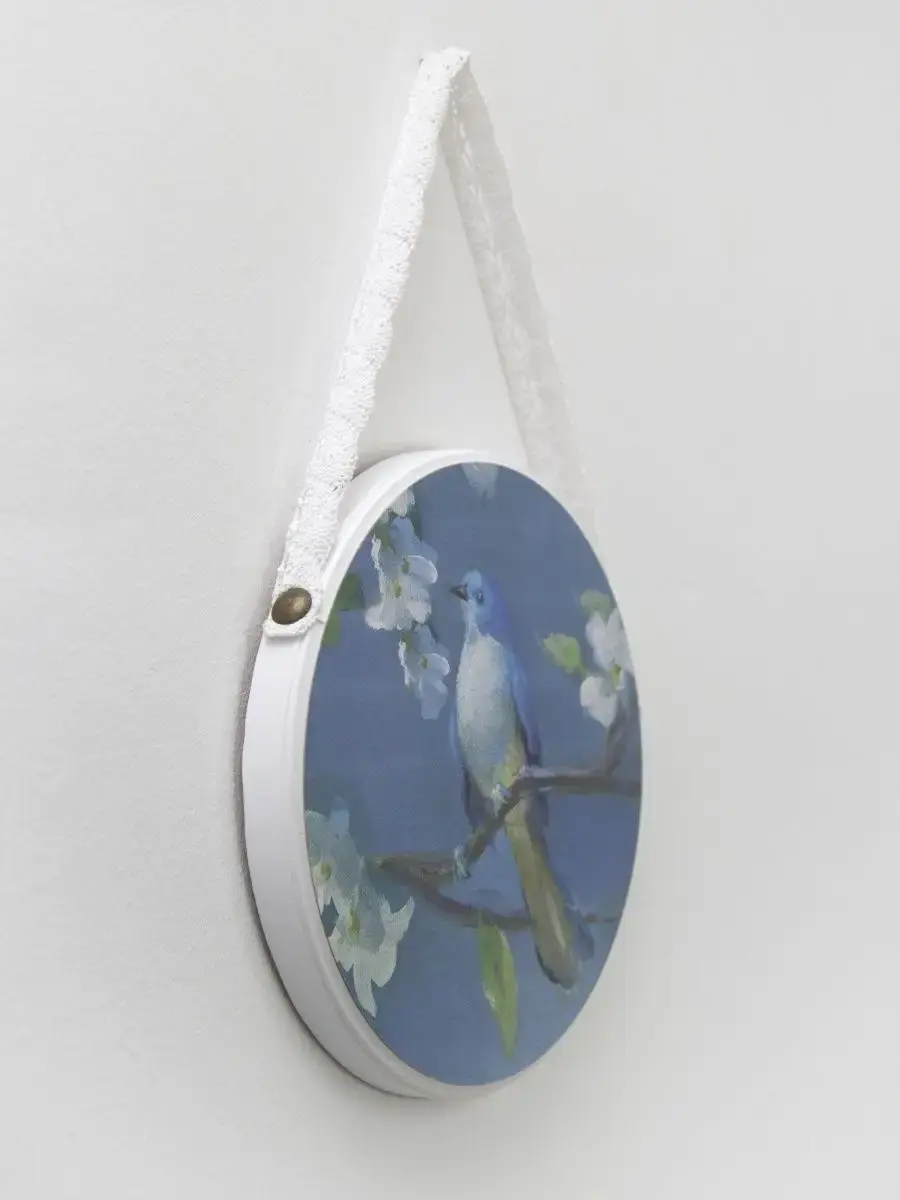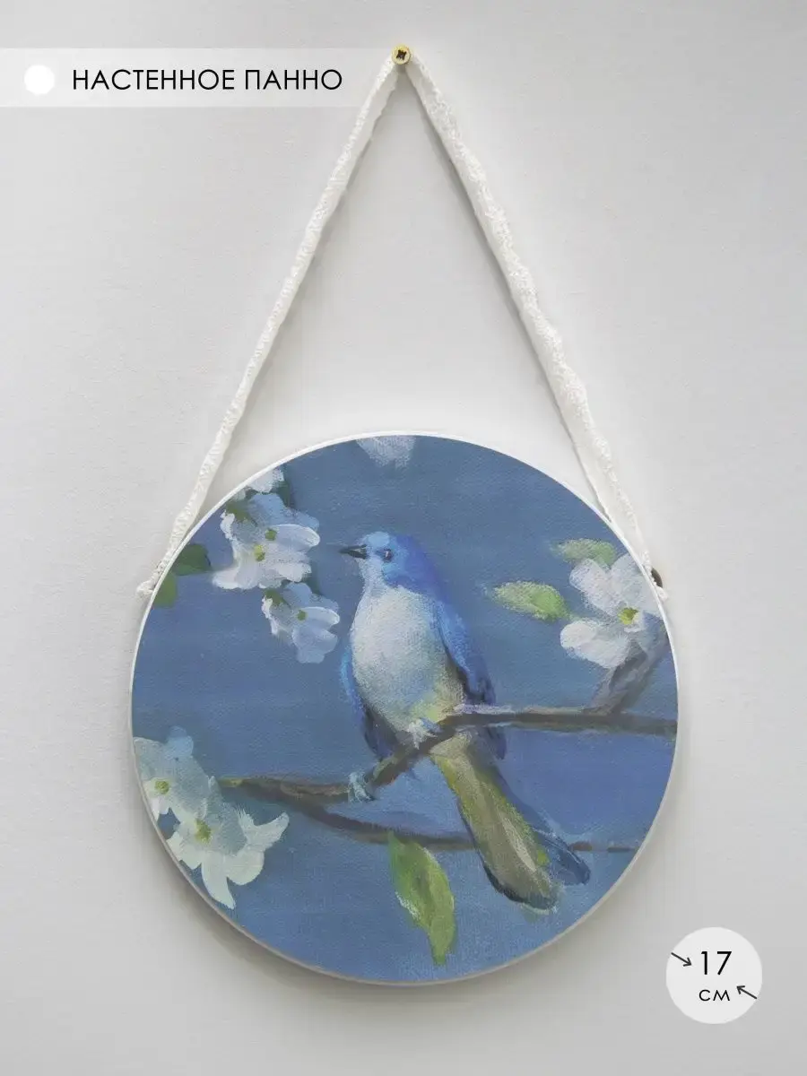 Панно на стену изготовлено из МДФ 16 мм, печать на натуральном холсте, холст покрыт лаком - декор можно протирать влажной тканью. Диаметр панно без ленты 17 см. Панно на ленте добавит изящества интерьеру кухни, спальни, прихожей, гостиной. Модуль панно можно использовать как самостоятельный элемент декора, так и в сочетании с другими панно серий "Птички" и "Райский сад".