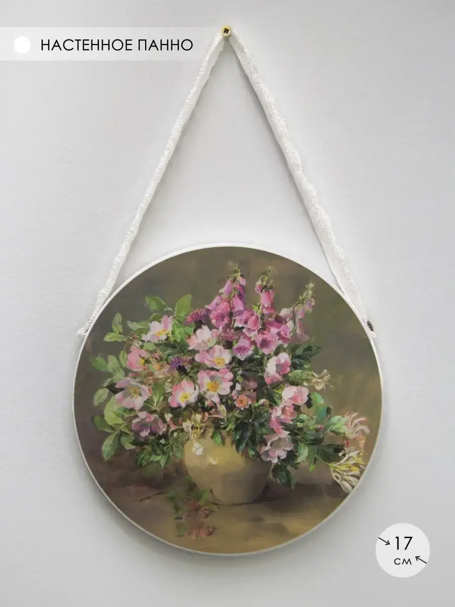 Панно на стену изготовлено из МДФ 16 мм, печать на бумаге, покрытой ламинацией для защиты изображения - декор можно протирать влажной тканью. Диаметр панно без ленты 17 см. Панно на ленте добавит изящества интерьеру кухни, спальни, прихожей, гостиной. Модуль панно можно использовать как самостоятельный элемент декора, так и в сочетании с другими панно серий "Птички" и "Райский сад".