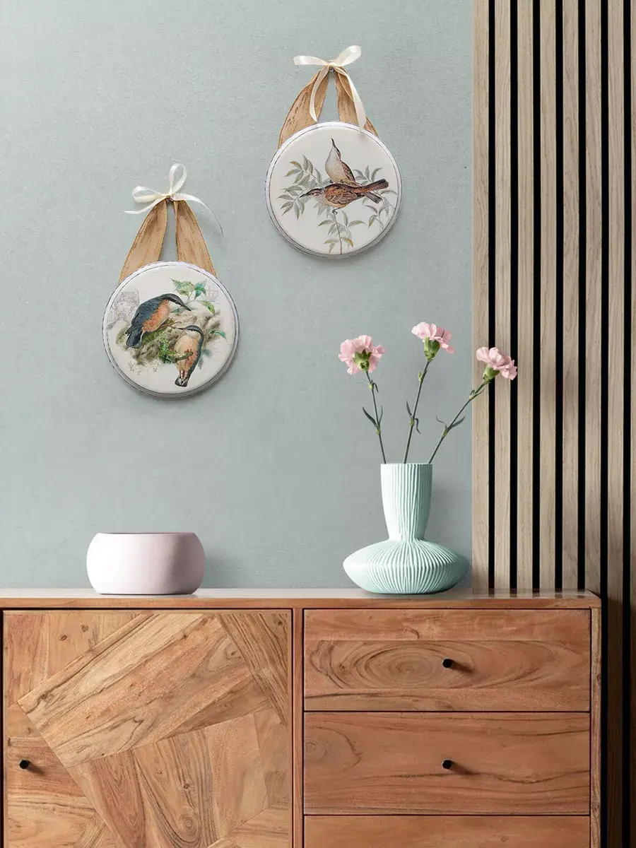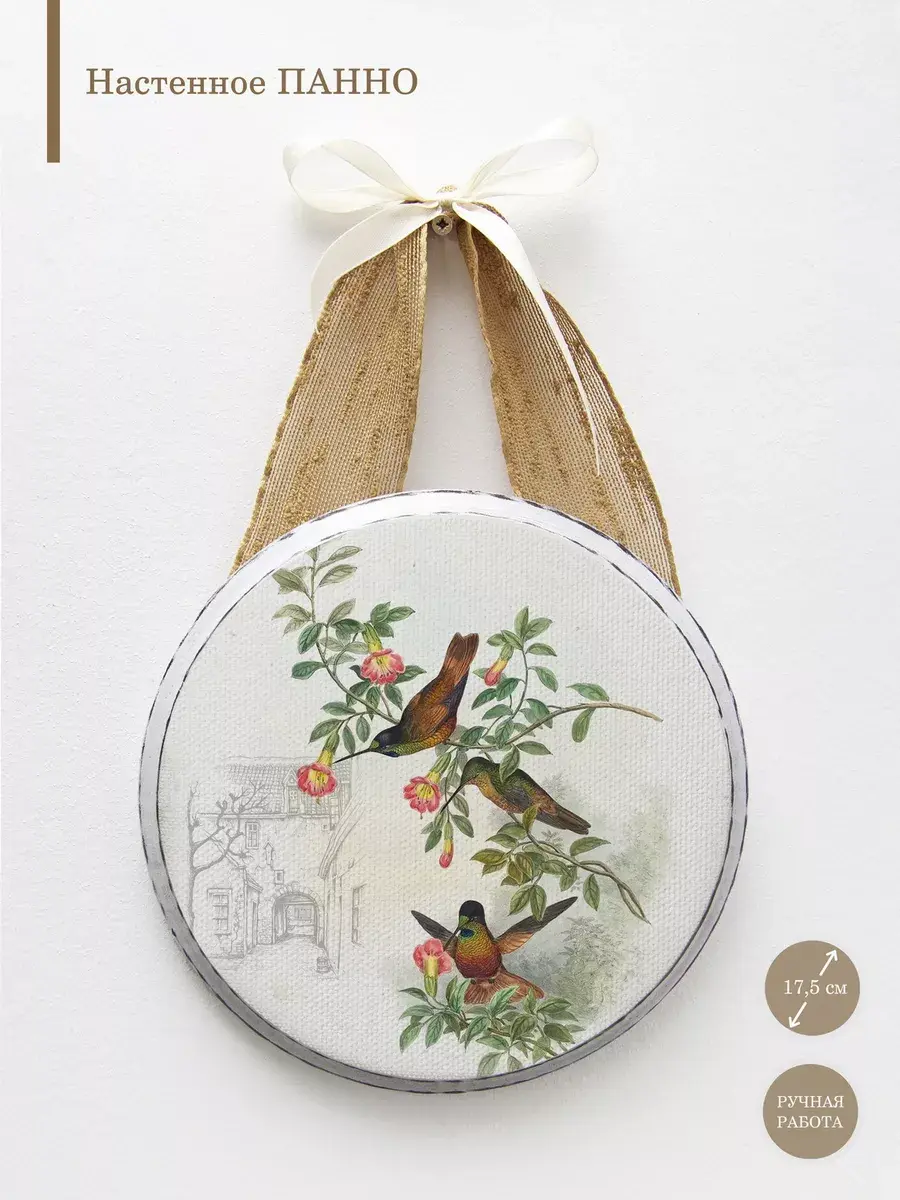 Соберите коллекцию настенных украшений с птицами и цветами. Декоративное настенное панно Elenadecor на холсте станет изысканным дополнением к любому интерьеру. Изготовленное из дерева, печать на натуральном холсте, панно придает пространству уют. Круглая форма панно привносит динамику в дизайн, а рисунок на холсте добавляет нотку оригинальности и стиля. Благодаря простому креплению на ленту, его легко повесить на стену, преобразив любой уголок вашего дома. Это декоративное панно станет прекрасным акцентом в гостиной, спальне или прихожей, создавая атмосферу уюта и гармонии. Деревянная основа придает изделию прочность и долговечность, делая его идеальным выбором для украшения вашего дома или в подарок. крепление для стены в комплекте.