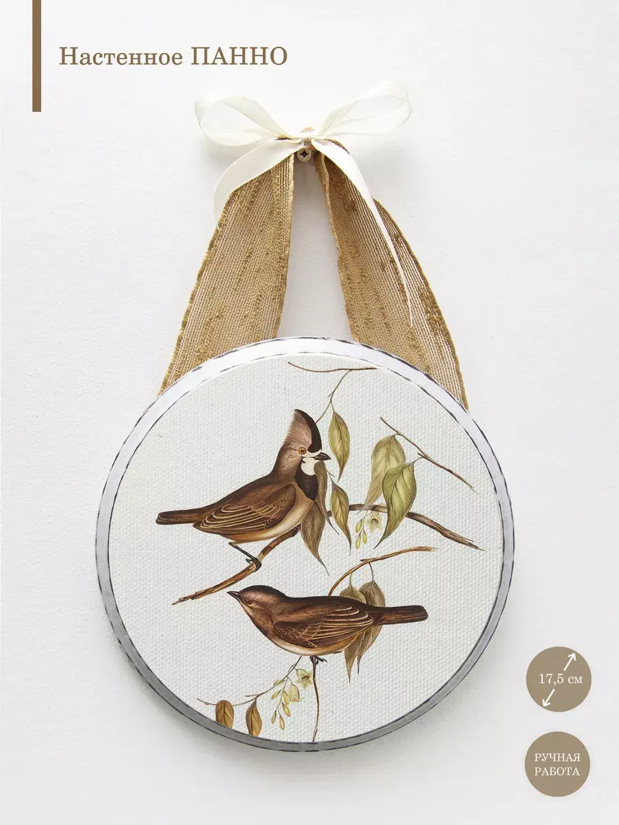 Соберите коллекцию настенных украшений с птицами и цветами. Декоративное настенное панно Elenadecor на холсте станет изысканным дополнением к любому интерьеру. Изготовленное из дерева, печать на натуральном холсте, панно придает пространству уют. Круглая форма панно привносит динамику в дизайн, а рисунок на холсте добавляет нотку оригинальности и стиля. Благодаря простому креплению на ленту, его легко повесить на стену, преобразив любой уголок вашего дома. Это декоративное панно станет прекрасным акцентом в гостиной, спальне или прихожей, создавая атмосферу уюта и гармонии. Деревянная основа придает изделию прочность и долговечность, делая его идеальным выбором для украшения вашего дома или в подарок. крепление для стены в комплекте.