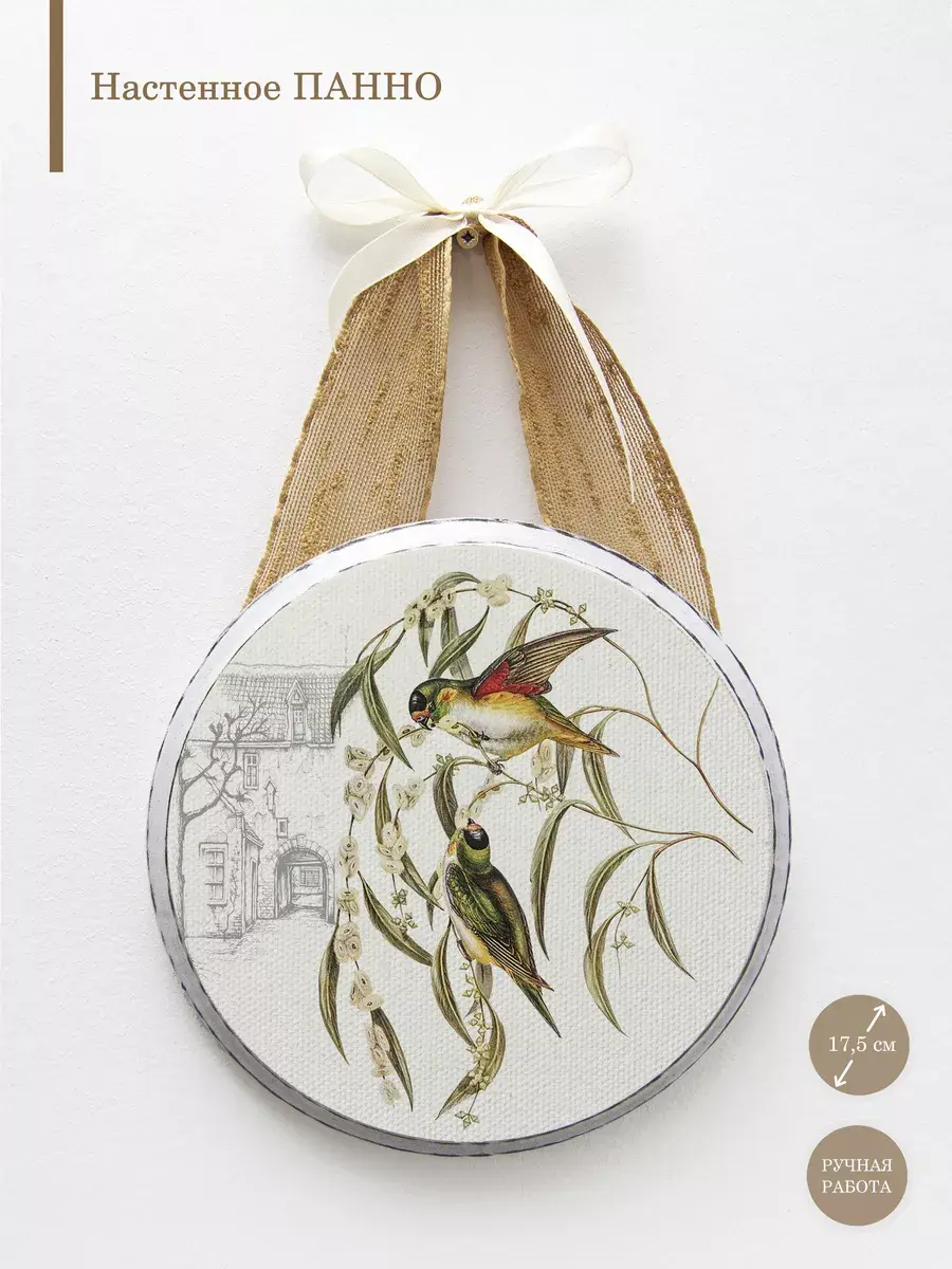 Соберите коллекцию настенных украшений с птицами и цветами. Декоративное настенное панно Elenadecor на холсте станет изысканным дополнением к любому интерьеру. Изготовленное из дерева, печать на натуральном холсте, панно придает пространству уют. Круглая форма панно привносит динамику в дизайн, а рисунок на холсте добавляет нотку оригинальности и стиля. Благодаря простому креплению на ленту, его легко повесить на стену, преобразив любой уголок вашего дома. Это декоративное панно станет прекрасным акцентом в гостиной, спальне или прихожей, создавая атмосферу уюта и гармонии. Деревянная основа придает изделию прочность и долговечность, делая его идеальным выбором для украшения вашего дома или в подарок. крепление для стены в комплекте.