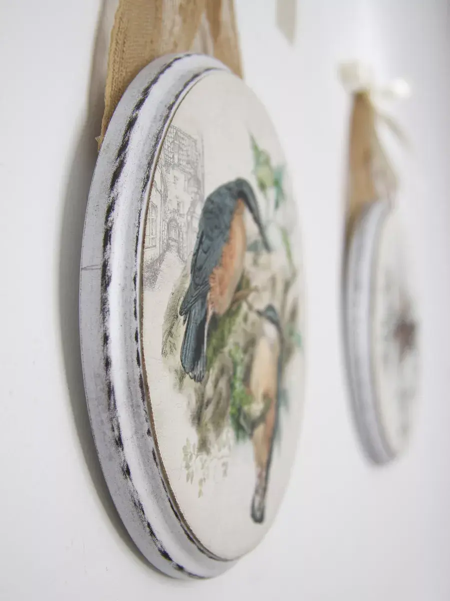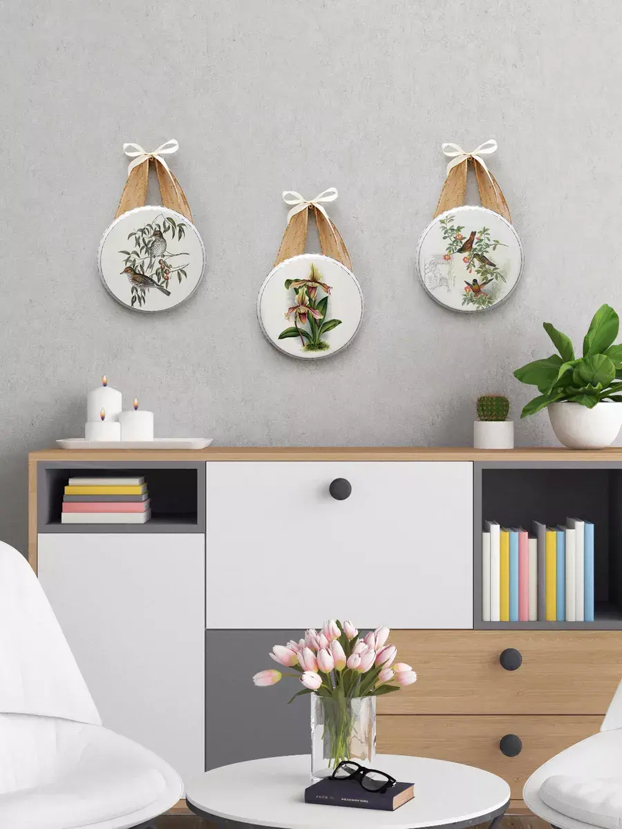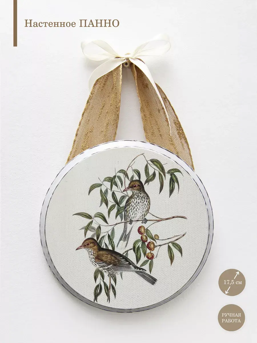 Соберите коллекцию настенных украшений с птицами и цветами. Декоративное настенное панно Elenadecor на холсте станет изысканным дополнением к любому интерьеру. Изготовленное из дерева, печать на натуральном холсте, панно придает пространству уют. Круглая форма панно привносит динамику в дизайн, а рисунок на холсте добавляет нотку оригинальности и стиля. Благодаря простому креплению на ленту, его легко повесить на стену, преобразив любой уголок вашего дома. Это декоративное панно станет прекрасным акцентом в гостиной, спальне или прихожей, создавая атмосферу уюта и гармонии. Деревянная основа придает изделию прочность и долговечность, делая его идеальным выбором для украшения вашего дома или в подарок. крепление для стены в комплекте.