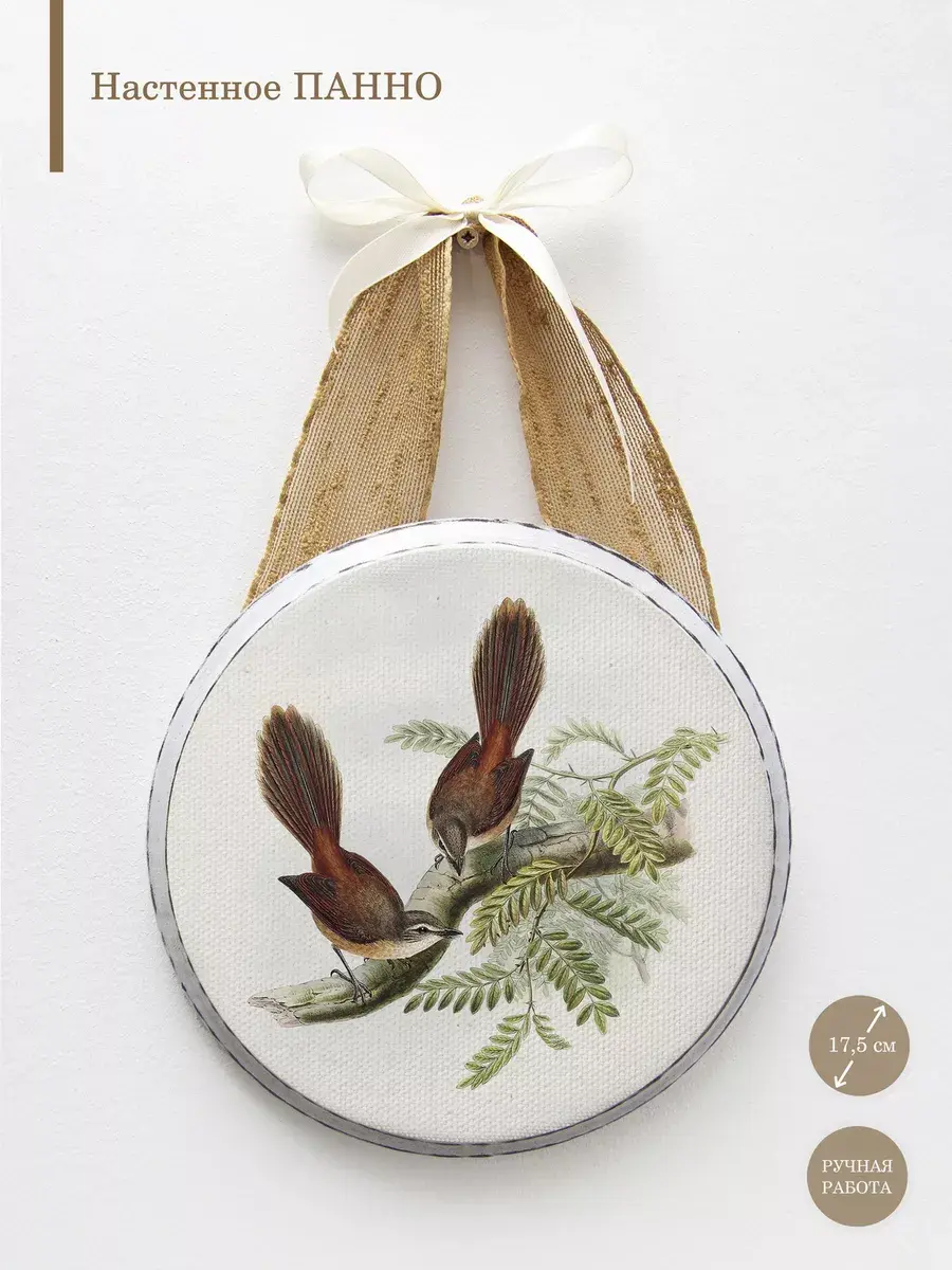 Соберите коллекцию настенных украшений с птицами и цветами. Декоративное настенное панно Elenadecor на холсте станет изысканным дополнением к любому интерьеру. Изготовленное из дерева, печать на натуральном холсте, панно придает пространству уют. Круглая форма панно привносит динамику в дизайн, а рисунок на холсте добавляет нотку оригинальности и стиля. Благодаря простому креплению на ленту, его легко повесить на стену, преобразив любой уголок вашего дома. Это декоративное панно станет прекрасным акцентом в гостиной, спальне или прихожей, создавая атмосферу уюта и гармонии. Деревянная основа придает изделию прочность и долговечность, делая его идеальным выбором для украшения вашего дома или в подарок. крепление для стены в комплекте.