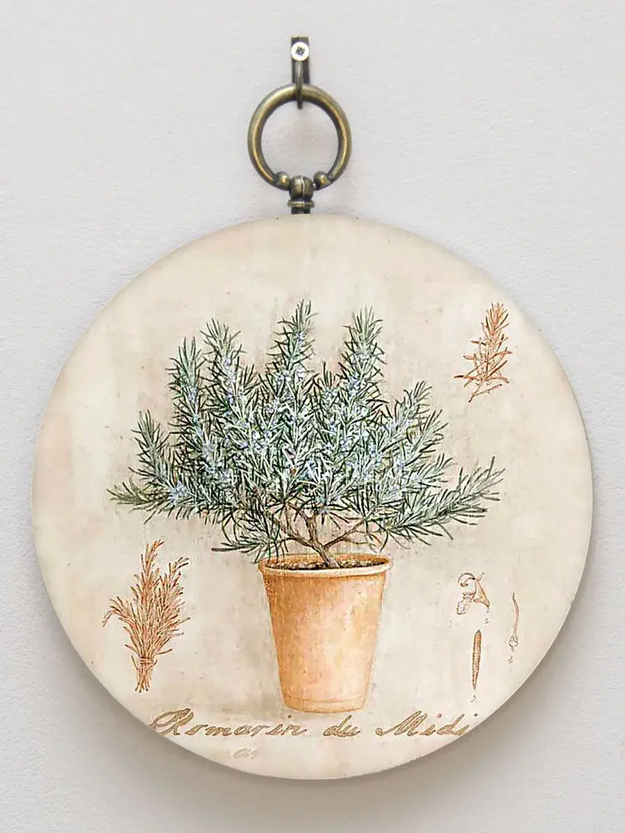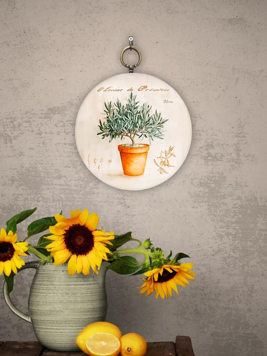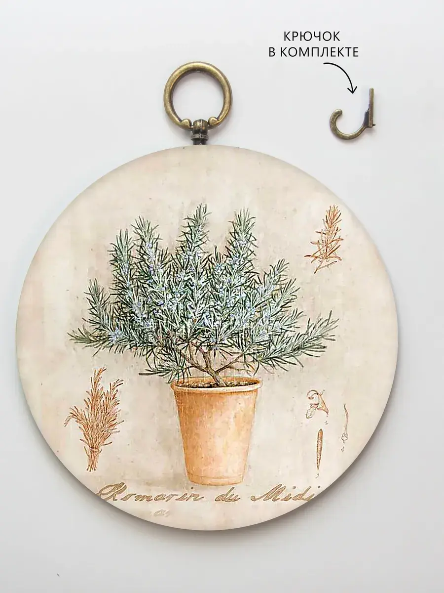Декоративное настенное панно с прованскими травами преобразит интерьер и добавит уют в ваш дом или дачу. Панно изготовлено из МДФ 10 мм, печать на фотобумаге, покрытие горячей ламинацией - декор можно протирать влажной тканью. Диаметр панно 18 см. Панно на металлическом крючке добавит изящества интерьеру кухни, спальни, прихожей, гостиной. Можно использовать как самостоятельный элемент декора, так и в сочетании с другими панно серии "Прованс" от бренда Elenadecor. Торец панно окрашен в мятный цвет.