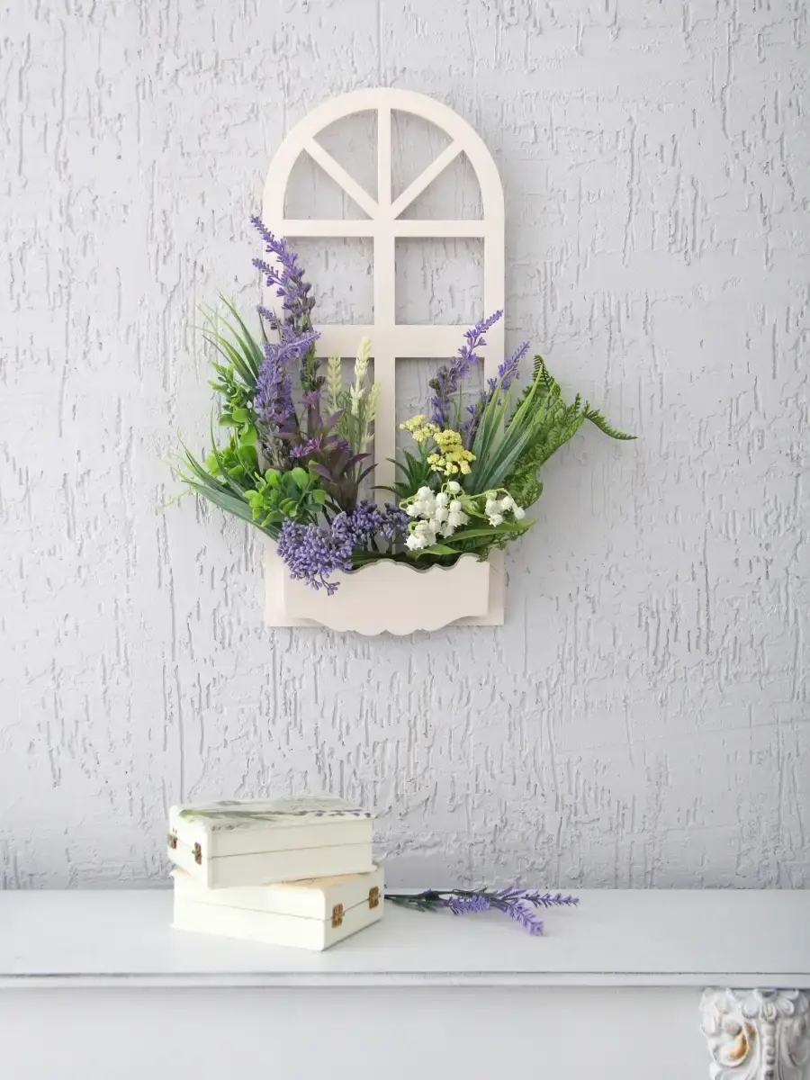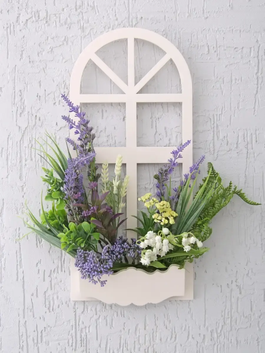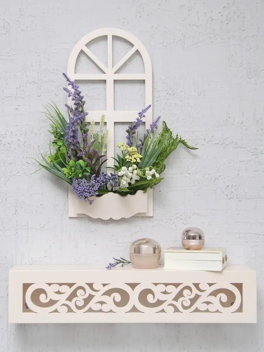 Украшение настенное для интерьера с искусственными интерьерными цветами . Композиция настенная в деревянном кашпо-окно с цветами, ВНИМАНИЕ! Размеры фальш-окна композиций отличаются (18х40см или 38х21см) Размер конкретной модели указан в карусели фотографий. Крепление на зубчатый крепеж , саморез для стены в комплекте. Отличное украшение к зеркалу, в прихожей, ванной или для кухни, где живым цветам недостаточно света. Всегда будут радовать и добавлять уюта в дом. Прекрасный подарок для дома, дачи или салона красоты. По желанию самостоятельно можно дополнить светодиодными нитями (светодиодной гирляндой). Уход : обдуть феном, протирать влажной тканью , обработать антистатиком..