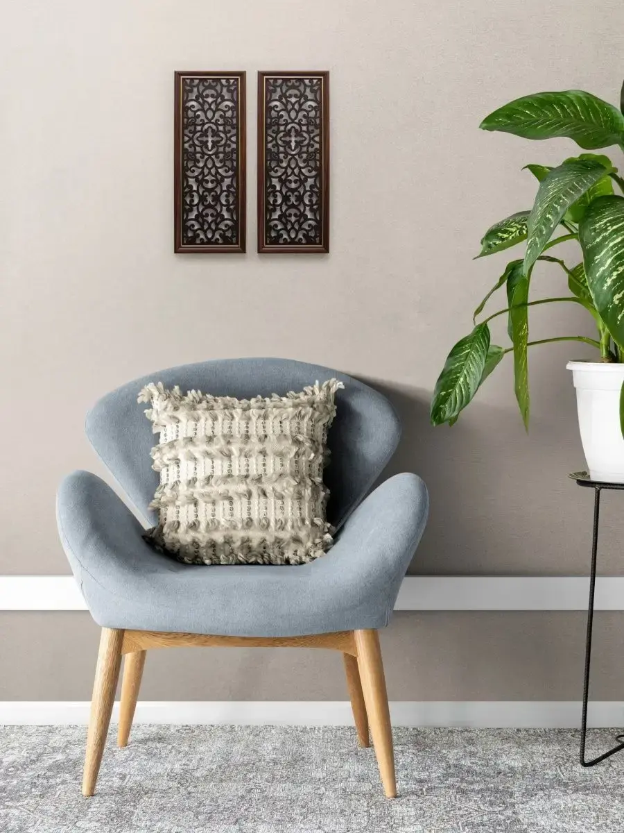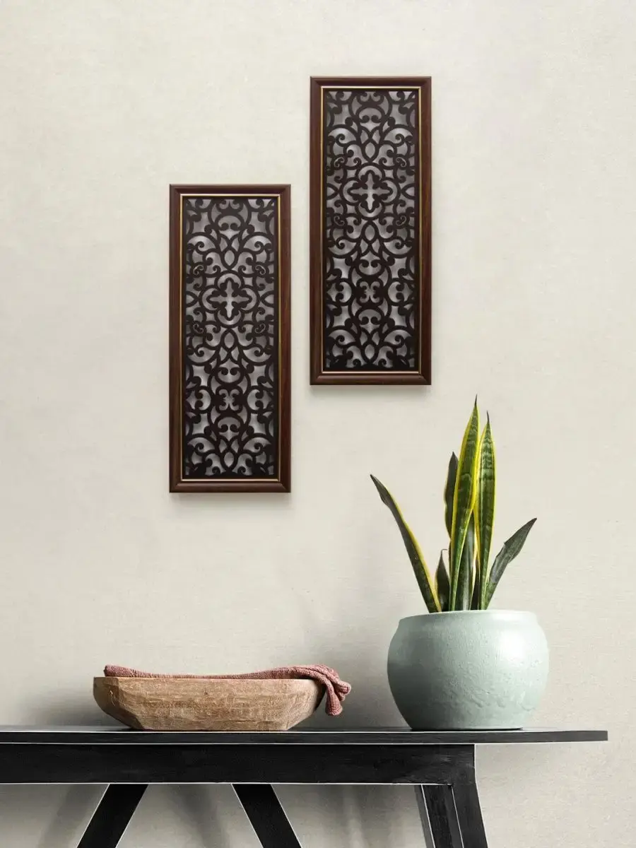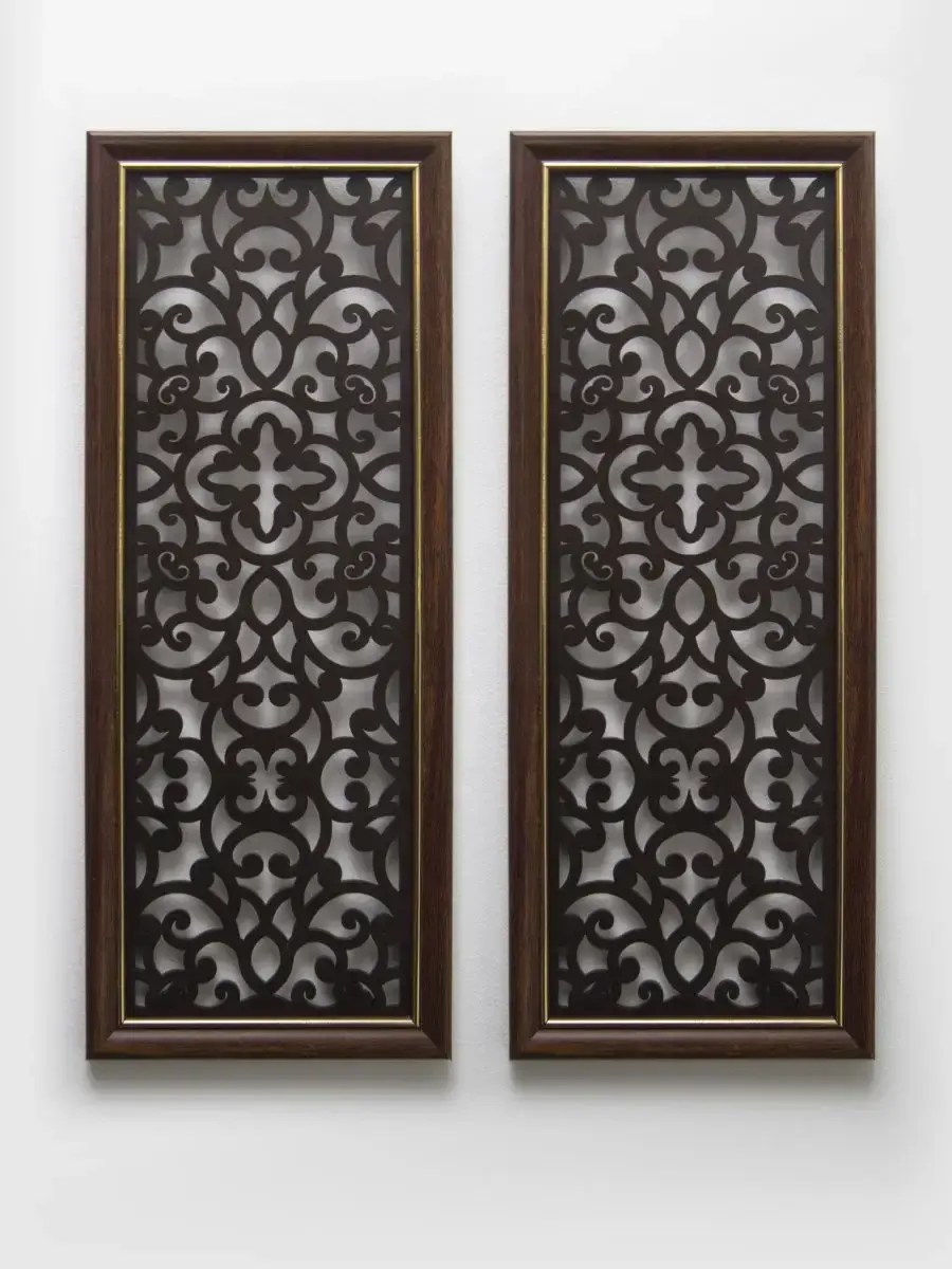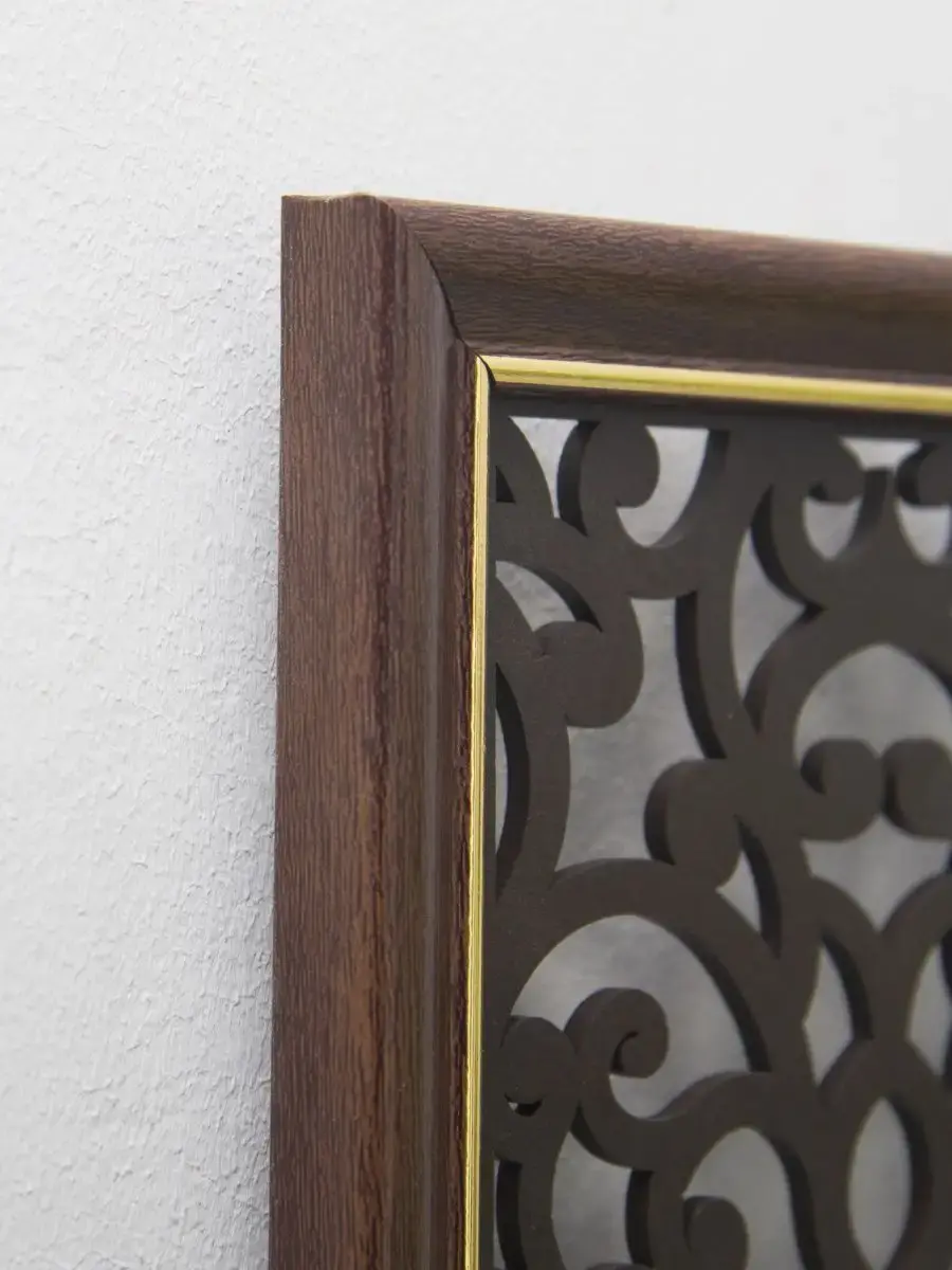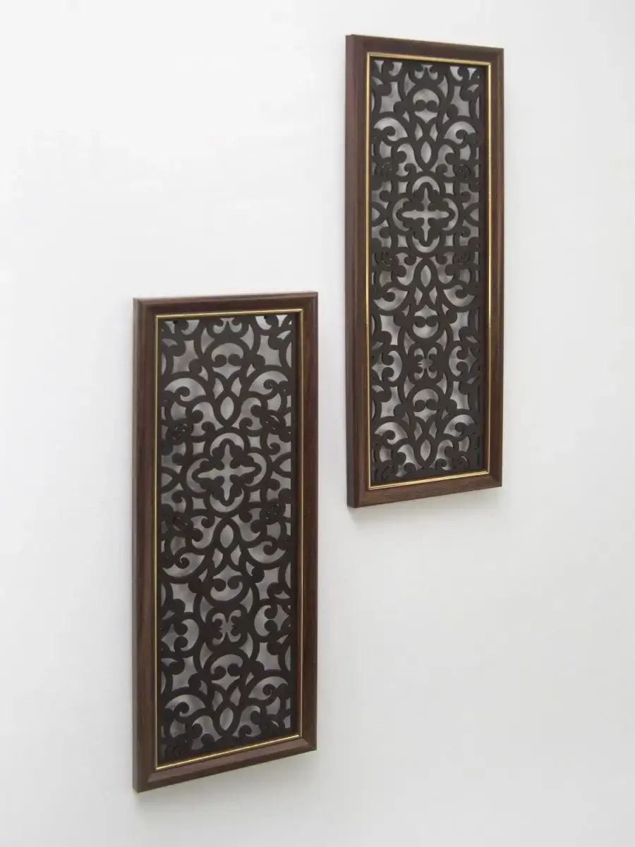 Декоративные резные настенные панно "Узоры" комплект из 2х штук. Декор на стену изготовлен из высококачественной березовой фанеры 4мм, окрашены акриловой эмалью. Настенные деревянные панно, стильный декор для комнаты в современном стиле. Деревянные резные панно оформлены в лаконичную багетную раму из полиуретана. Декор для украшения интерьера дома и дачи. Декорация на стену спальни, прихожей, украшение для кухни и ванной комнаты. Панно легкие и изящные, преобразят интерьер комнат. Размер одного панно 16х39 см. Декорацию можно разместить по горизонтале или вертикале. Декор для дома можно комбинировать с квадратным панно, создавая композицию. С обратной стороны зубчатый крепеж, крепление для стены в комплекте.