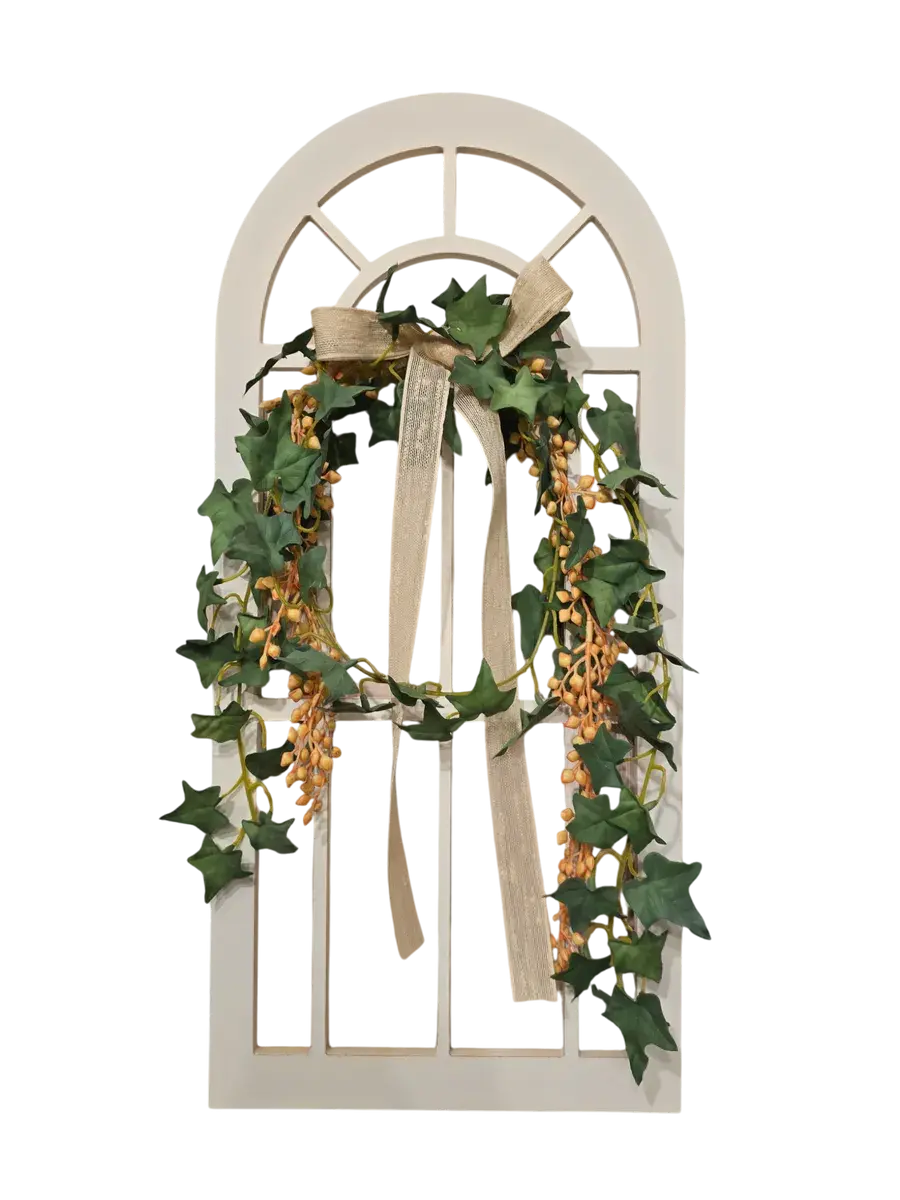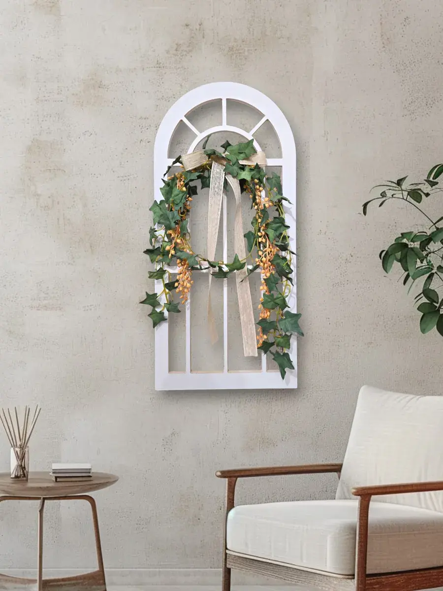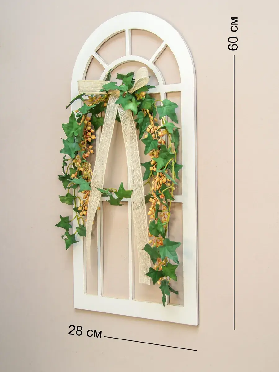 Украшение настенное для интерьера с искусственными интерьерными цветами . Композиция настенная с деревянным окошком с цветами, размер окна 28*60 см. Окраска в один слой акриловой краской с эффектом старения.