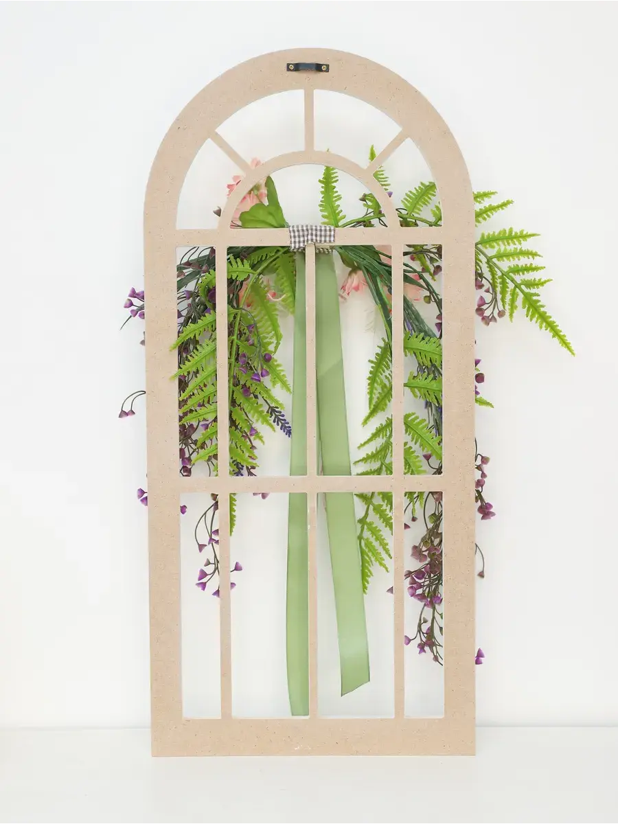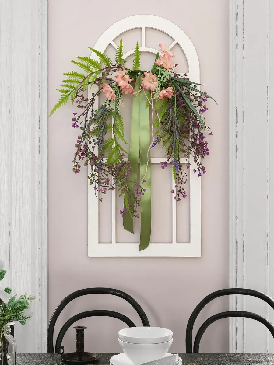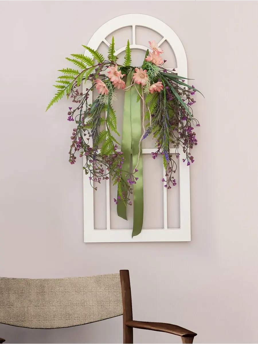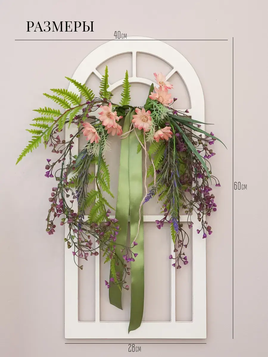 Украшение настенное для интерьера с искусственными интерьерными цветами . Композиция настенная с деревянным окошком с цветами, размер окна 28*60 см. Окраска в один слой акриловой краской с эффектом старения.