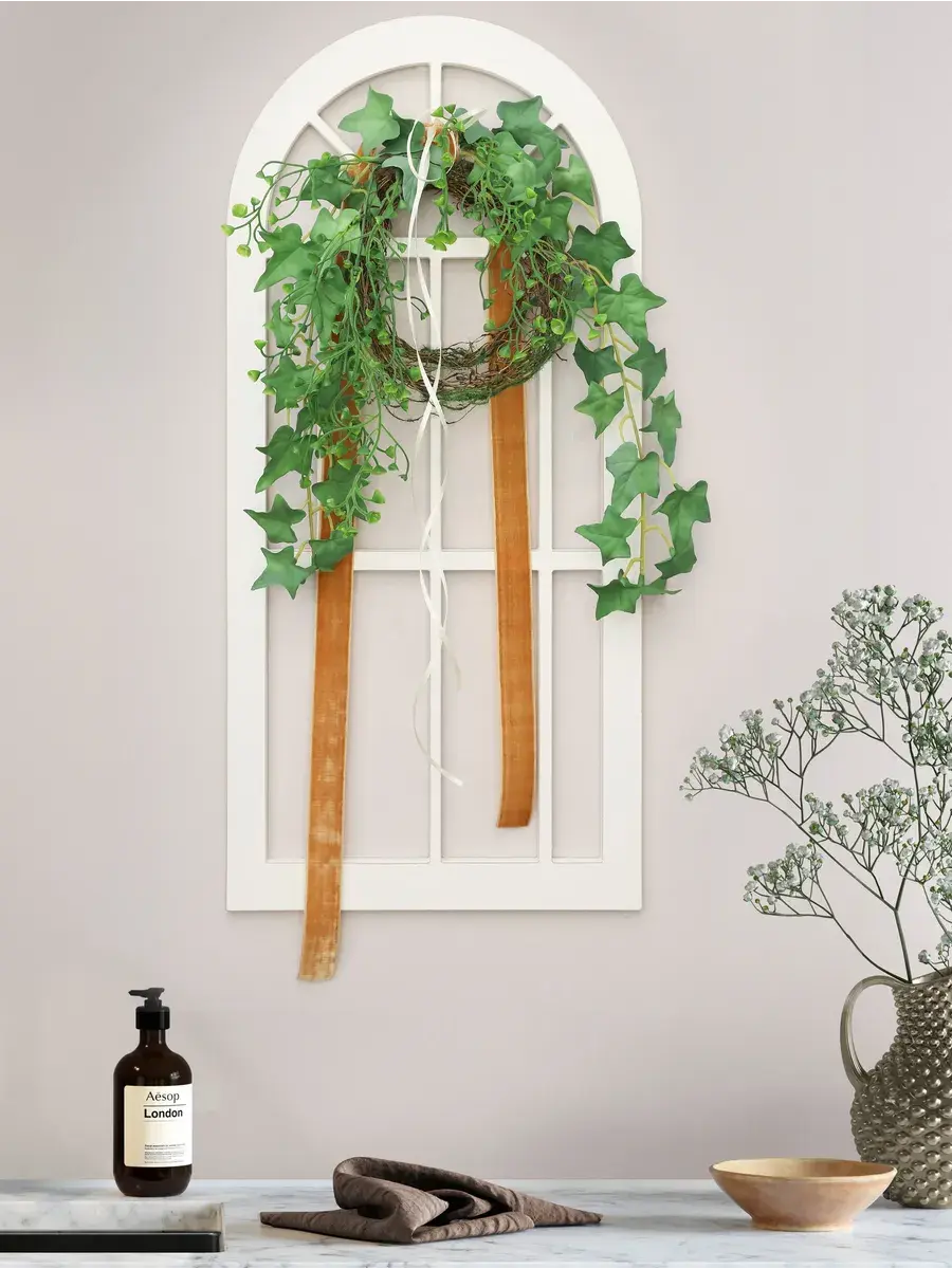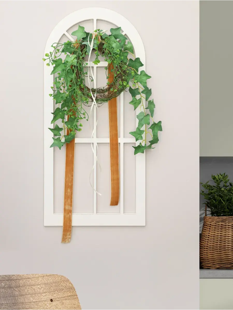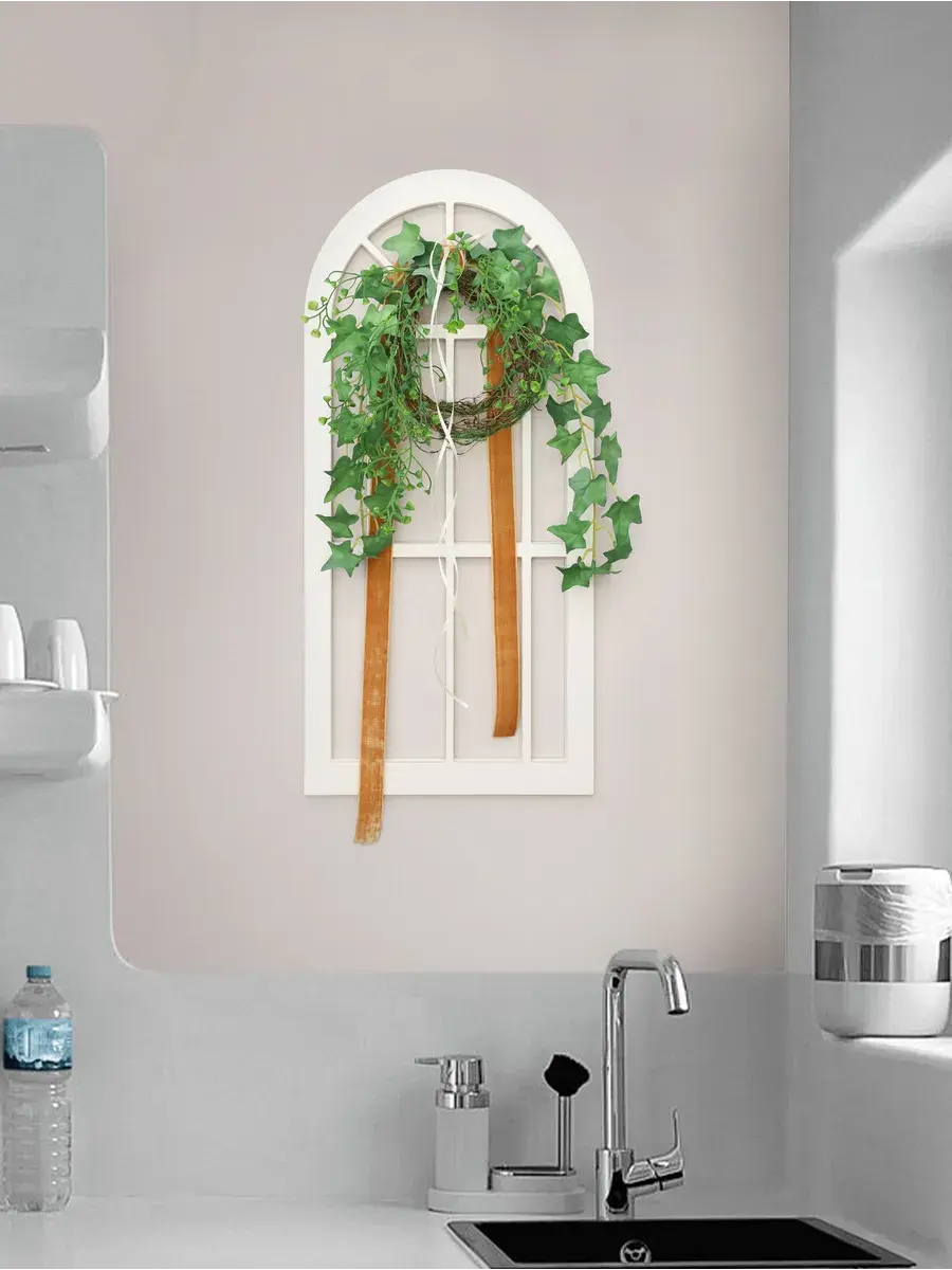 Украшение настенное для интерьера с искусственными интерьерными цветами . Композиция настенная с деревянным окошком с цветами, размер окна 28*60 см. Окраска в один слой акриловой краской с эффектом старения.