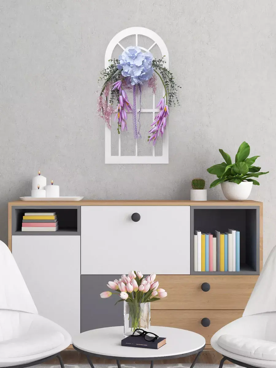 Украшение настенное для интерьера с искусственными интерьерными цветами . Композиция настенная с деревянным окошком с цветами, размер окна 28*60 см. Окраска в один слой акриловой краской с эффектом старения.