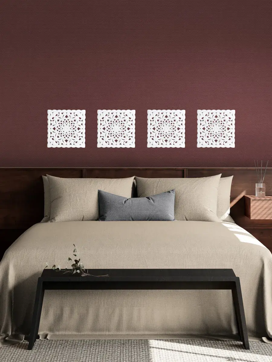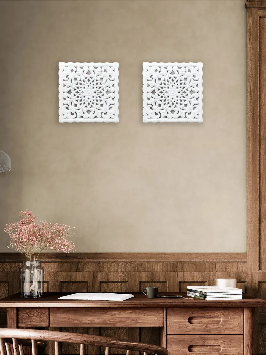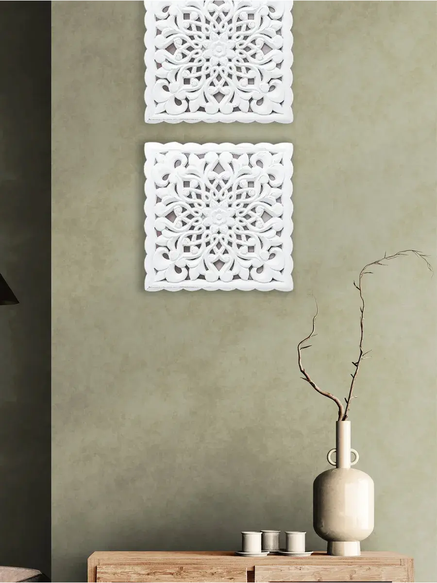 Настенное резное панно 30*30 см. Из нескольких панно можно собрать большую композицию. Объемный орнамент окрашен с эффектом старения, что придает ему особый шарм (при желании можно легко перекрасить в любой цвет под Ваш интерьер). Резное настенное панно станет прекрасным украшением стены над изголовьем кровати или большой стены в гостиной. Если комбинировать несколько панно - можно получить удивительную композицию, которая будет притягивать взгляды. Декор для комнаты на стену добавит нотку элегантности и изысканности в гостиной или спальной, в прихожей или на террасе. Панно будет хорошо смотреться как самостоятельный декор, так и в сочетании с другими элементами декора коллекции "Флоренция". Крепление для стены в комплекте.