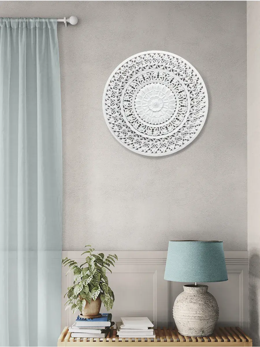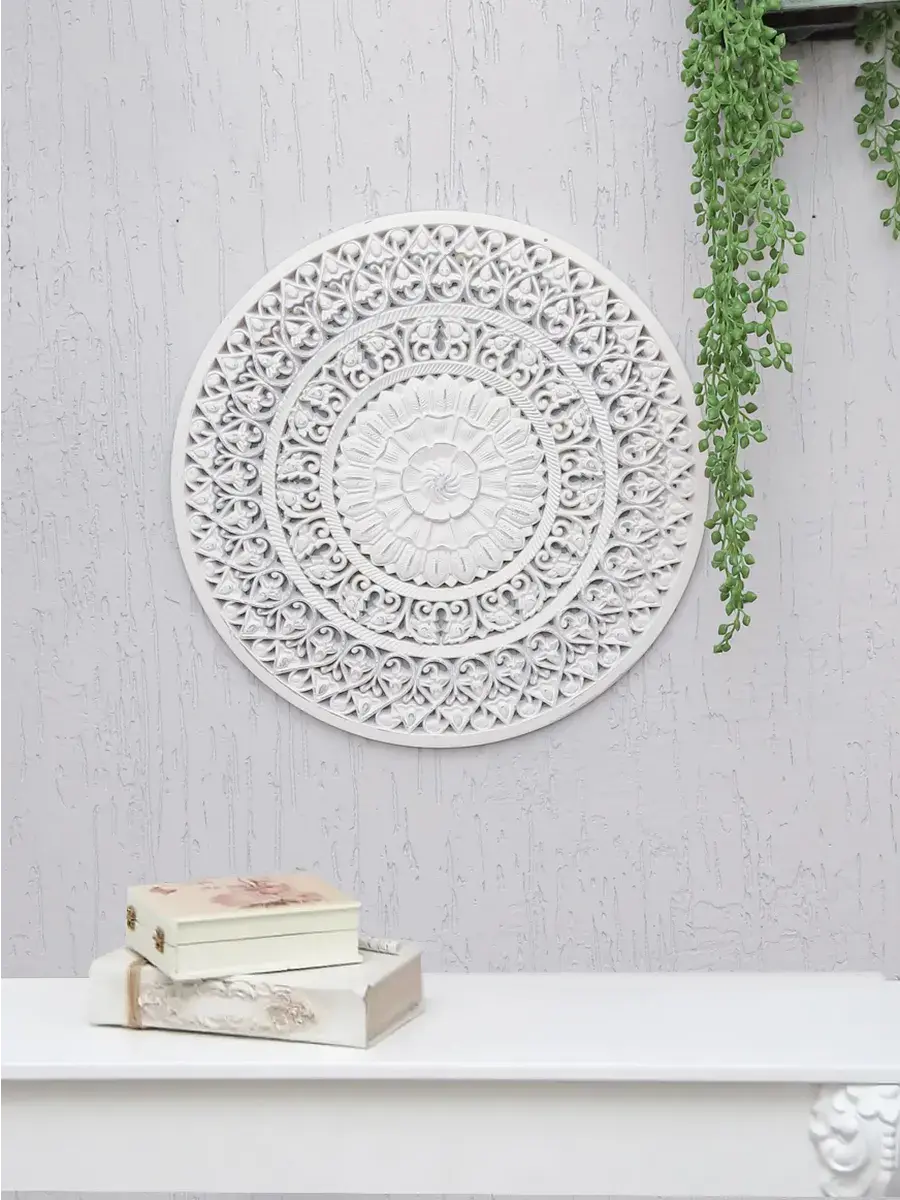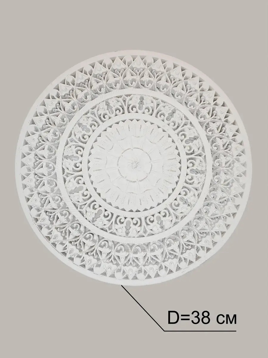 Настенное резное панно диаметром 38 см. Из нескольких панно можно собрать большую композицию. Объемный орнамент окрашен с эффектом старения, что придает ему особый шарм (при желании можно легко перекрасить в любой цвет под Ваш интерьер. Настенный декор станет прекрасным украшением над изголовьем кровати или большой стены в гостиной. Если комбинировать несколько панно - можно получить удивительную композицию, которая будет притягивать взгляды. Декор для комнаты на стену добавит нотку элегантности и изысканности в гостиной или спальной, в прихожей или на террасе. Панно будет хорошо смотреться как самостоятельный декор, так и в сочетании с другими элементами декора коллекции "Флоренция". Крепление для стены в комплекте.