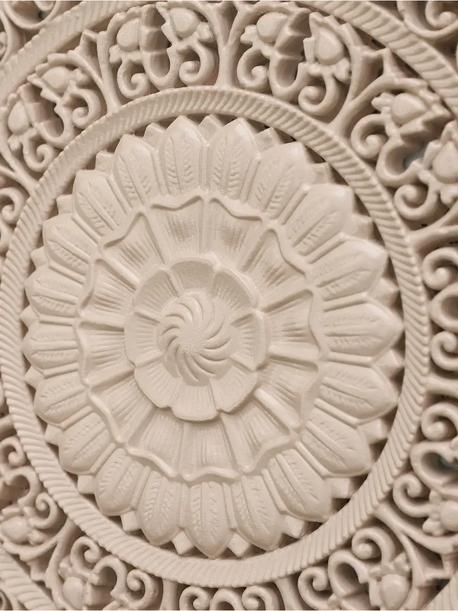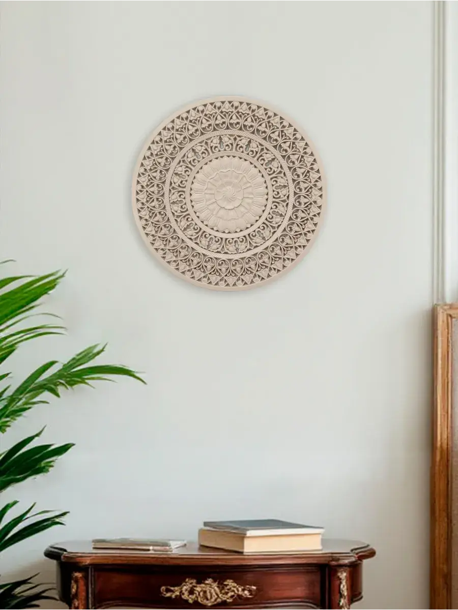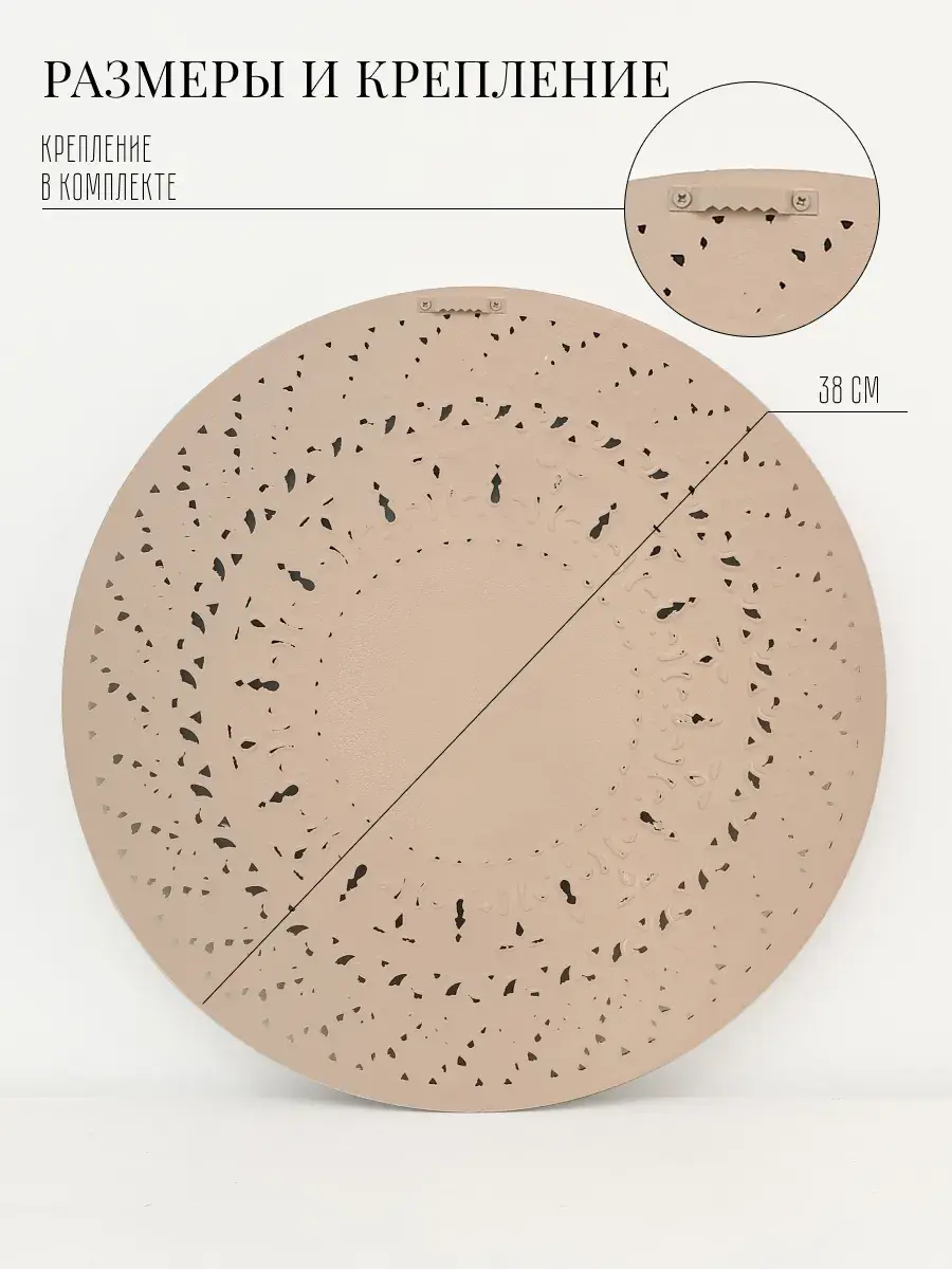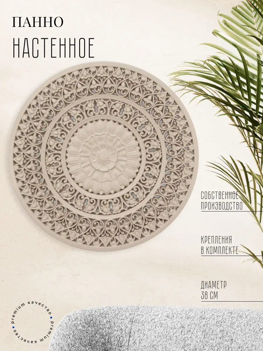 Настенное резное панно диаметром 38 см. Из нескольких панно можно собрать большую композицию. Объемный орнамент окрашен бежевой акриловой эмалью, что придает ему особый шарм (при желании можно легко перекрасить в любой цвет под Ваш интерьер). Резное настенное панно станет прекрасным украшением стены над изголовьем кровати или большой стены в гостиной. Если комбинировать несколько панно - можно получить удивительную композицию, которая будет притягивать взгляды. Декор для комнаты на стену добавит нотку элегантности и изысканности в гостиной или спальной, в прихожей или на террасе. Панно будет хорошо смотреться как самостоятельный декор, так и в сочетании с другими элементами декора коллекции "Флоренция". Крепление для стены в комплекте.