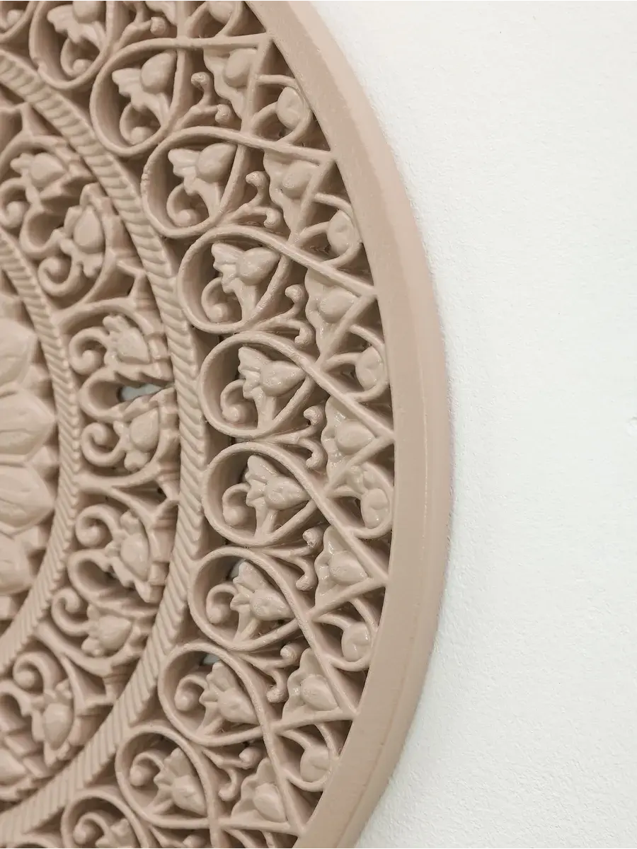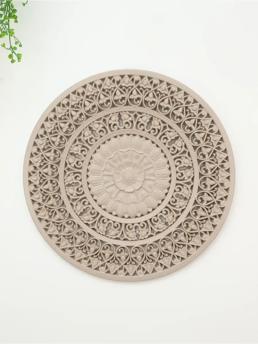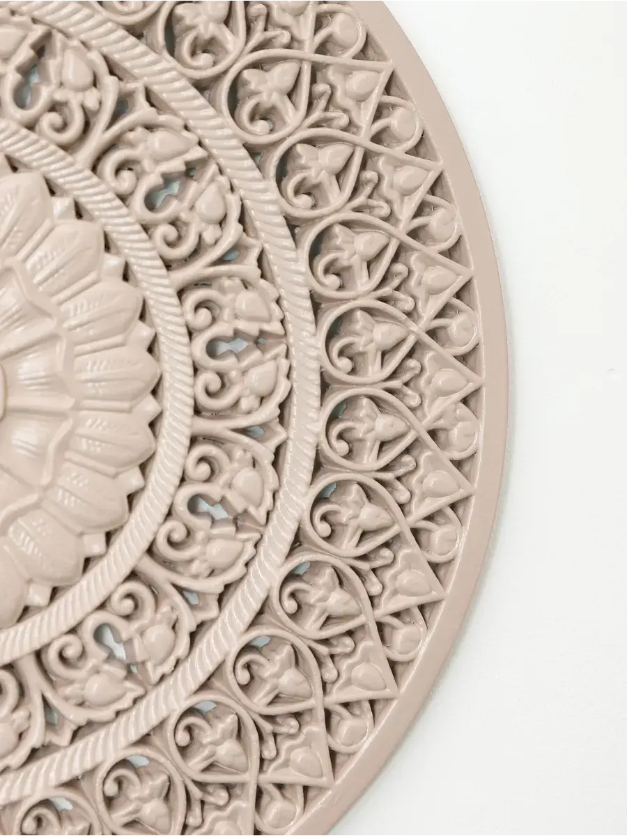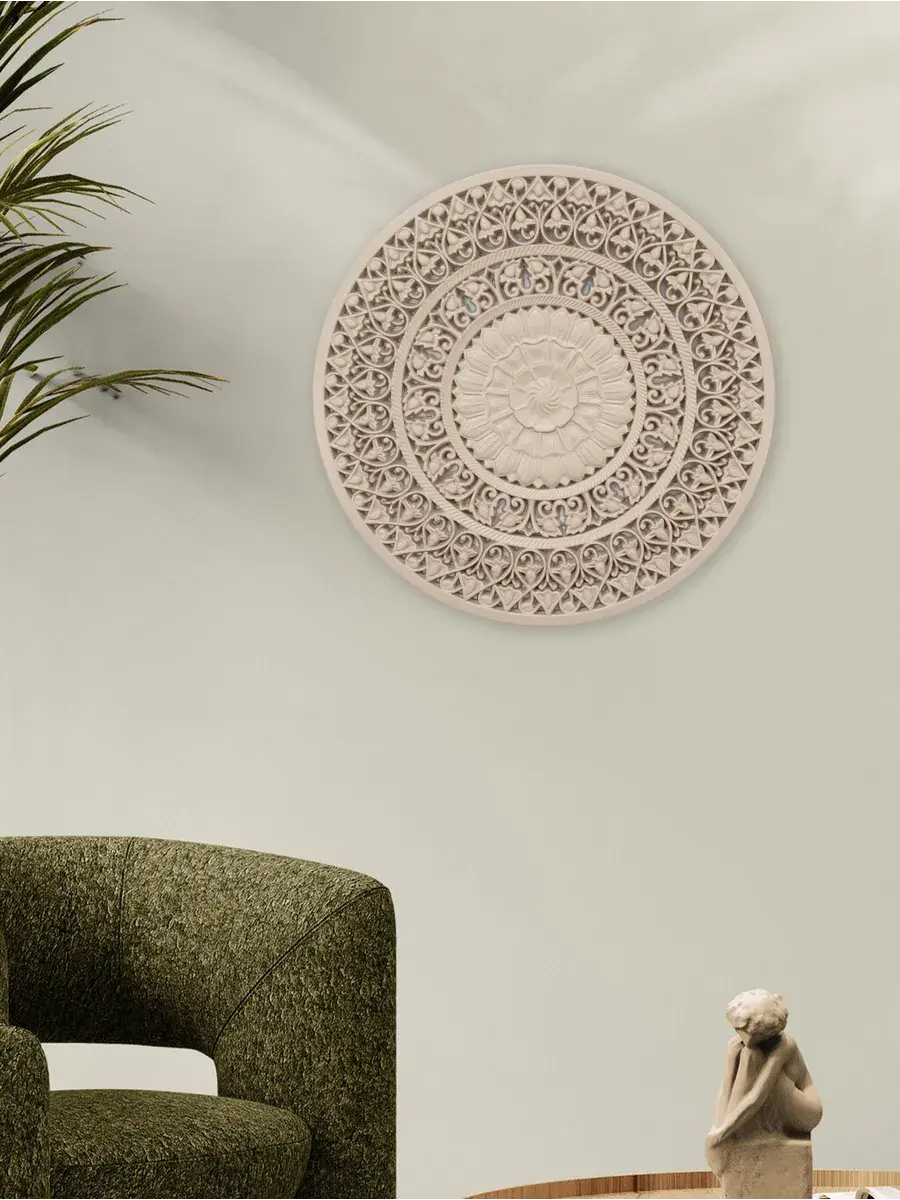 Настенное резное панно диаметром 38 см. Из нескольких панно можно собрать большую композицию. Объемный орнамент окрашен бежевой акриловой эмалью, что придает ему особый шарм (при желании можно легко перекрасить в любой цвет под Ваш интерьер). Резное настенное панно станет прекрасным украшением стены над изголовьем кровати или большой стены в гостиной. Если комбинировать несколько панно - можно получить удивительную композицию, которая будет притягивать взгляды. Декор для комнаты на стену добавит нотку элегантности и изысканности в гостиной или спальной, в прихожей или на террасе. Панно будет хорошо смотреться как самостоятельный декор, так и в сочетании с другими элементами декора коллекции "Флоренция". Крепление для стены в комплекте.
