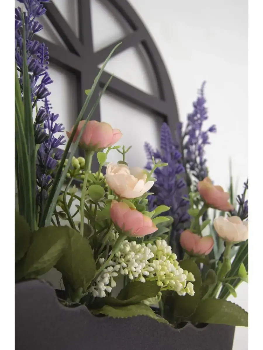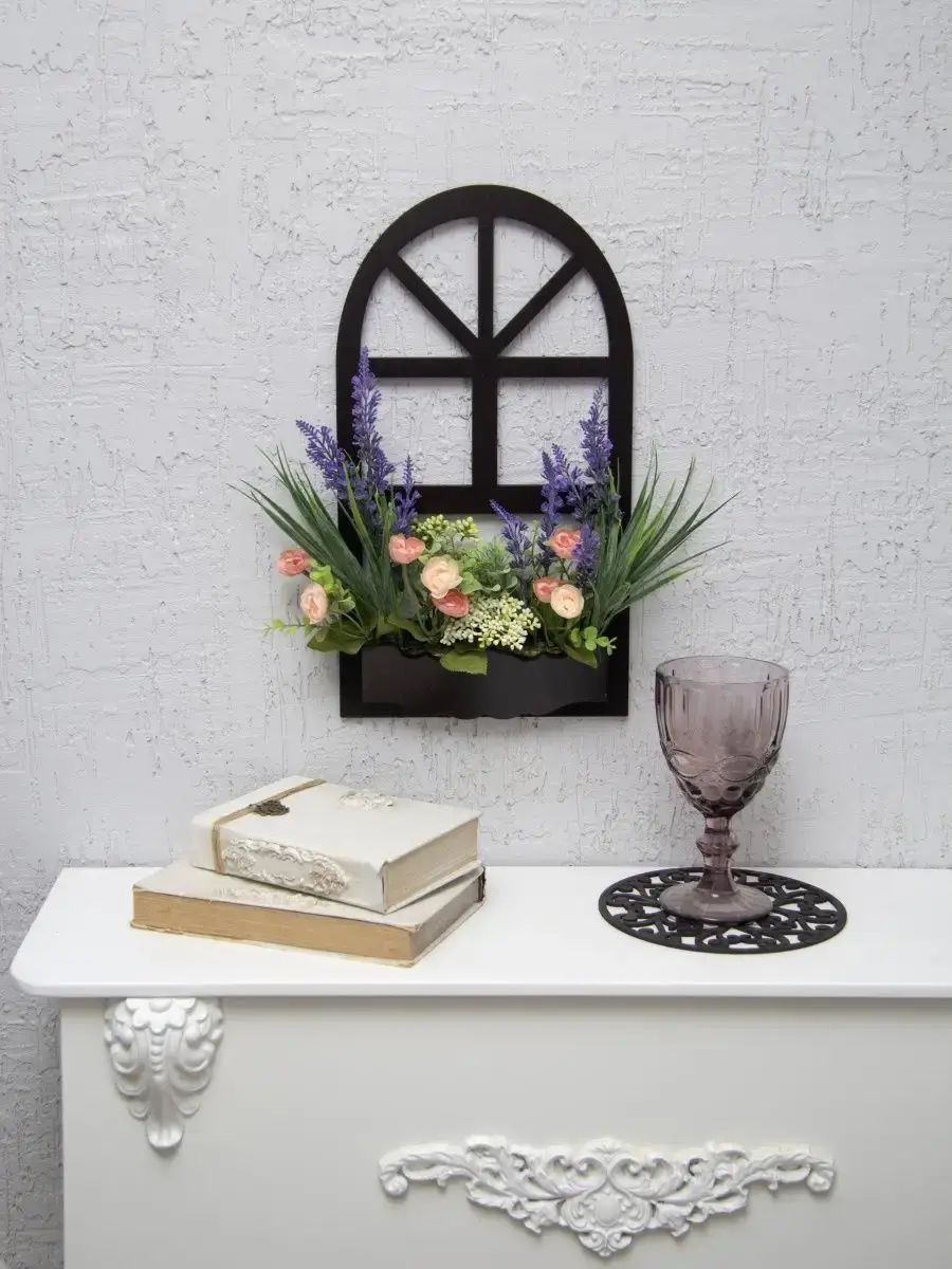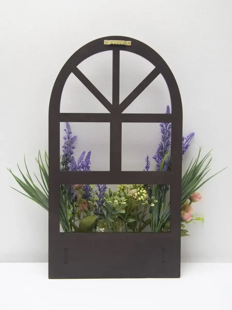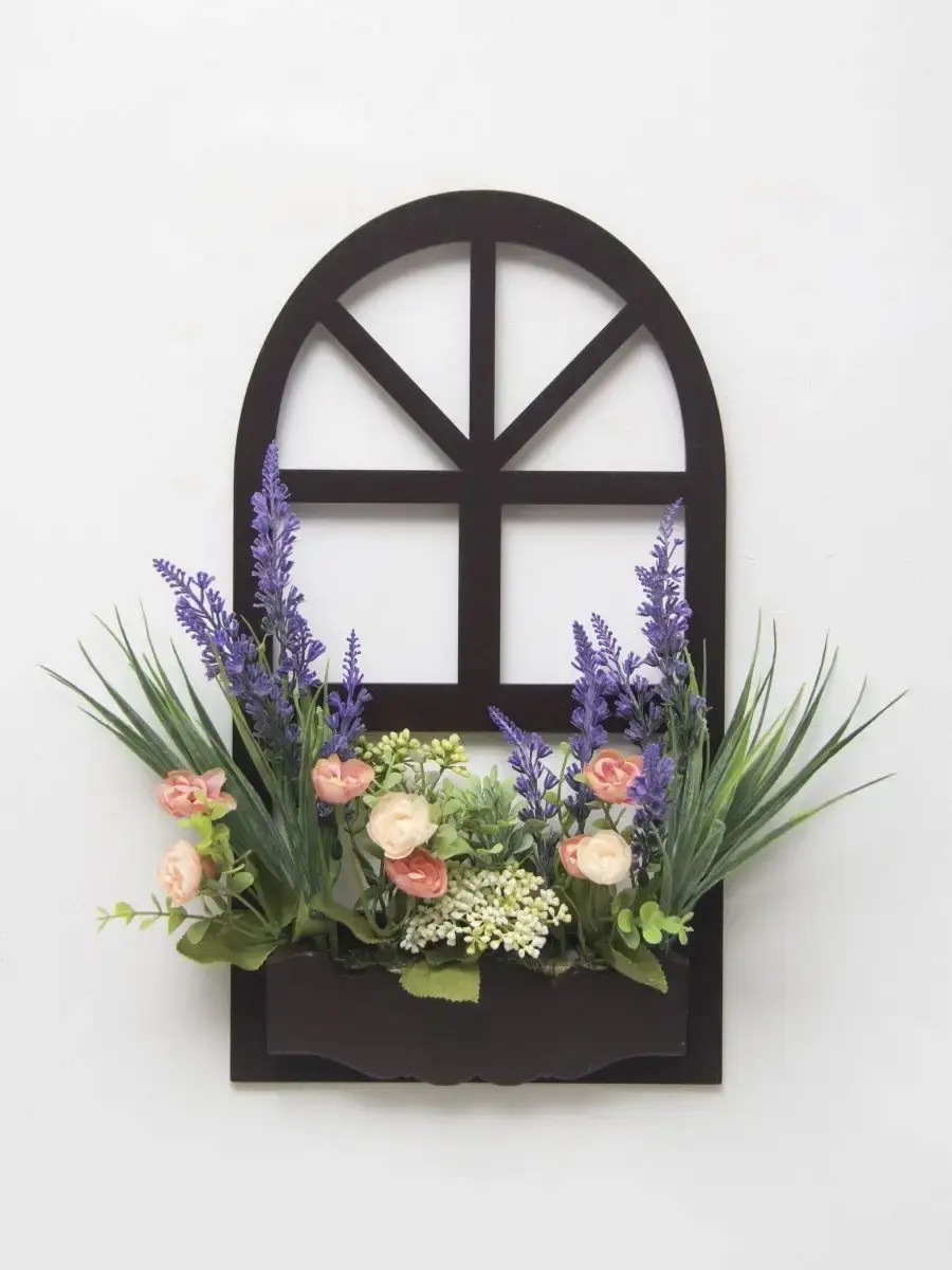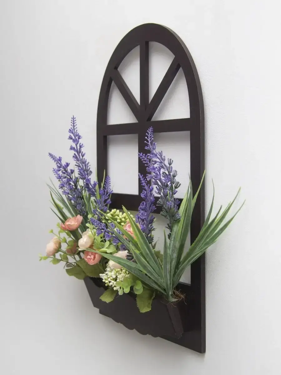 Украшение настенное для интерьера с искусственными интерьерными цветами. Композиции из папоротников, лаванды, ромашек, колокольчиков. Панно декоративное в виде окна с цветами. Цветы надежно закреплены в деревянном кашпо-окно, размер окна 38х21 см. Крепление на зубчатый крепеж , саморез для стены в комплекте. Отличное украшение к зеркалу, в прихожей, ванной или для кухни, где живым цветам недостаточно света. Всегда будут радовать и добавлять уюта в дом. По желанию самостоятельно можно дополнить светодиодными нитями (светодиодной гирляндой). Уход : обдуть феном, протирать влажной тканью , обработать антистатиком.