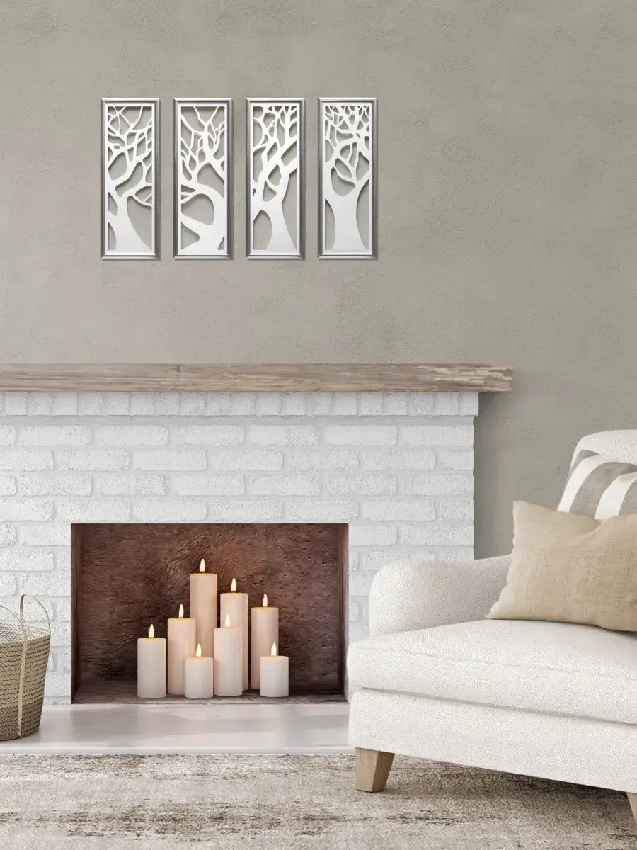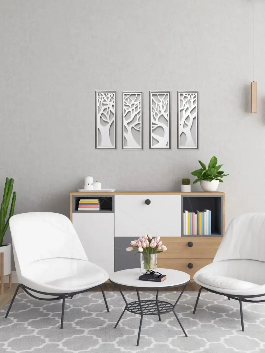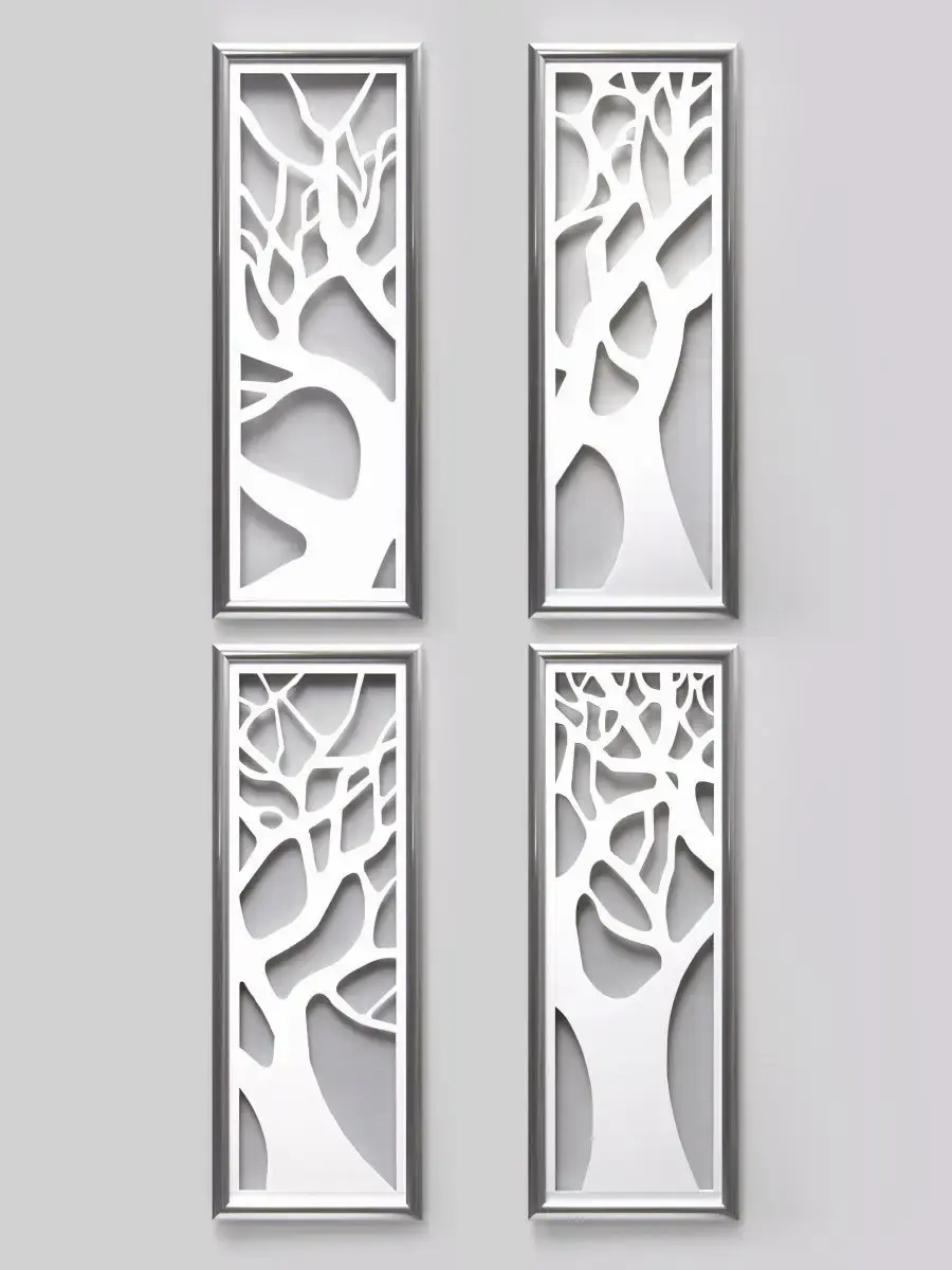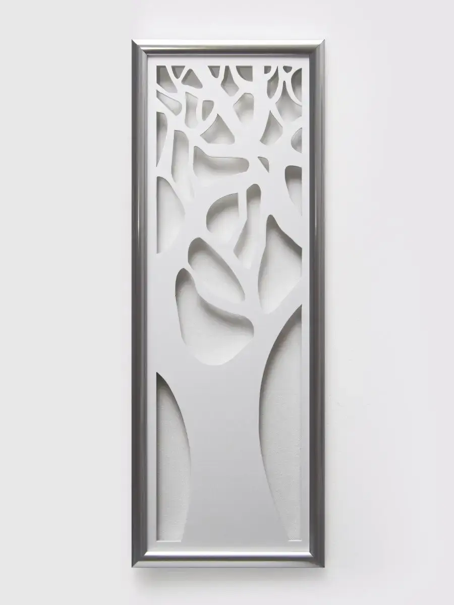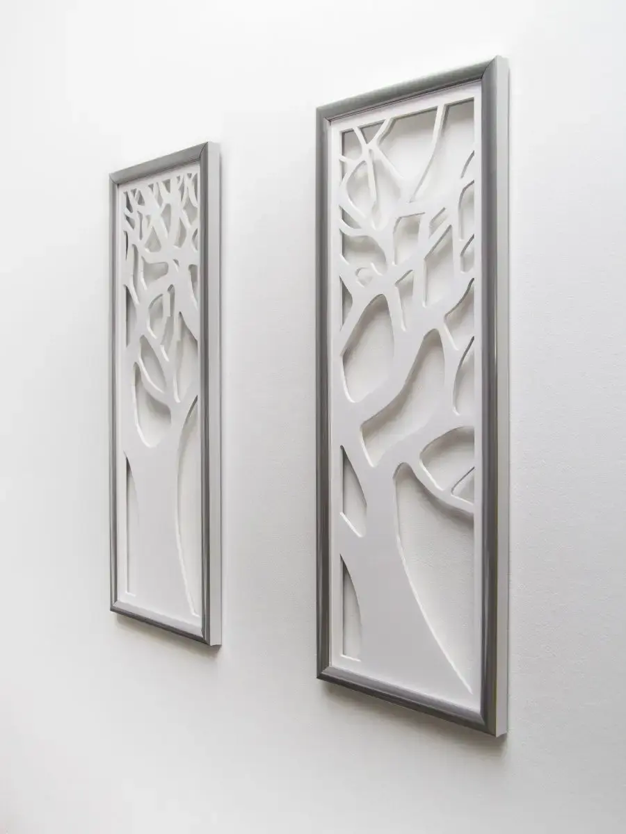 Декоративные резные настенные панно "Сказочный лес". Декор на стену изготовлен из высококачественной березовой фанеры, окрашены акриловым лаком. Настенные деревянные панно "Сказочный лес", декор для комнаты в современном стиле. Деревянные резные деревья оформлены в лаконичную багетную раму. Декор для интерьера дома и дачи. Декорация на стену спальни, прихожей, украшение для кухни и ванной комнаты. Деревянные панно легкие и изящные, преобразят интерьер комнат. Размер одного панно 18*48 см, вся настенная декорация размером ширина 90 см х высота 48см.. С обратной стороны зубчатый крепеж, крепление для стены в комплекте.