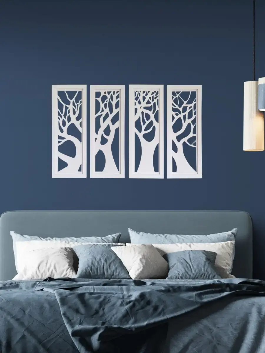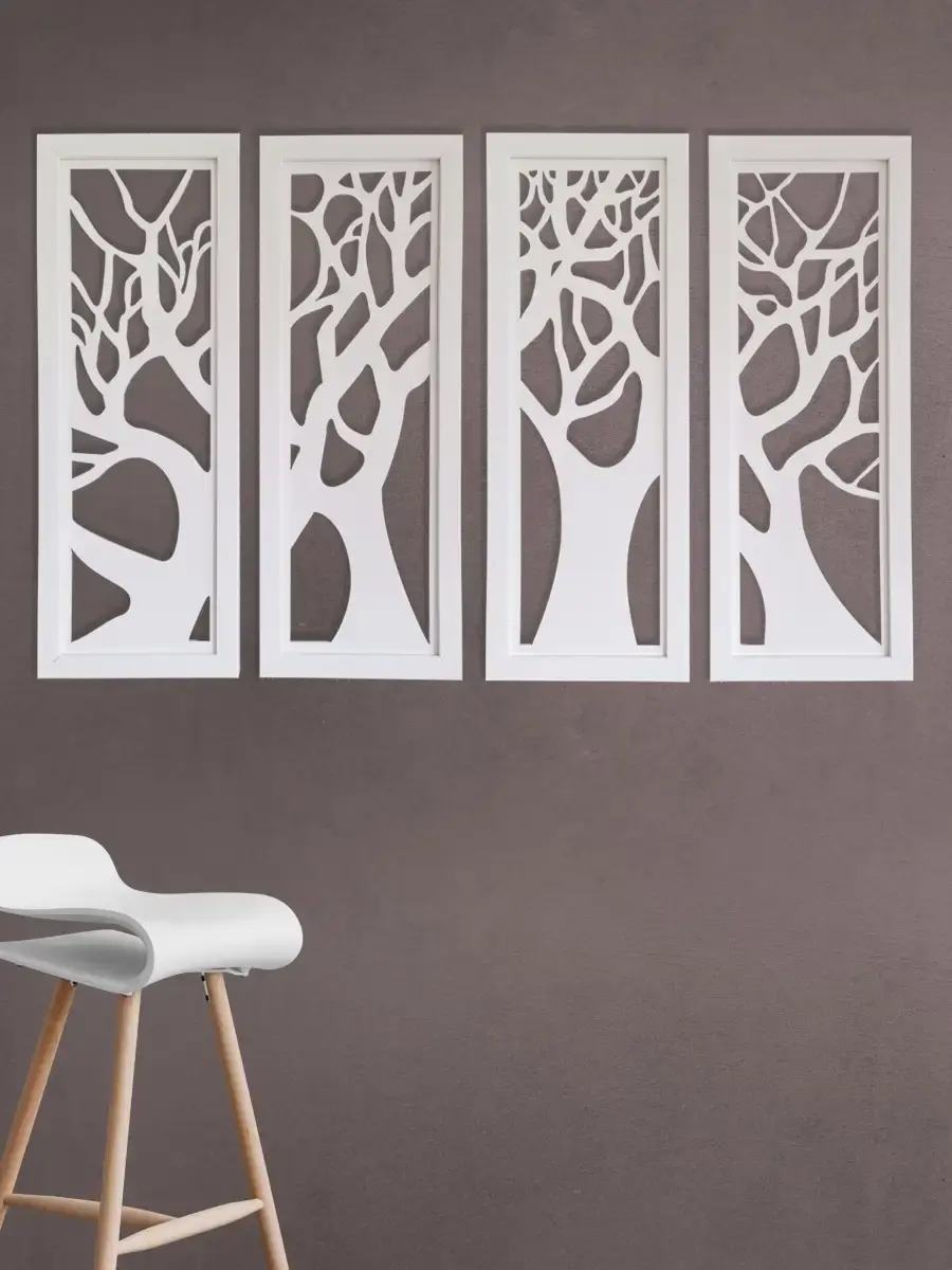 Декоративные резные настенные панно "Сказочный лес". Декор на стену изготовлен из высококачественной березовой фанеры, окрашены акриловым лаком. Настенные деревянные панно "Сказочный лес", декор для комнаты в современном стиле. Деревянные резные деревья оформлены в лаконичную багетную раму. Декор для интерьера дома и дачи. Декорация на стену спальни, прихожей, украшение для кухни и ванной комнаты. Деревянные панно легкие и изящные, преобразят интерьер комнат. Размер одного панно 18*48 см, вся настенная декорация размером ширина 90 см х высота 48см.. С обратной стороны зубчатый крепеж, крепление для стены в комплекте.