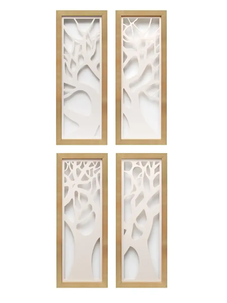 Декоративные резные настенные панно "Сказочный лес". Декор на стену изготовлен из высококачественной березовой фанеры, окрашены акриловым лаком. Настенные деревянные панно "Сказочный лес", декор для комнаты в современном стиле. Деревянные резные деревья оформлены в лаконичную багетную раму. Декор для интерьера дома и дачи. Декорация на стену спальни, прихожей, украшение для кухни и ванной комнаты. Деревянные панно легкие и изящные, преобразят интерьер комнат. Размер одного панно 18*48 см, вся настенная декорация размером ширина 90 см х высота 48см.. С обратной стороны зубчатый крепеж, крепление для стены в комплекте.