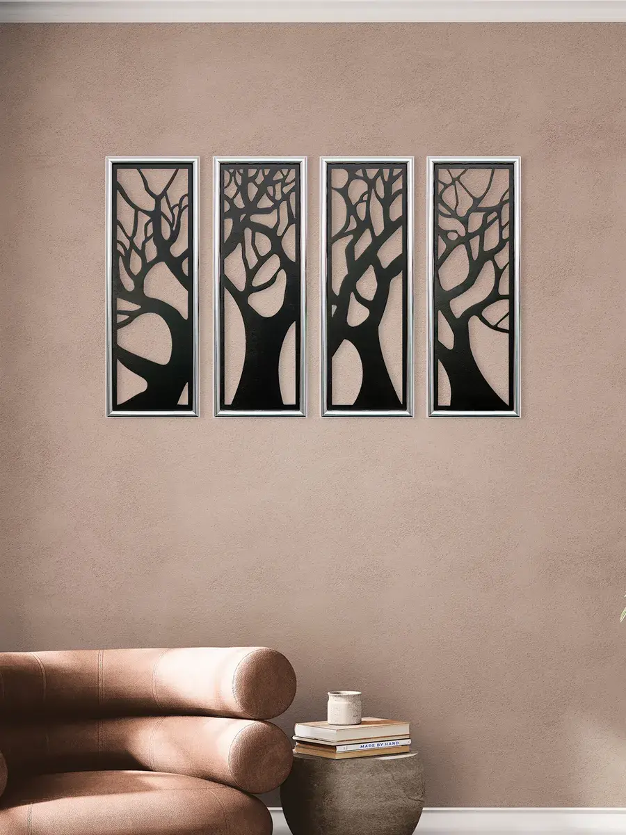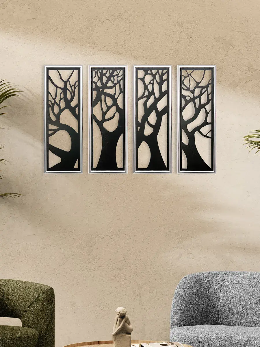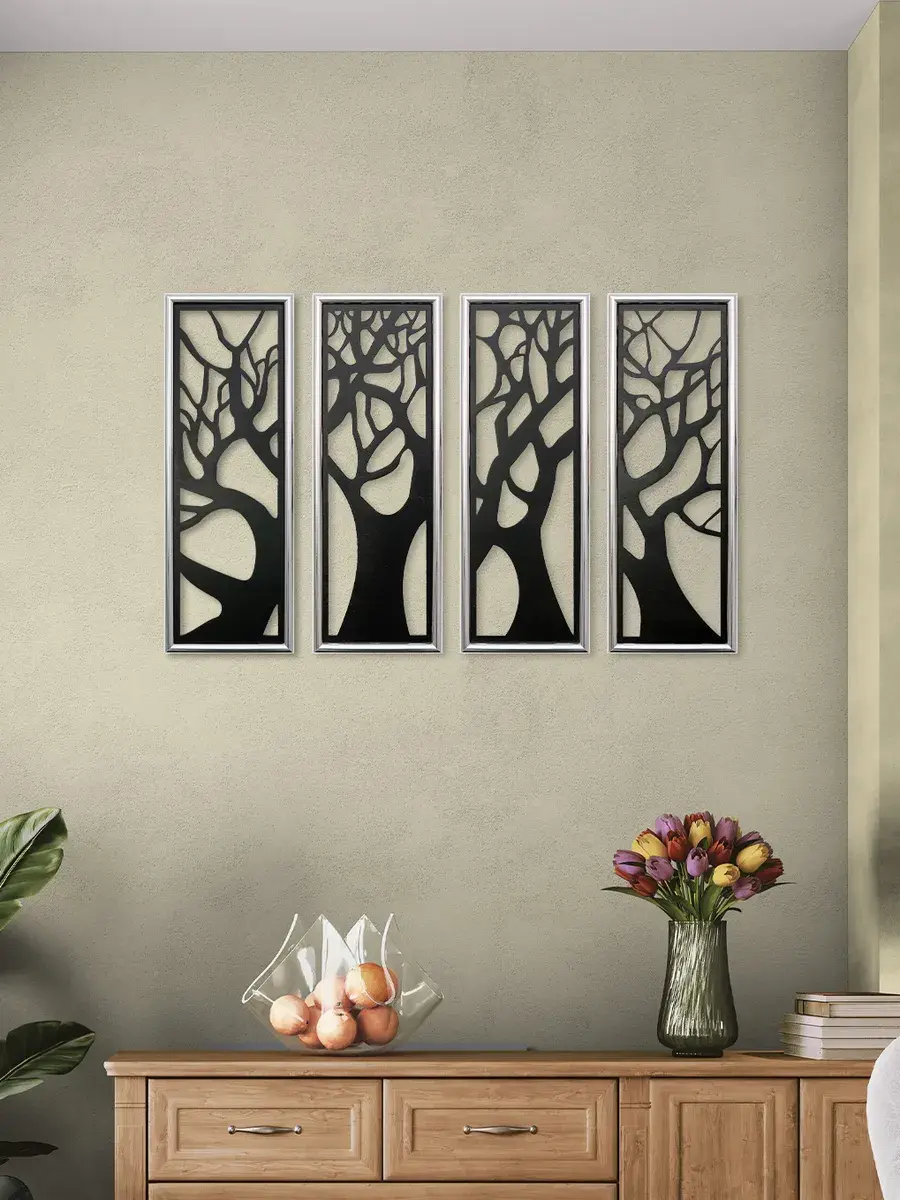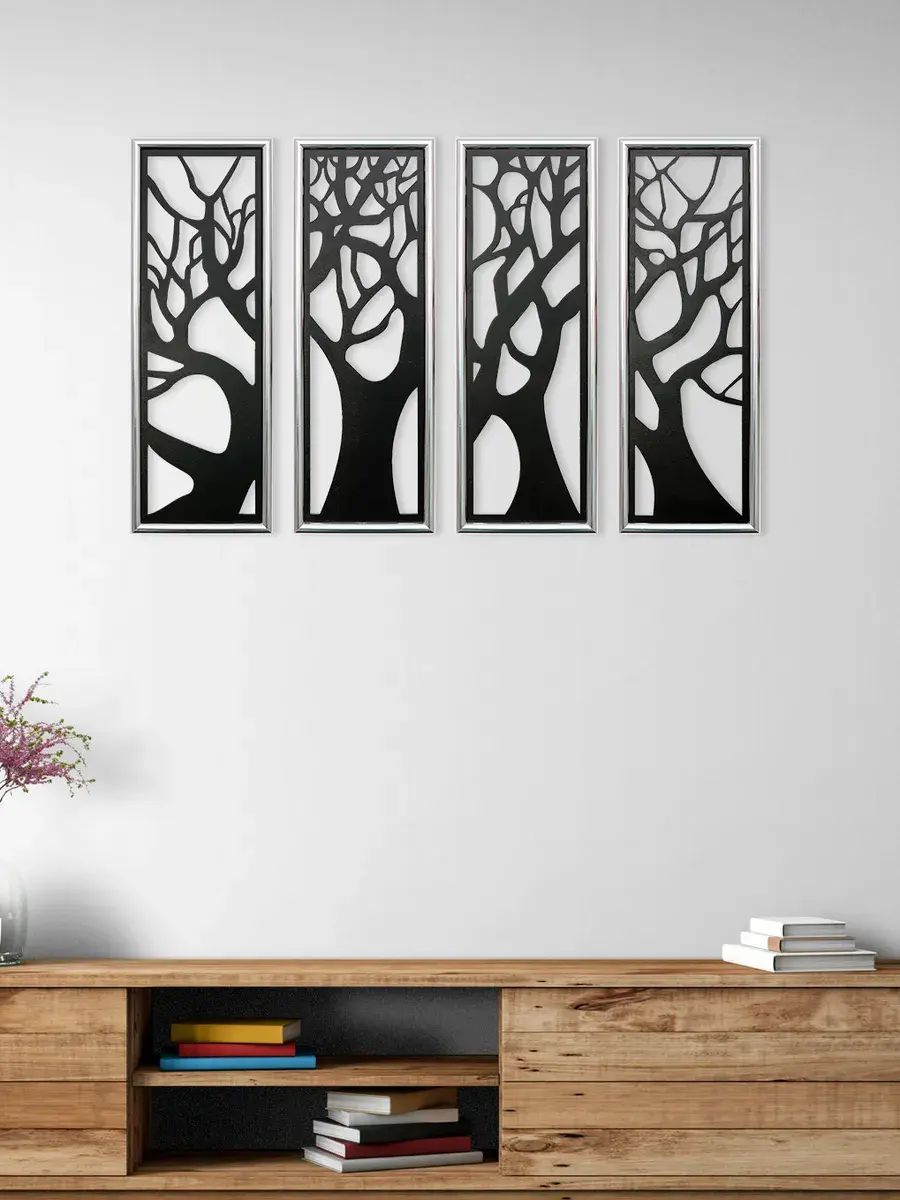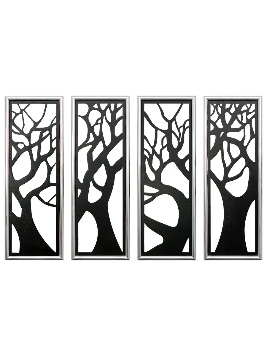 Декоративные резные настенные панно "Сказочный лес". Декор на стену изготовлен из высококачественной березовой фанеры, окрашены акриловым лаком. Настенные деревянные панно "Сказочный лес", декор для комнаты в современном стиле. Деревянные резные деревья оформлены в лаконичную багетную раму. Декор для интерьера дома и дачи. Декорация на стену спальни, прихожей, украшение для кухни и ванной комнаты. Деревянные панно легкие и изящные, преобразят интерьер комнат. Размер одного панно 18*48 см, вся настенная декорация размером ширина 90 см х высота 48см.. С обратной стороны зубчатый крепеж, крепление для стены в комплекте.