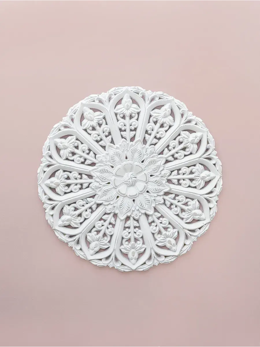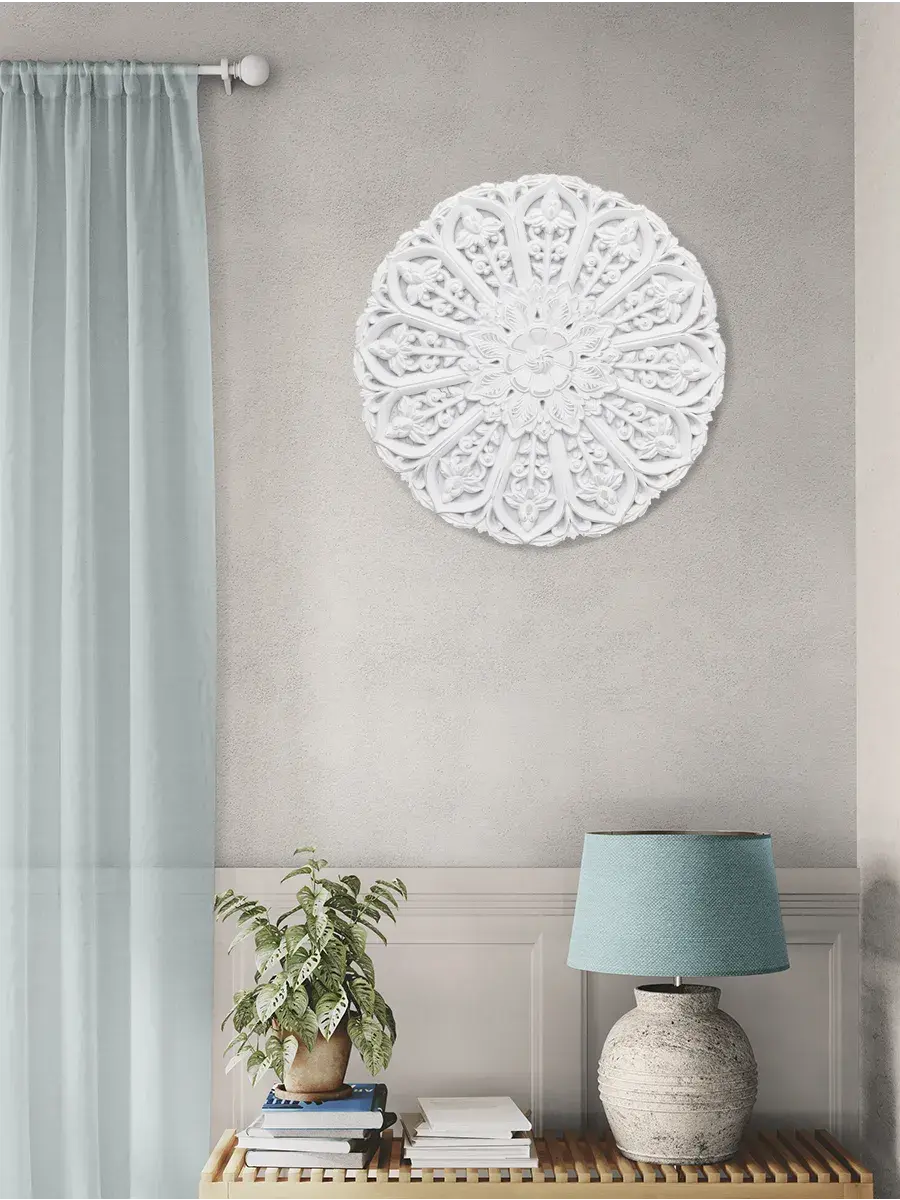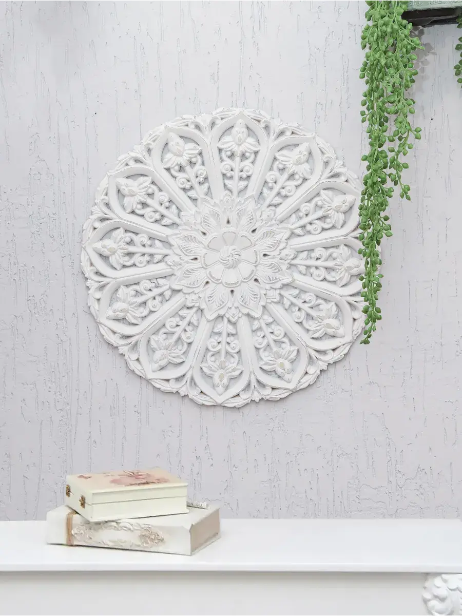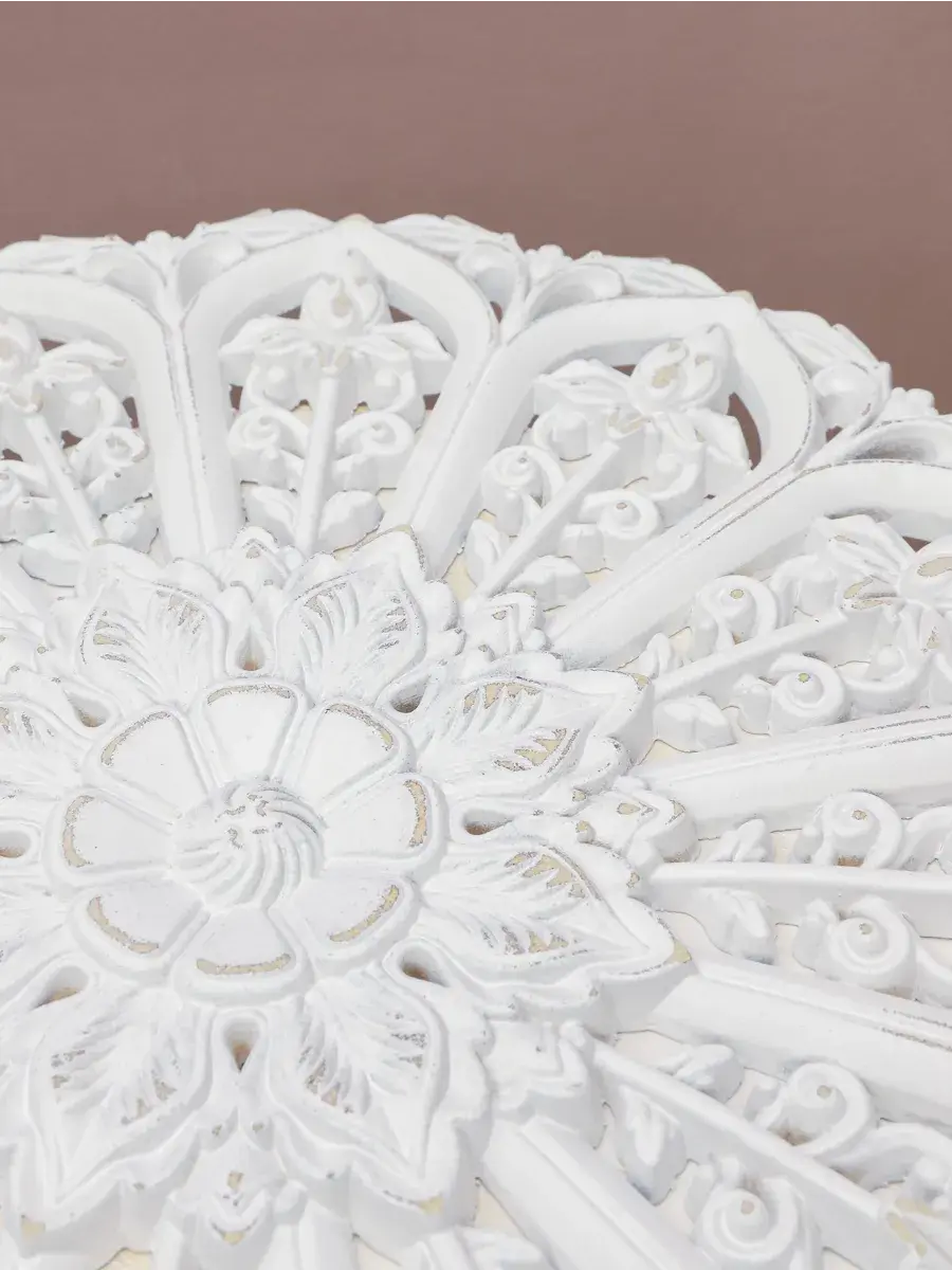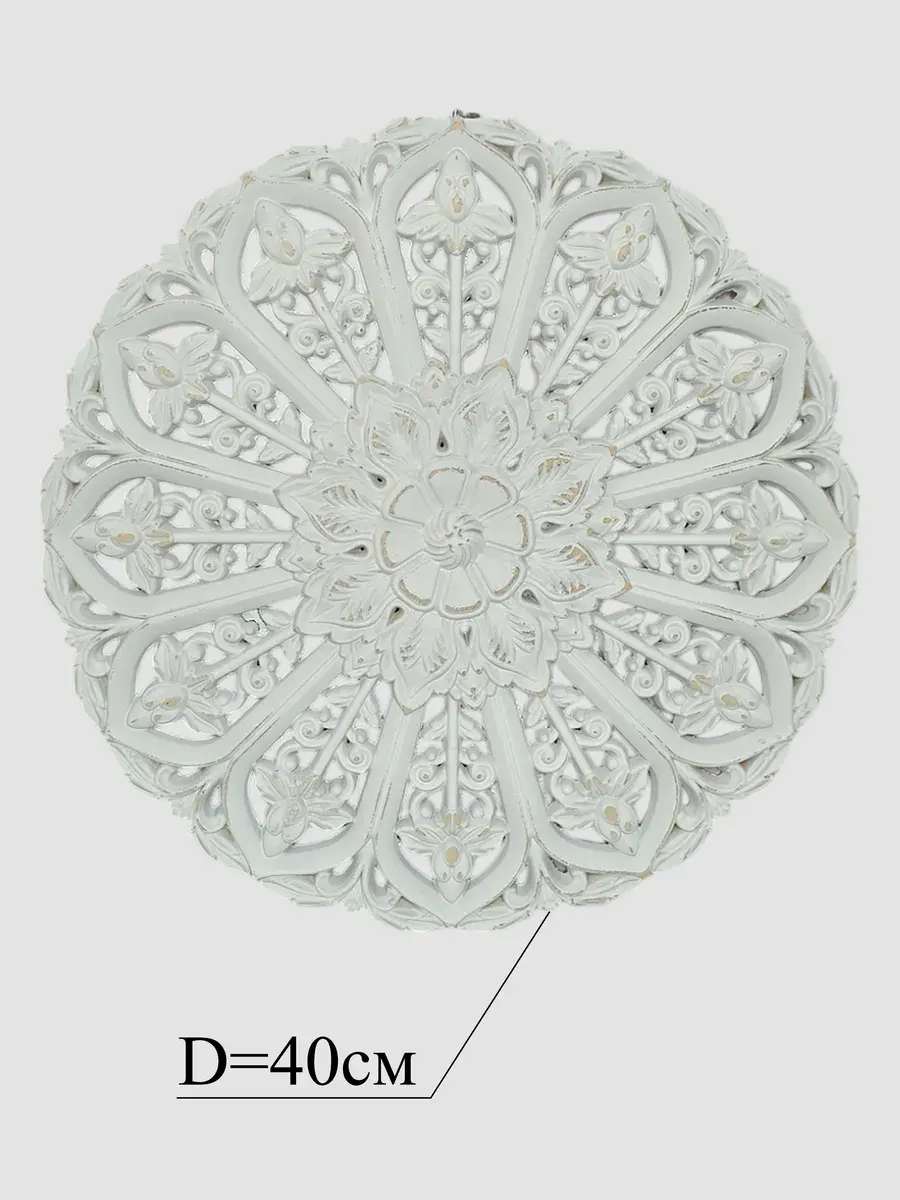 Настенное резное панно диаметром 40 см. Из нескольких панно можно собрать большую композицию. Объемный орнамент окрашен с эффектом старения, что придает ему особый шарм (при желании можно легко перекрасить в любой цвет под Ваш интерьер. Настенный декор станет прекрасным украшением над изголовьем кровати или большой стены в гостиной. Если комбинировать несколько панно - можно получить удивительную композицию, которая будет притягивать взгляды. Декор для комнаты на стену добавит нотку элегантности и изысканности в гостиной или спальной, в прихожей или на террасе. Панно будет хорошо смотреться как самостоятельный декор, так и в сочетании с другими элементами декора коллекции "Флоренция". Крепление для стены в комплекте.