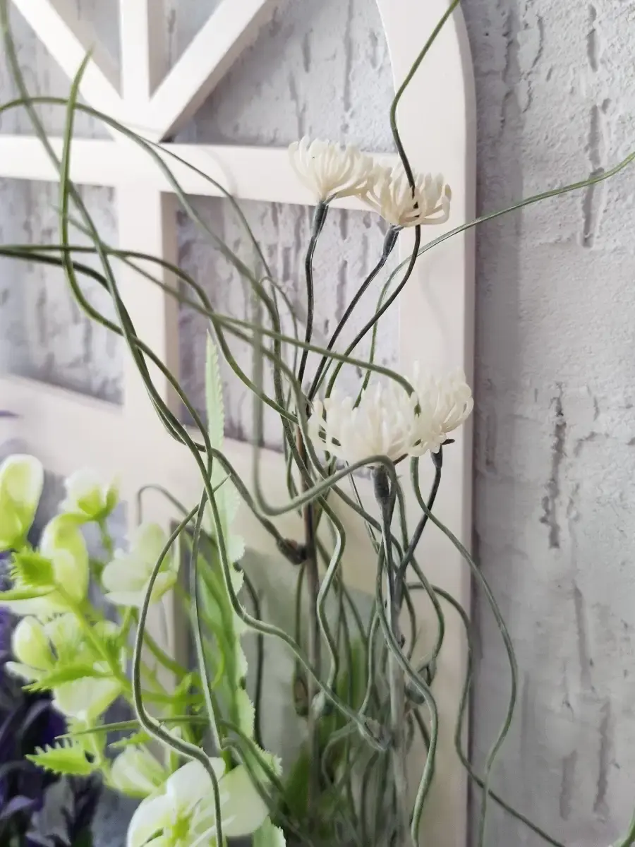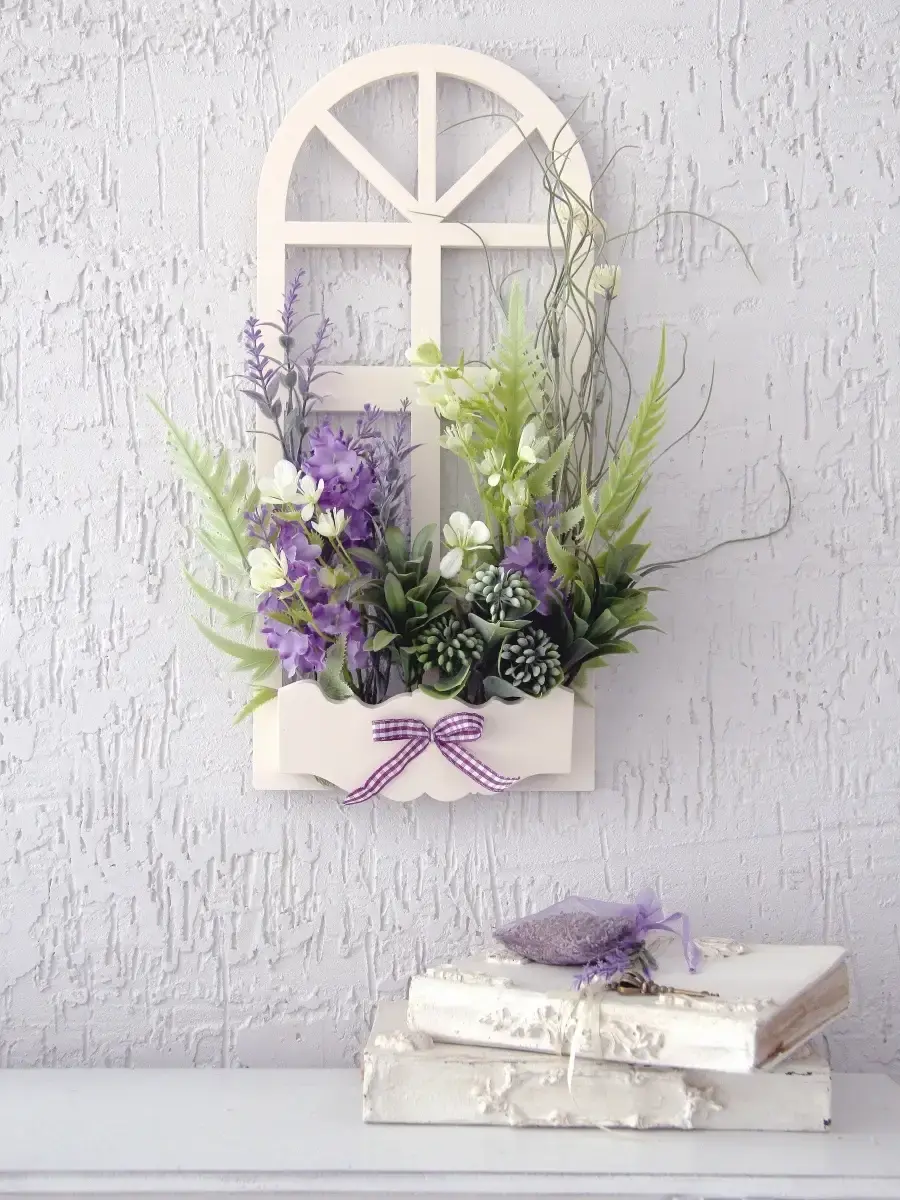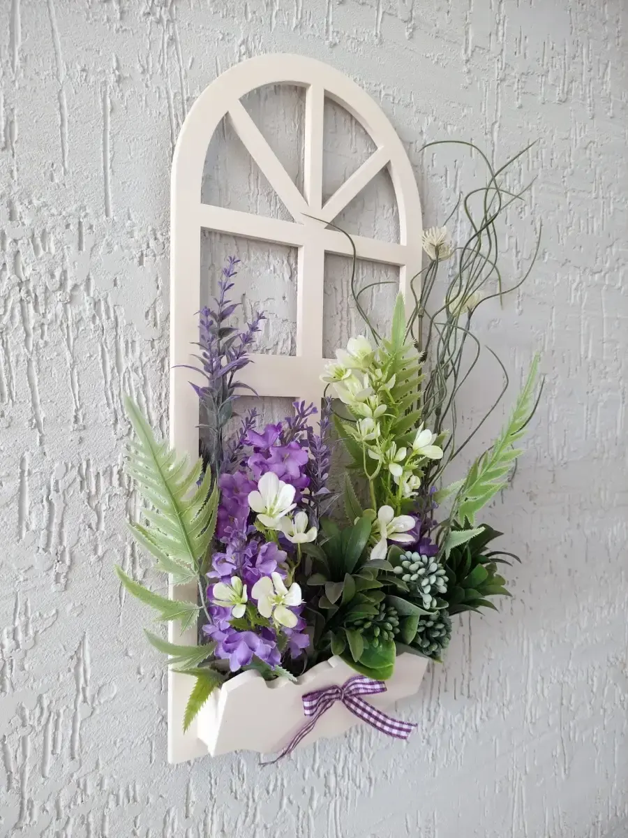 Украшение настенное для интерьера с искусственными интерьерными цветами . Композиция настенная в деревянном кашпо-окно с цветами, ВНИМАНИЕ! Размеры фальш-окна композиций отличаются (18х40см или 38х21см) Размер конкретной модели указан в карусели фотографий. Крепление на зубчатый крепеж , саморез для стены в комплекте. Отличное украшение к зеркалу, в прихожей, ванной или для кухни, где живым цветам недостаточно света. Всегда будут радовать и добавлять уюта в дом. Прекрасный подарок для дома, дачи или салона красоты. По желанию самостоятельно можно дополнить светодиодными нитями (светодиодной гирляндой). Уход : обдуть феном, протирать влажной тканью , обработать антистатиком..