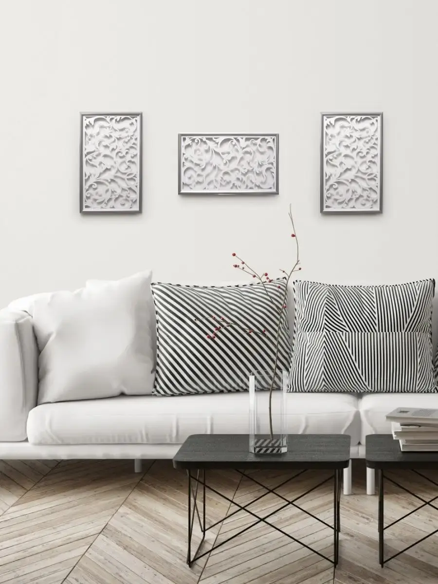 Настенный декор для оформление интерьера спальной или гостиной комнаты в современном стиле. Особенно эффектно смотрятся комплектом из 2х или 3х штук. Изготовлено из высококачественной березовой фанеры, толщина 4 мм, окрашено акриловой эмалью без запаха. Размер панно 27х44 см. Крепление для стены в комплекте.