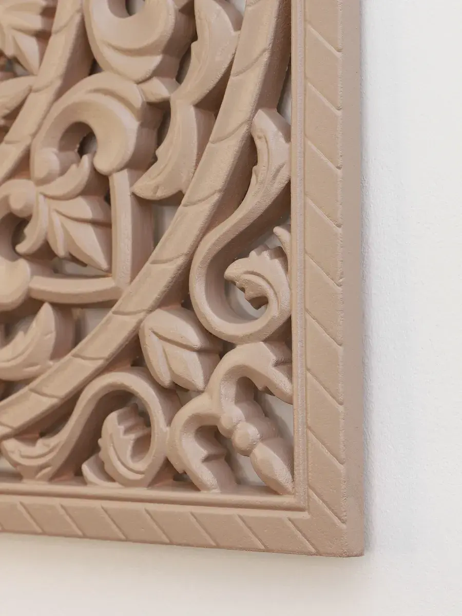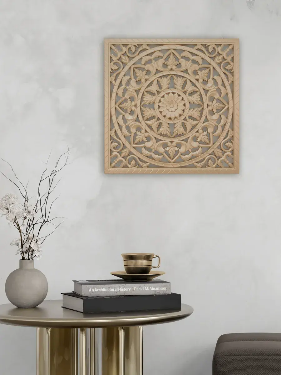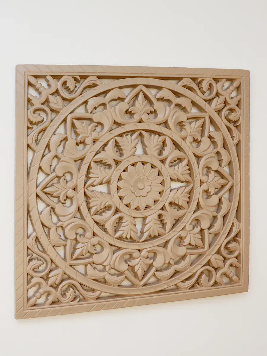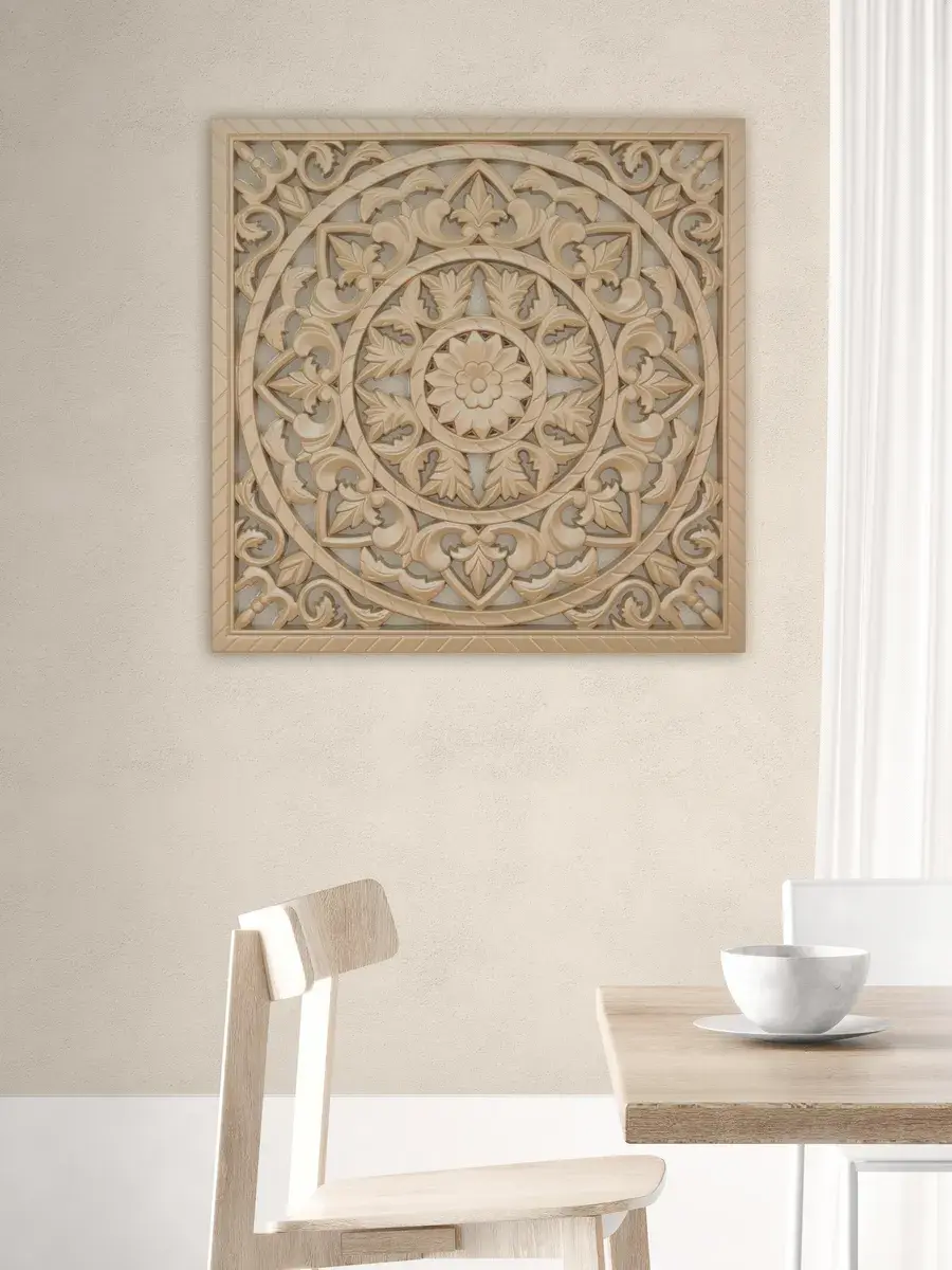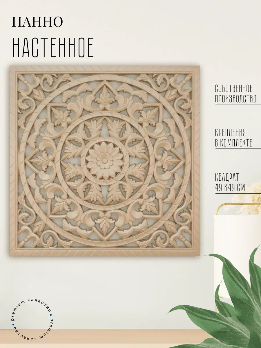 Настенное резное панно 49*49 см. Из нескольких панно можно собрать большую композицию. Объемный орнамент окрашен мятно-салатовой акриловой эмалью, что придает ему особый шарм (при желании можно легко перекрасить в любой цвет под Ваш интерьер). Резное настенное панно станет прекрасным украшением стены над изголовьем кровати или большой стены в гостиной. Если комбинировать несколько панно - можно получить удивительную композицию, которая будет притягивать взгляды. Декор для комнаты на стену добавит нотку элегантности и изысканности в гостиной или спальной, в прихожей или на террасе. Панно будет хорошо смотреться как самостоятельный декор, так и в сочетании с другими элементами декора коллекции "Флоренция". Крепление для стены в комплекте.