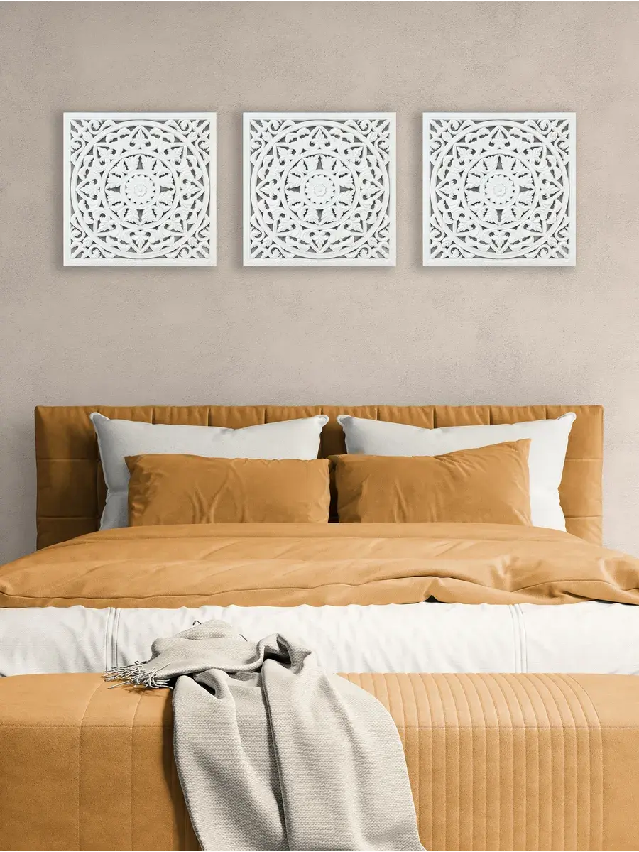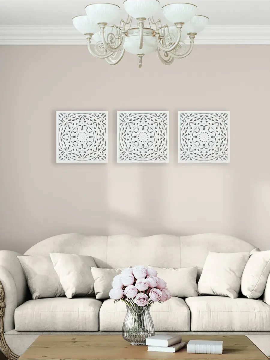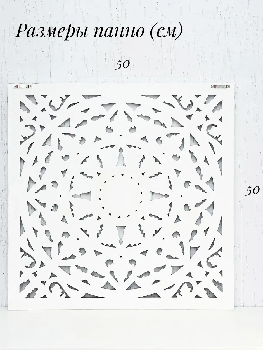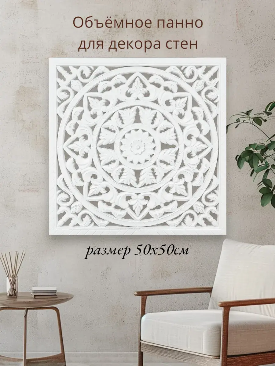 Настенное резное панно 50*50 см. Из нескольких панно можно собрать большую композицию. Объемный орнамент окрашен с эффектом старения, что придает ему особый шарм (при желании можно легко перекрасить в любой цвет под Ваш интерьер). Резное настенное панно станет прекрасным украшением стены над изголовьем кровати или большой стены в гостиной. Если комбинировать несколько панно - можно получить удивительную композицию, которая будет притягивать взгляды. Декор для комнаты на стену добавит нотку элегантности и изысканности в гостиной или спальной, в прихожей или на террасе. Панно будет хорошо смотреться как самостоятельный декор, так и в сочетании с другими элементами декора коллекции "Флоренция". Крепление для стены в комплекте.