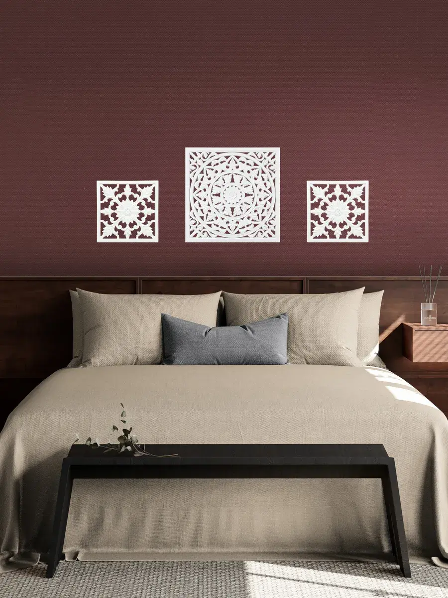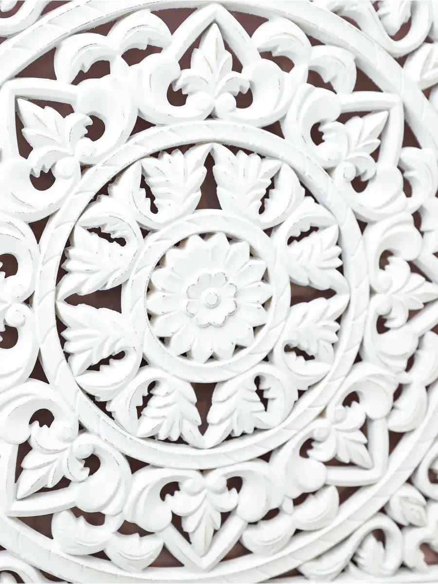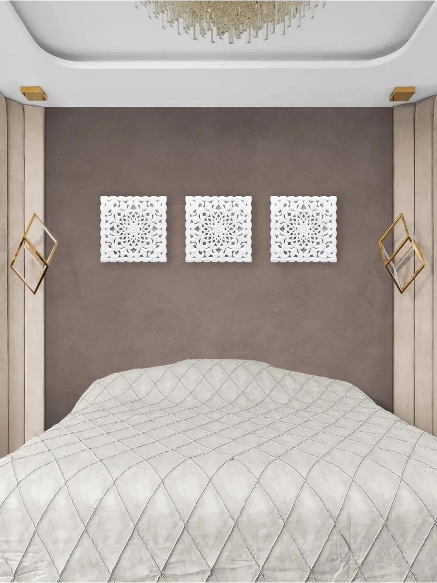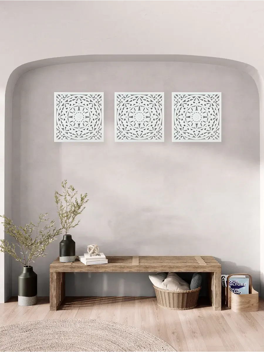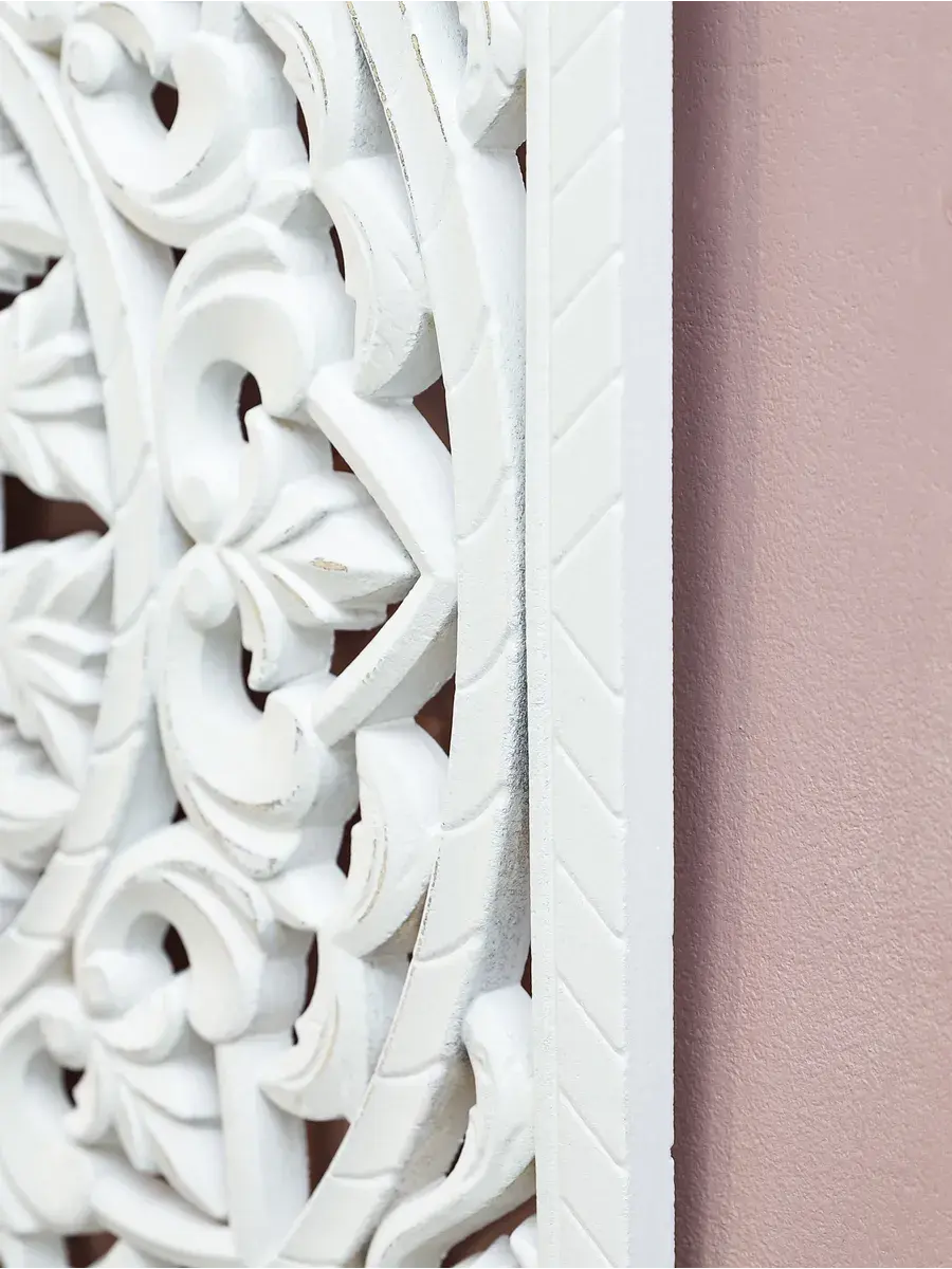 Настенное резное панно 50*50 см. Из нескольких панно можно собрать большую композицию. Объемный орнамент окрашен с эффектом старения, что придает ему особый шарм (при желании можно легко перекрасить в любой цвет под Ваш интерьер). Резное настенное панно станет прекрасным украшением стены над изголовьем кровати или большой стены в гостиной. Если комбинировать несколько панно - можно получить удивительную композицию, которая будет притягивать взгляды. Декор для комнаты на стену добавит нотку элегантности и изысканности в гостиной или спальной, в прихожей или на террасе. Панно будет хорошо смотреться как самостоятельный декор, так и в сочетании с другими элементами декора коллекции "Флоренция". Крепление для стены в комплекте.