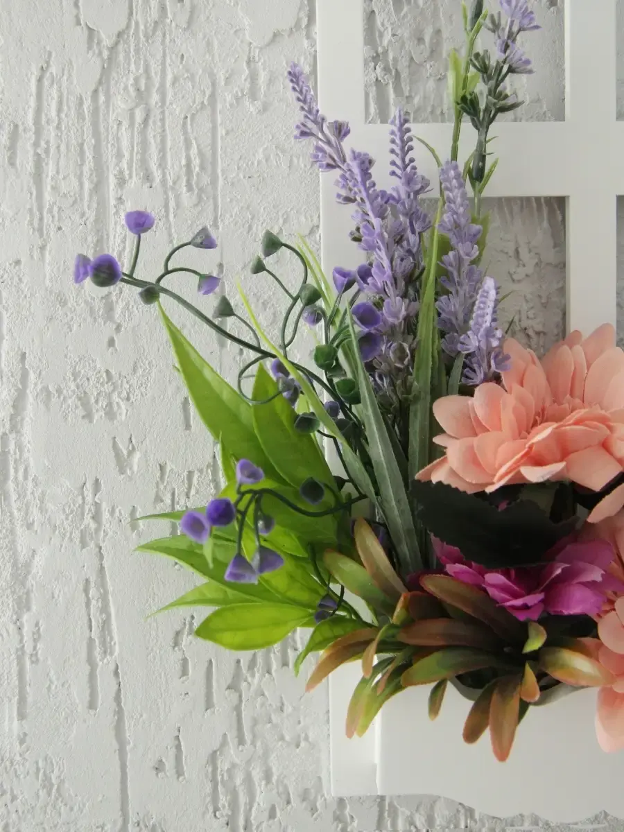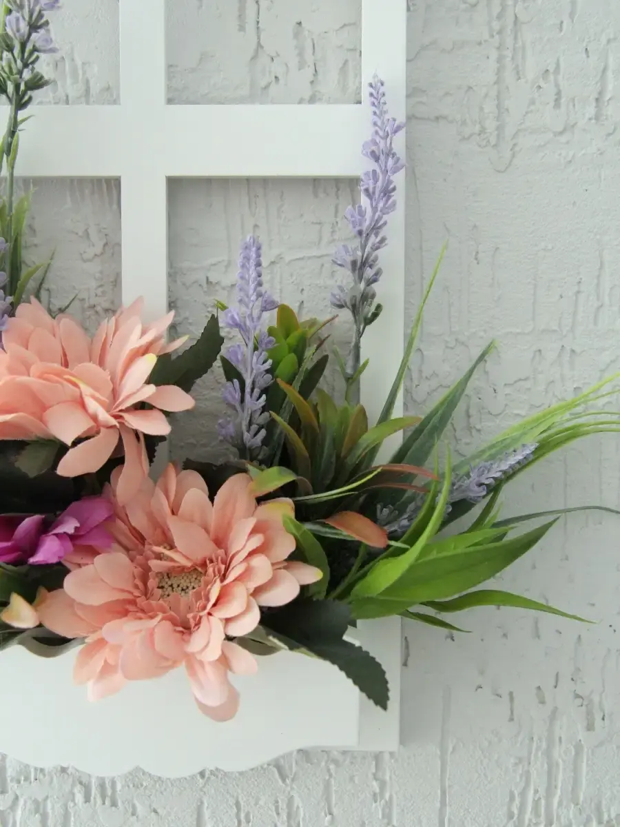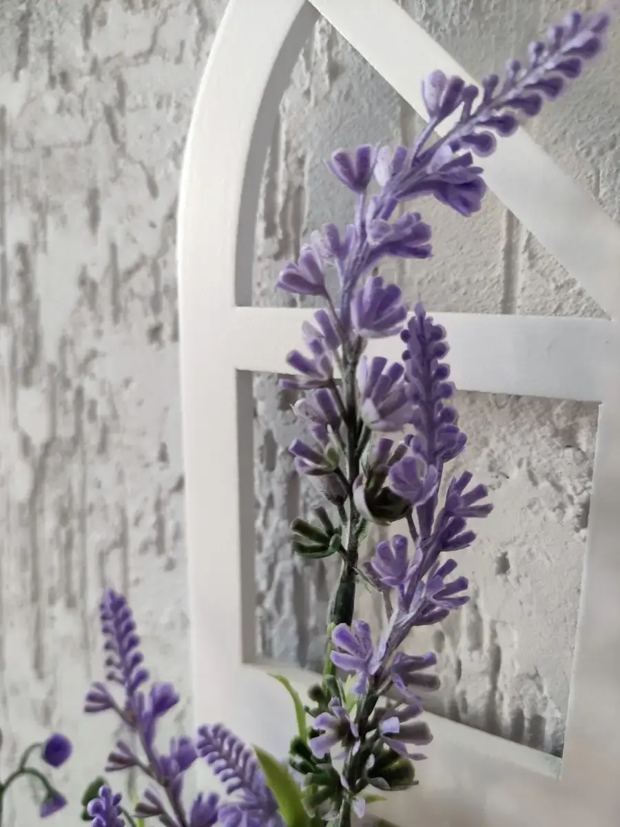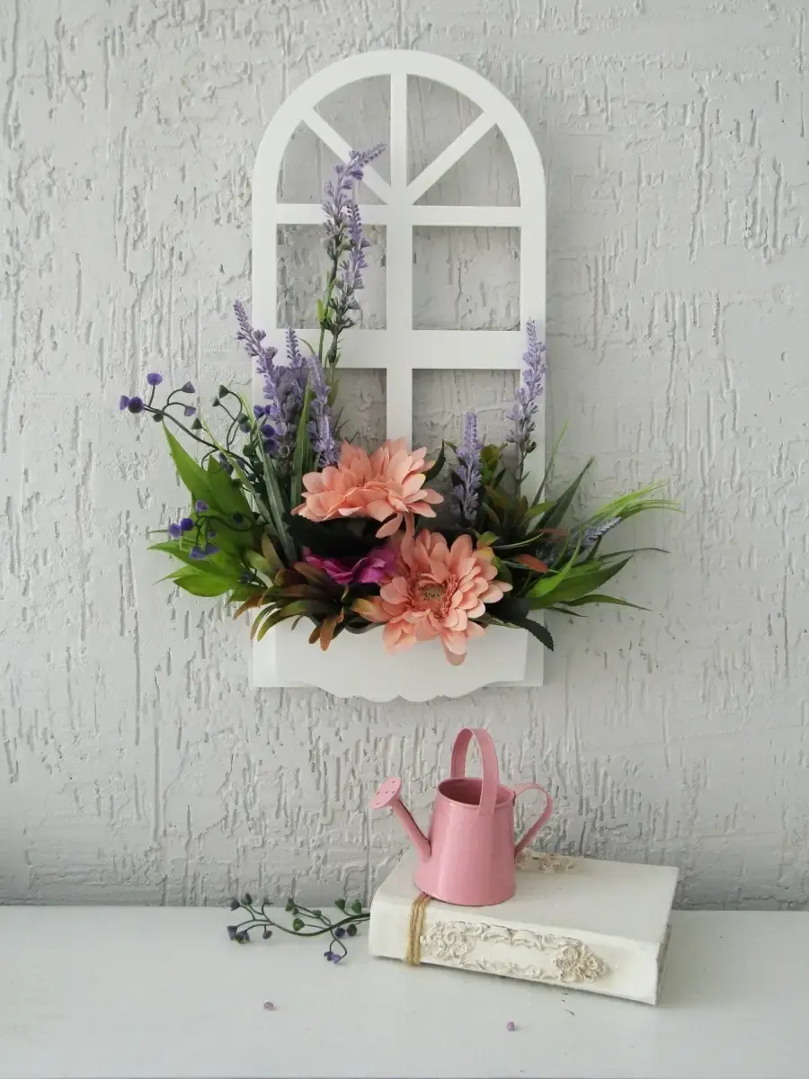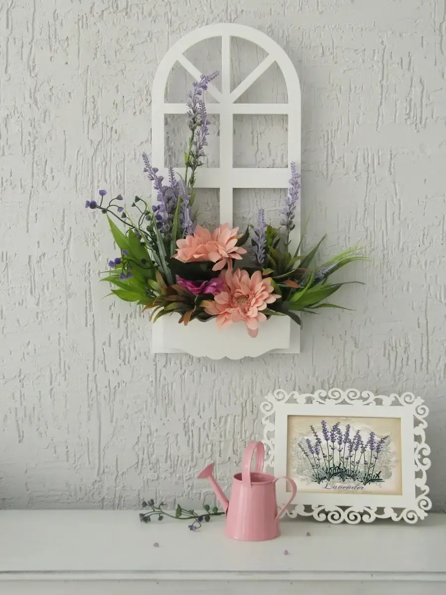 Украшение настенное для интерьера с искусственными интерьерными цветами . Композиция настенная в деревянном кашпо-окно с цветами, ВНИМАНИЕ! Размеры фальш-окна композиций отличаются (18х40см или 38х21см) Размер конкретной модели указан в карусели фотографий. Крепление на зубчатый крепеж , саморез для стены в комплекте. Отличное украшение к зеркалу, в прихожей, ванной или для кухни, где живым цветам недостаточно света. Всегда будут радовать и добавлять уюта в дом. Прекрасный подарок для дома, дачи или салона красоты. По желанию самостоятельно можно дополнить светодиодными нитями (светодиодной гирляндой). Уход : обдуть феном, протирать влажной тканью , обработать антистатиком..