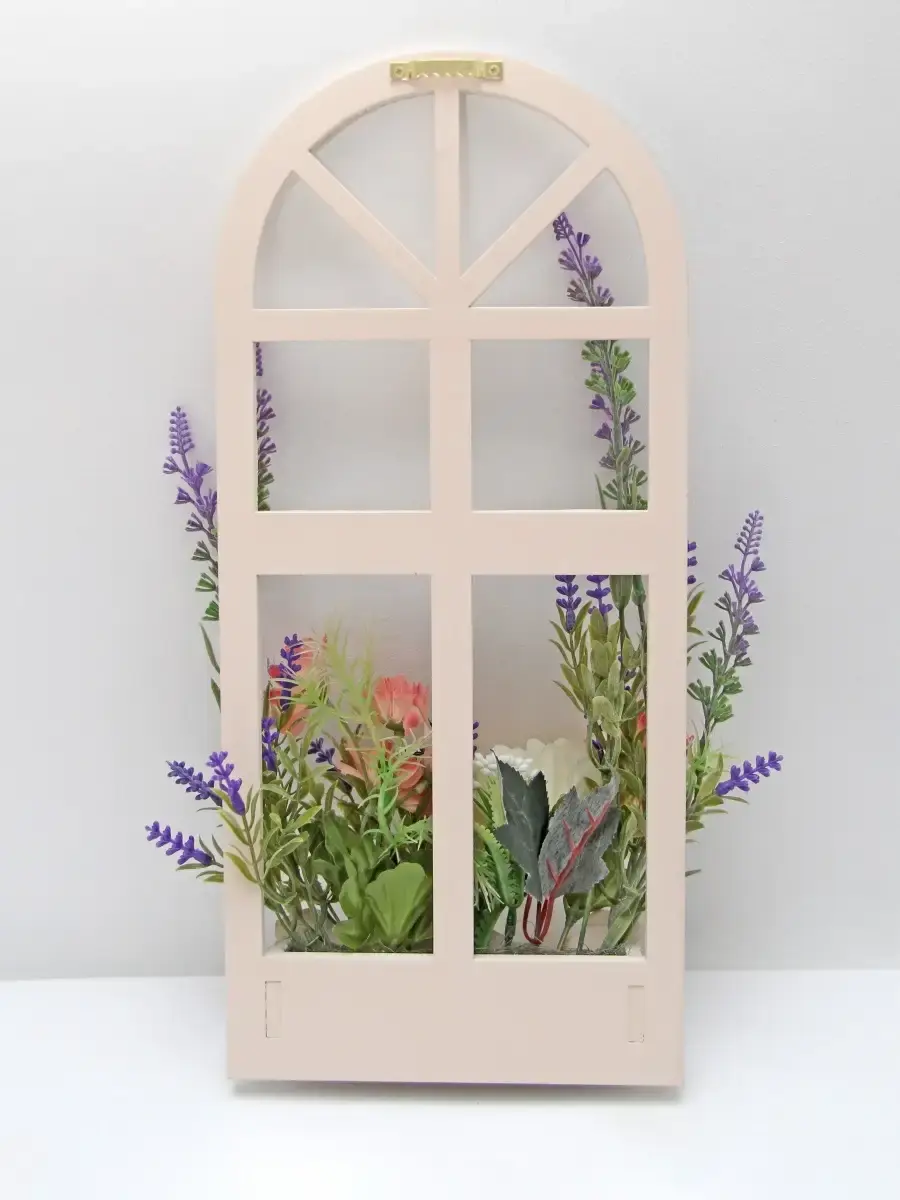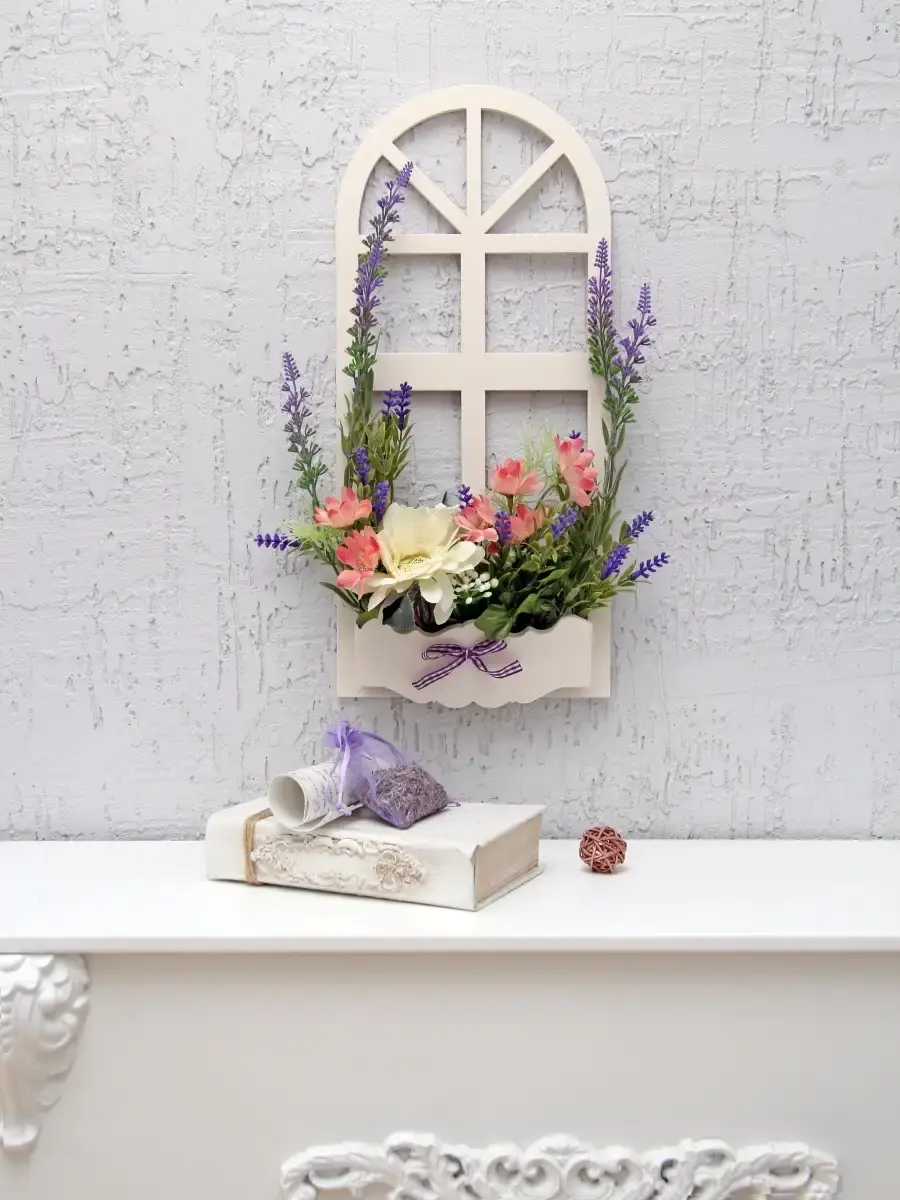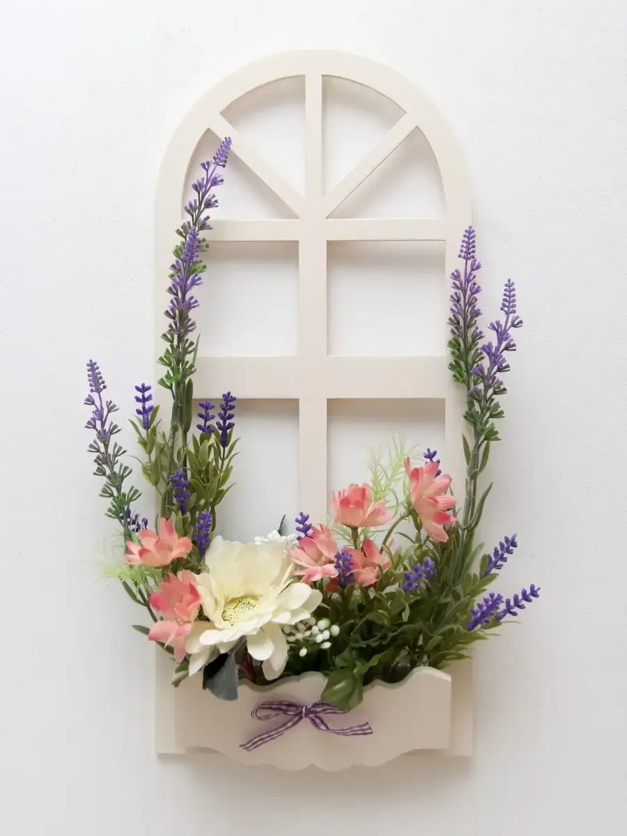 Украшение настенное для интерьера с искусственными интерьерными цветами . Композиция настенная в деревянном кашпо-окно с цветами, ВНИМАНИЕ! Размеры фальш-окна композиций отличаются (18х40см или 38х21см) Размер конкретной модели указан в карусели фотографий. Крепление на зубчатый крепеж , саморез для стены в комплекте. Отличное украшение к зеркалу, в прихожей, ванной или для кухни, где живым цветам недостаточно света. Всегда будут радовать и добавлять уюта в дом. Прекрасный подарок для дома, дачи или салона красоты. По желанию самостоятельно можно дополнить светодиодными нитями (светодиодной гирляндой). Уход : обдуть феном, протирать влажной тканью , обработать антистатиком..