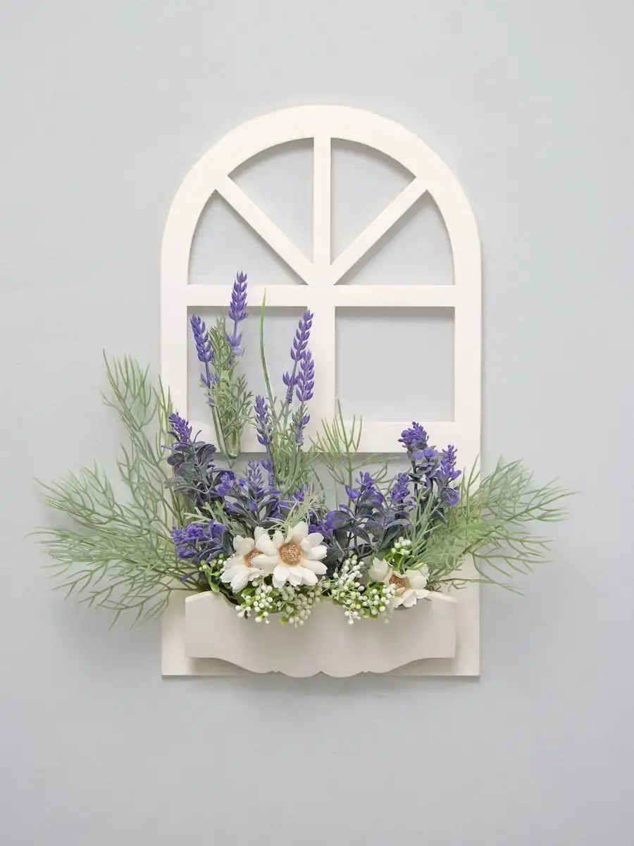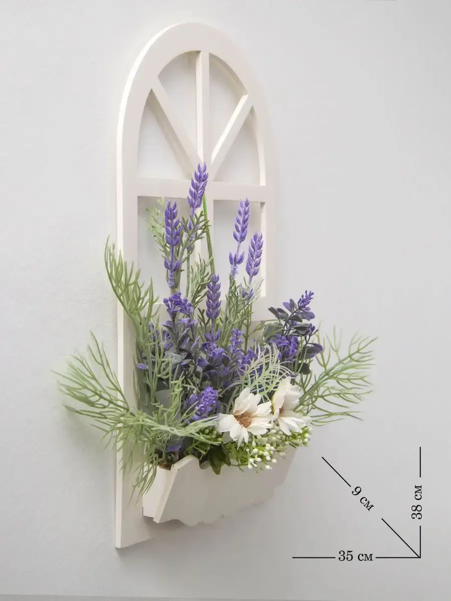 Украшение настенное для интерьера с искусственными интерьерными цветами. Композиции из папоротников, лаванды, ромашек, колокольчиков. Панно декоративное в виде окна с цветами. Цветы надежно закреплены в деревянном кашпо-окно, размер окна 38х21 см. Крепление на зубчатый крепеж , саморез для стены в комплекте. Отличное украшение к зеркалу, в прихожей, ванной или для кухни, где живым цветам недостаточно света. Всегда будут радовать и добавлять уюта в дом. По желанию самостоятельно можно дополнить светодиодными нитями (светодиодной гирляндой). Уход : обдуть феном, протирать влажной тканью , обработать антистатиком.
