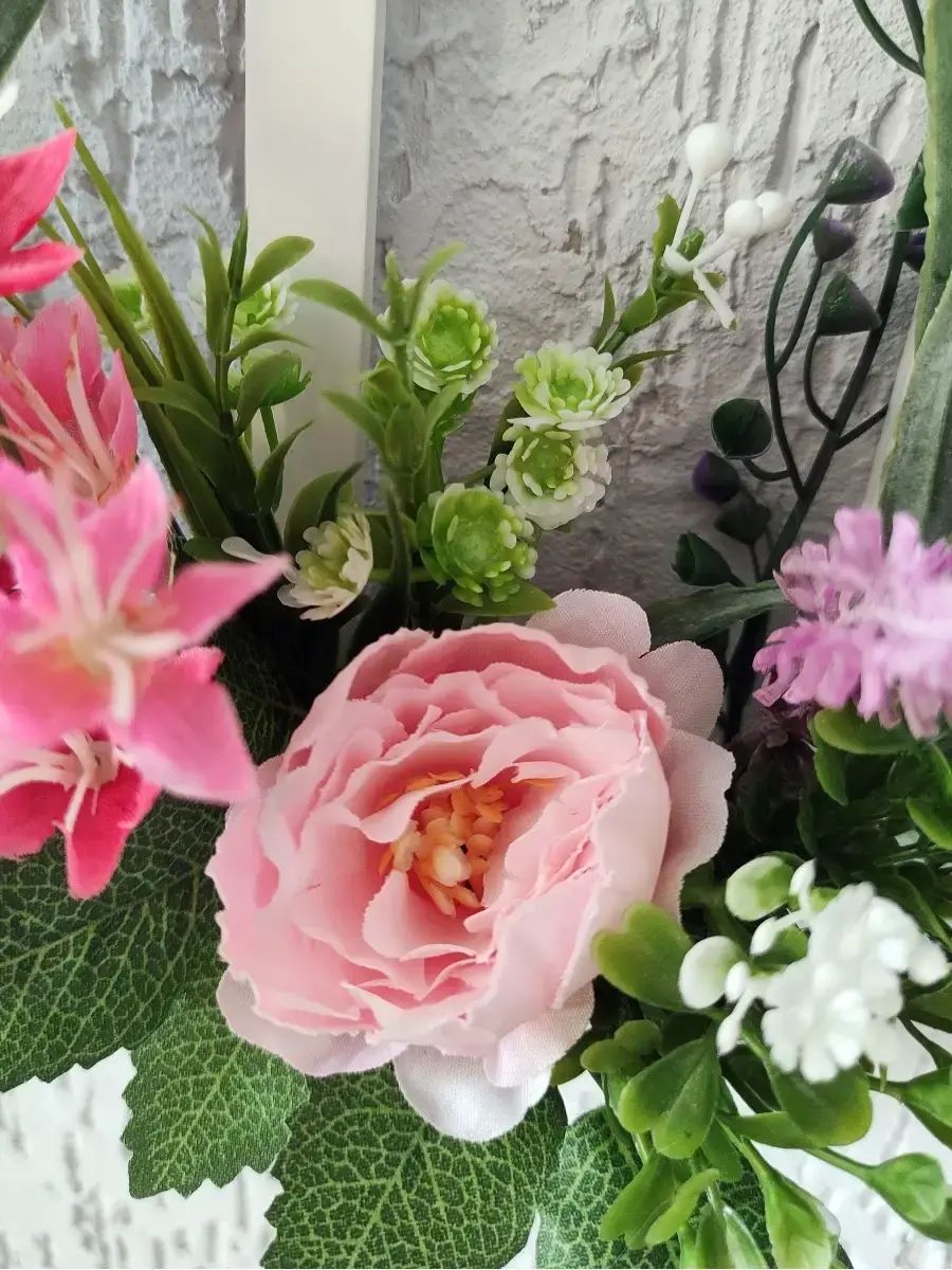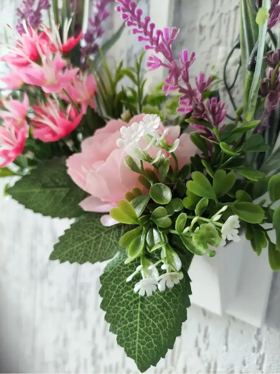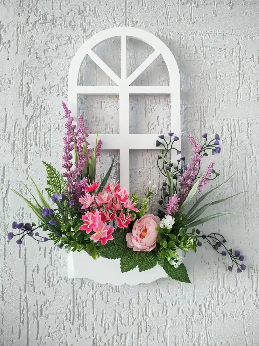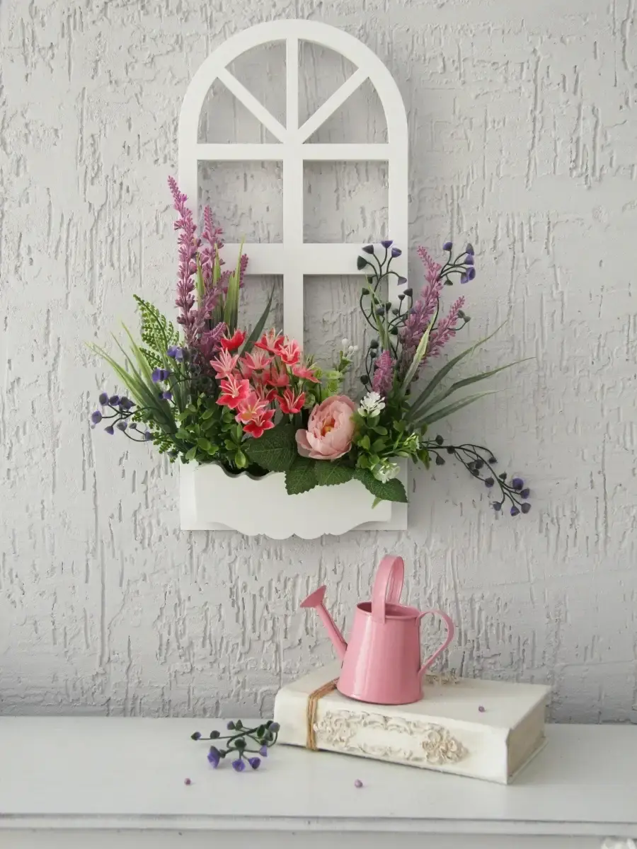 Украшение настенное для интерьера с искусственными интерьерными цветами . Композиция настенная в деревянном кашпо-окно с цветами, ВНИМАНИЕ! Размеры фальш-окна композиций отличаются (18х40см или 38х21см) Размер конкретной модели указан в карусели фотографий. Крепление на зубчатый крепеж , саморез для стены в комплекте. Отличное украшение к зеркалу, в прихожей, ванной или для кухни, где живым цветам недостаточно света. Всегда будут радовать и добавлять уюта в дом. Прекрасный подарок для дома, дачи или салона красоты. По желанию самостоятельно можно дополнить светодиодными нитями (светодиодной гирляндой). Уход : обдуть феном, протирать влажной тканью , обработать антистатиком..