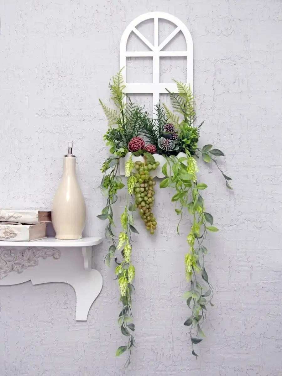 Украшение настенное для интерьера с искусственными интерьерными цветами . Композиция настенная в деревянном кашпо-окно с цветами, ВНИМАНИЕ! Размеры фальш-окна композиций отличаются (18х40см или 38х21см) Размер конкретной модели указан в карусели фотографий. Крепление на зубчатый крепеж , саморез для стены в комплекте. Отличное украшение к зеркалу, в прихожей, ванной или для кухни, где живым цветам недостаточно света. Всегда будут радовать и добавлять уюта в дом. Прекрасный подарок для дома, дачи или салона красоты. По желанию самостоятельно можно дополнить светодиодными нитями (светодиодной гирляндой). Уход : обдуть феном, протирать влажной тканью , обработать антистатиком..