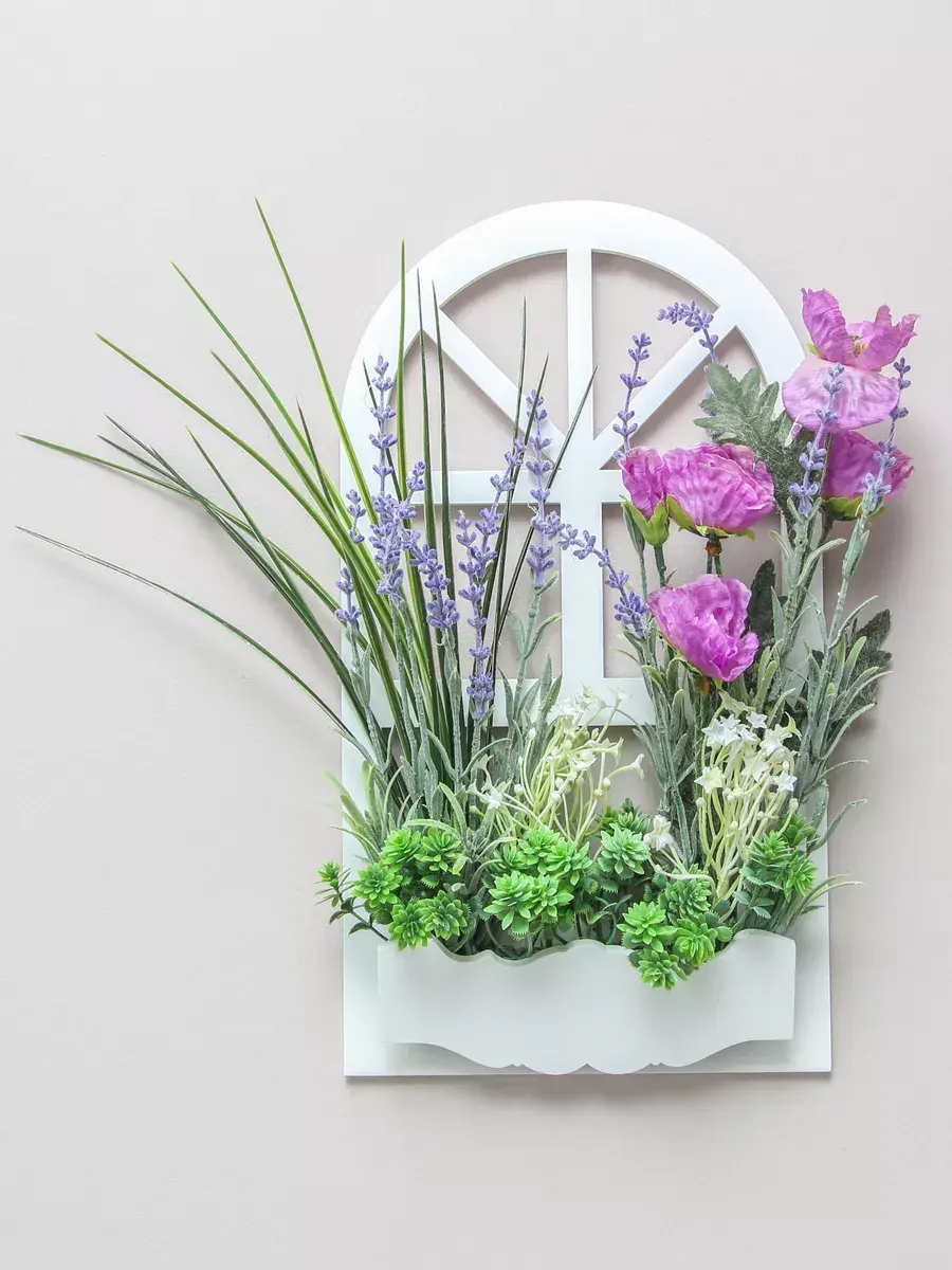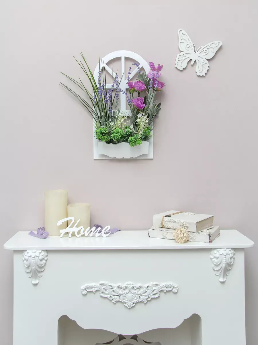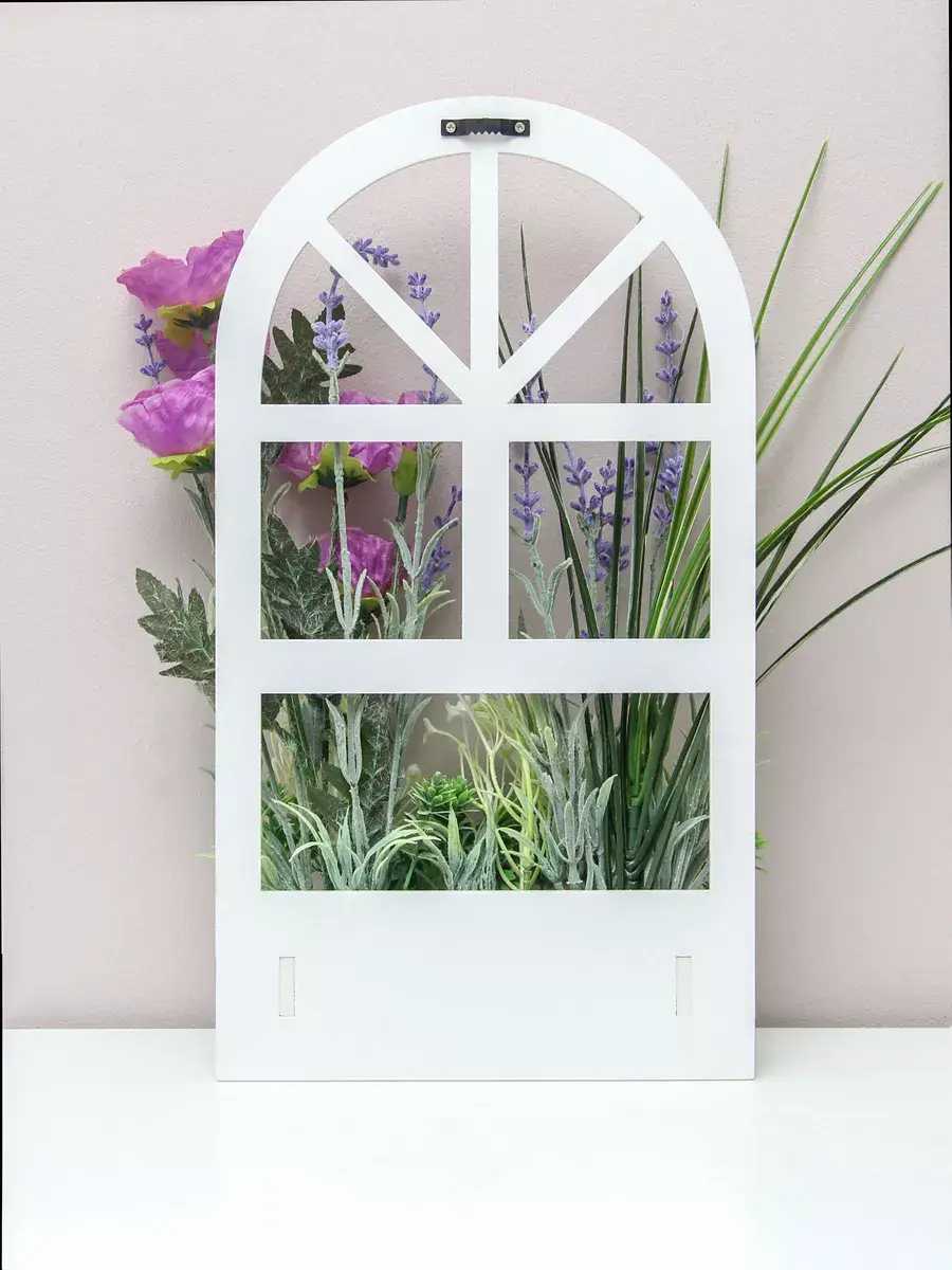 Украшение настенное для интерьера с искусственными интерьерными цветами. Композиции из папоротников, лаванды, ромашек, колокольчиков. Панно декоративное в виде окна с цветами. Цветы надежно закреплены в деревянном кашпо-окно, размер окна 38х21 см. Крепление на зубчатый крепеж , саморез для стены в комплекте. Отличное украшение к зеркалу, в прихожей, ванной или для кухни, где живым цветам недостаточно света. Всегда будут радовать и добавлять уюта в дом. По желанию самостоятельно можно дополнить светодиодными нитями (светодиодной гирляндой). Уход : обдуть феном, протирать влажной тканью , обработать антистатиком.