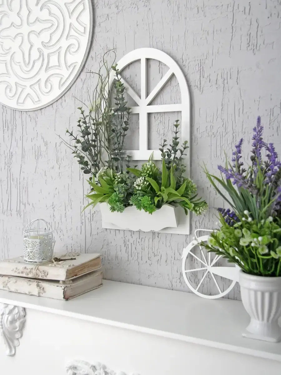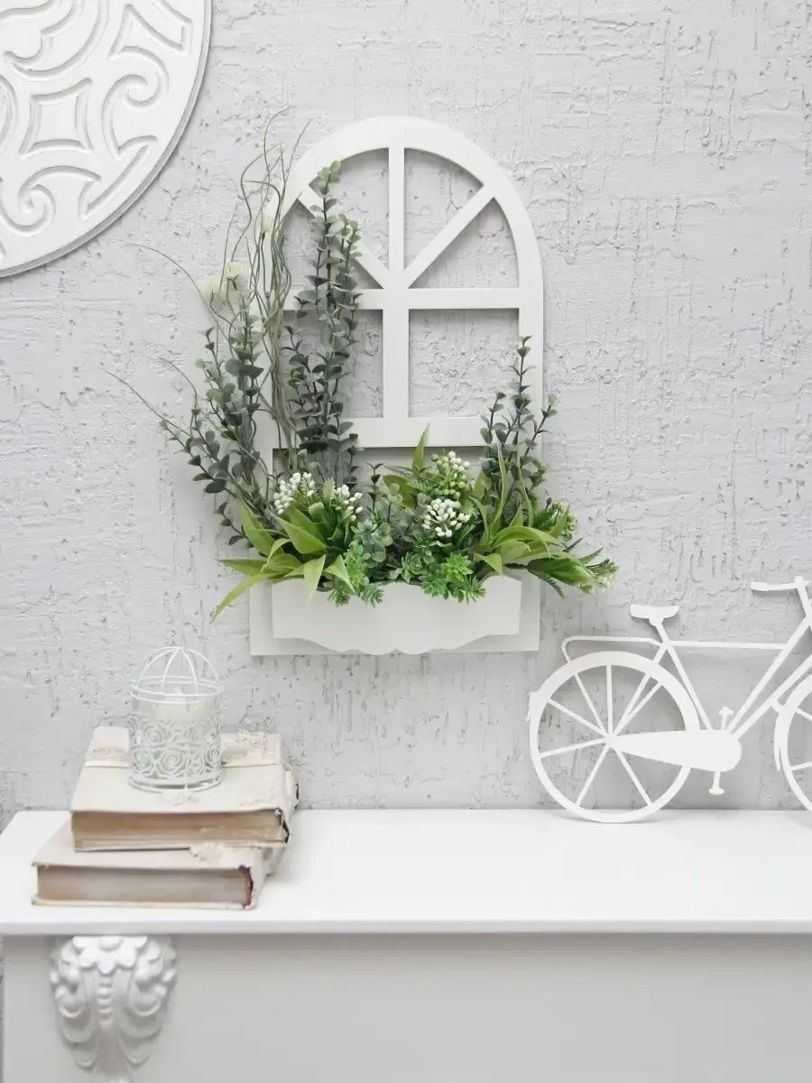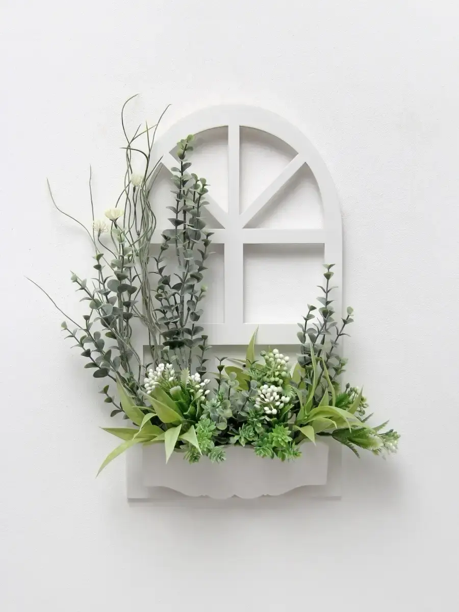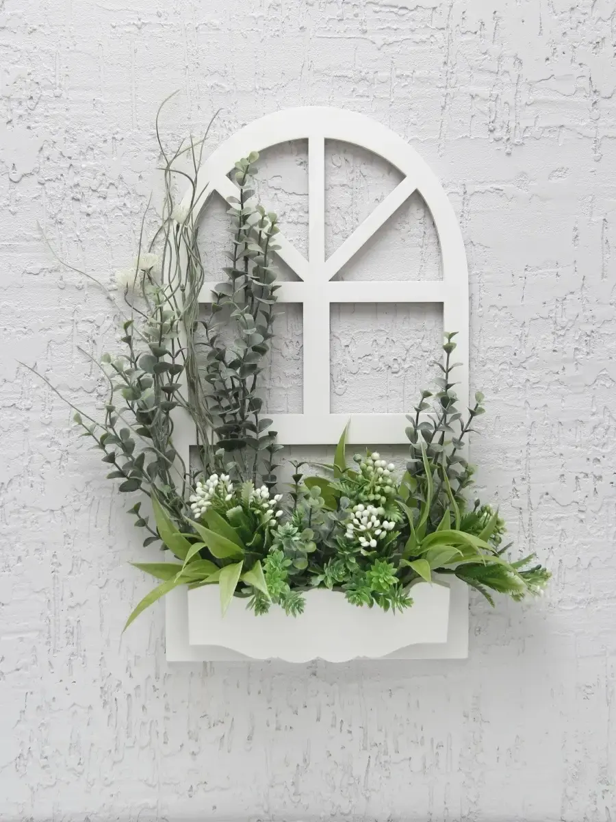 Украшение настенное для интерьера с искусственными интерьерными цветами. Композиции из папоротников, лаванды, ромашек, колокольчиков. Панно декоративное в виде окна с цветами. Цветы надежно закреплены в деревянном кашпо-окно, размер окна 38х21 см. Крепление на зубчатый крепеж , саморез для стены в комплекте. Отличное украшение к зеркалу, в прихожей, ванной или для кухни, где живым цветам недостаточно света. Всегда будут радовать и добавлять уюта в дом. По желанию самостоятельно можно дополнить светодиодными нитями (светодиодной гирляндой). Уход : обдуть феном, протирать влажной тканью , обработать антистатиком.