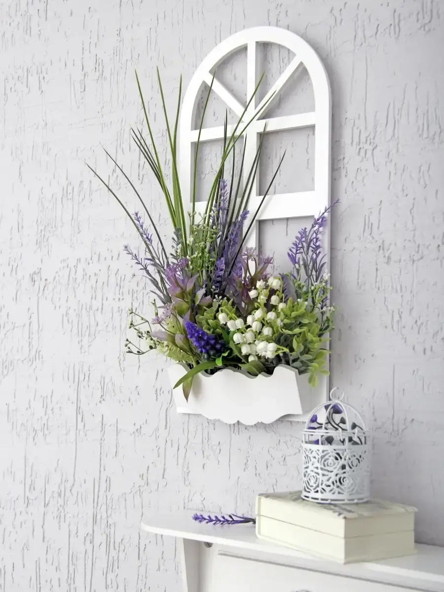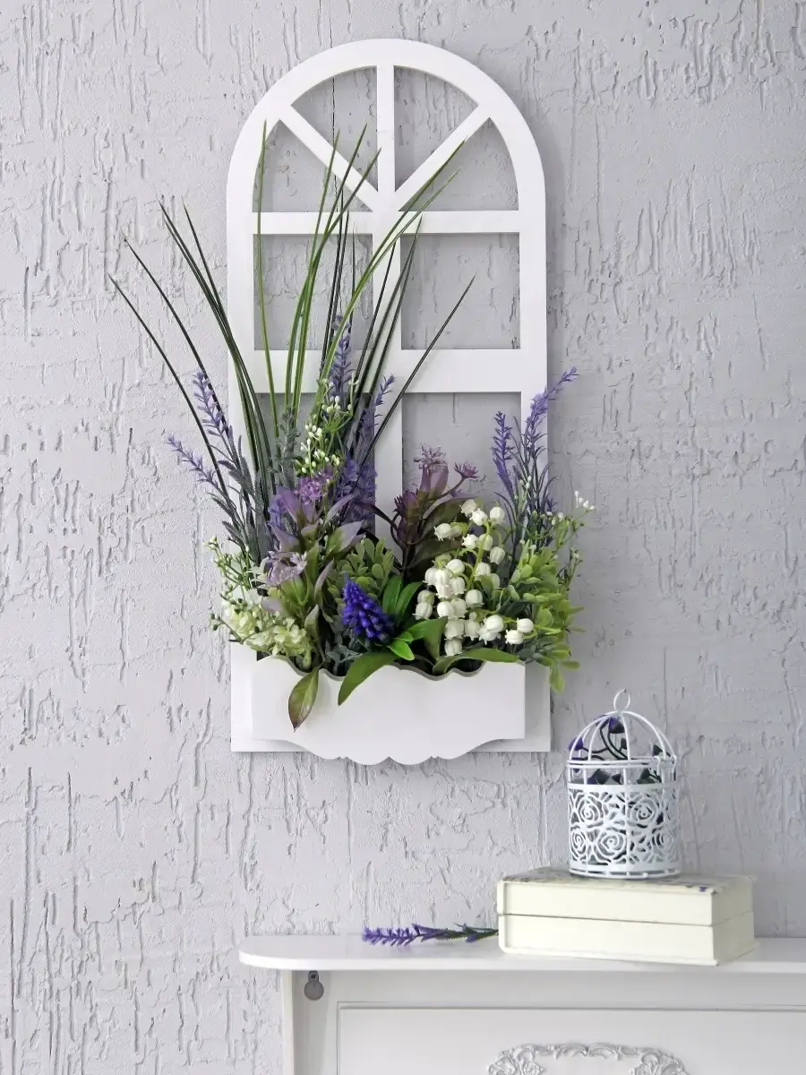 Украшение настенное для интерьера с искусственными интерьерными цветами . Композиция настенная в деревянном кашпо-окно с цветами, ВНИМАНИЕ! Размеры фальш-окна композиций отличаются (18х40см или 38х21см) Размер конкретной модели указан в карусели фотографий. Крепление на зубчатый крепеж , саморез для стены в комплекте. Отличное украшение к зеркалу, в прихожей, ванной или для кухни, где живым цветам недостаточно света. Всегда будут радовать и добавлять уюта в дом. Прекрасный подарок для дома, дачи или салона красоты. По желанию самостоятельно можно дополнить светодиодными нитями (светодиодной гирляндой). Уход : обдуть феном, протирать влажной тканью , обработать антистатиком..