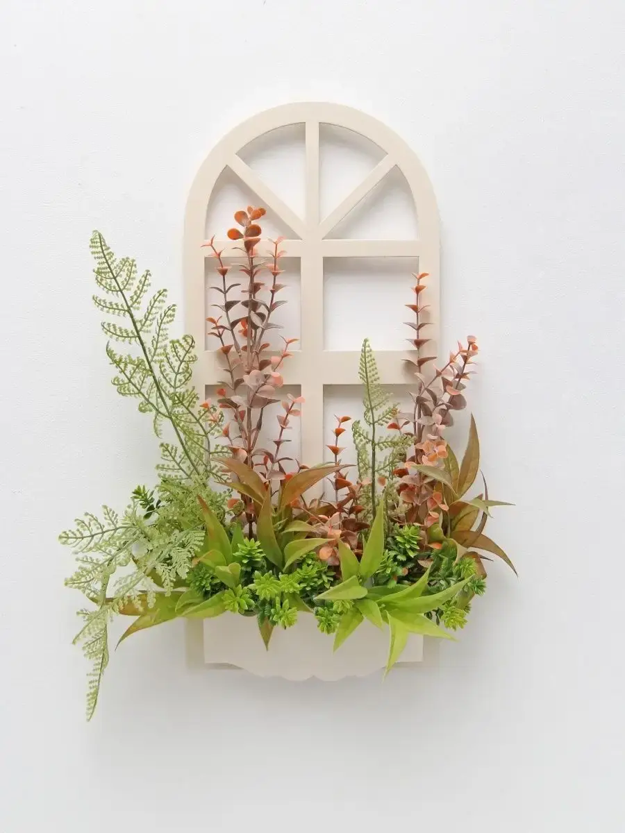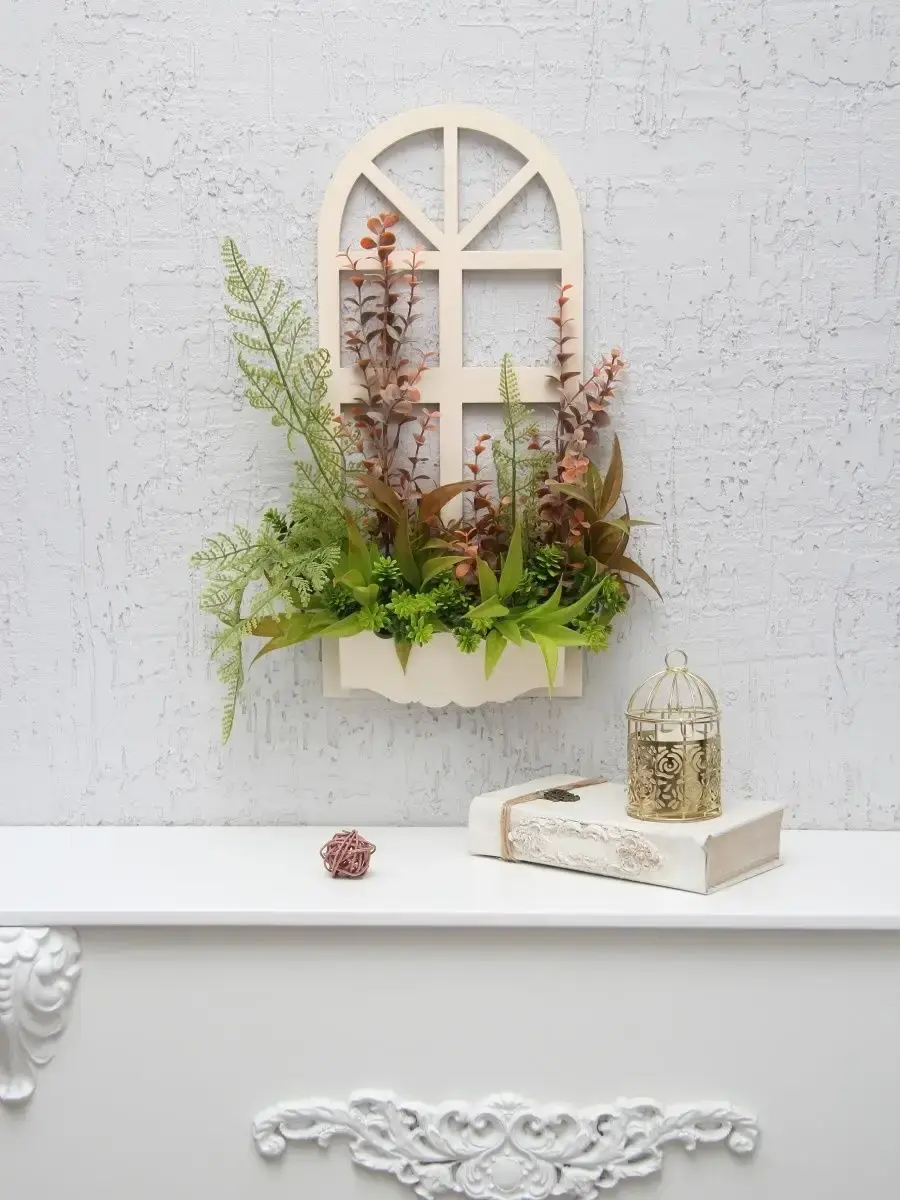 Украшение настенное для интерьера с искусственными интерьерными цветами . Композиция настенная в деревянном кашпо-окно с цветами, ВНИМАНИЕ! Размеры фальш-окна композиций отличаются (18х40см или 38х21см) Размер конкретной модели указан в карусели фотографий. Крепление на зубчатый крепеж , саморез для стены в комплекте. Отличное украшение к зеркалу, в прихожей, ванной или для кухни, где живым цветам недостаточно света. Всегда будут радовать и добавлять уюта в дом. Прекрасный подарок для дома, дачи или салона красоты. По желанию самостоятельно можно дополнить светодиодными нитями (светодиодной гирляндой). Уход : обдуть феном, протирать влажной тканью , обработать антистатиком..