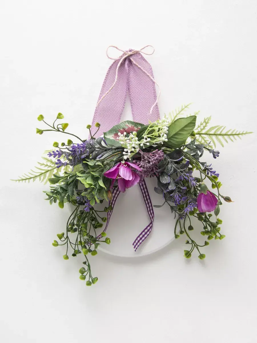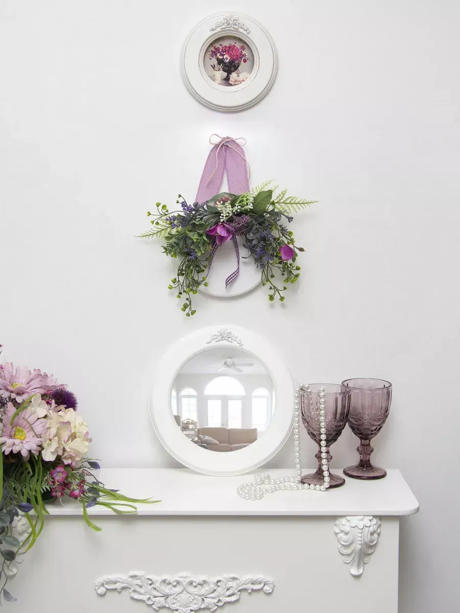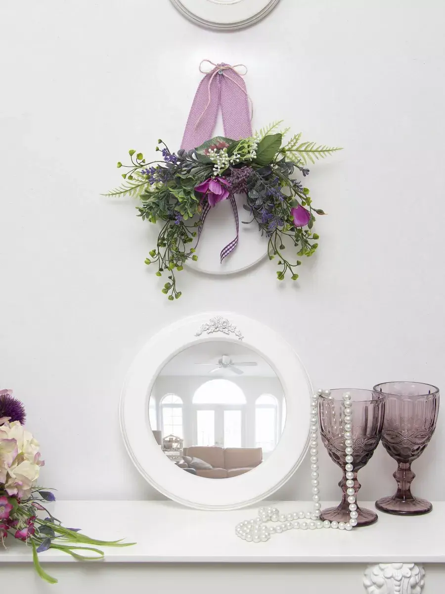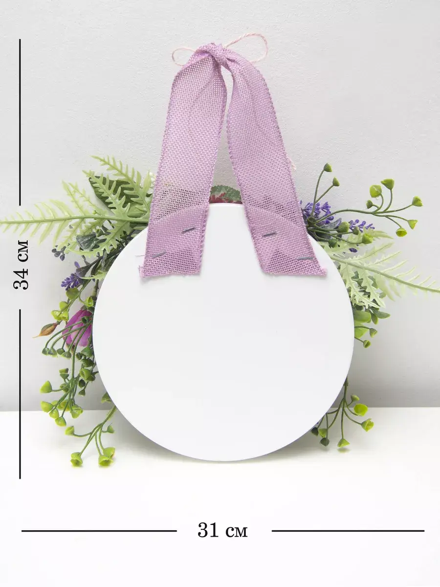 Подвесное настенное панно с цветами и объемным декором. Настенный декор изготовлен в ручную из высококачественной березовой фанеры, декорирован цветами и лентами, окрашено акриловой эмалью без запаха. Искусственные растения и милые ленточки придадут весеннего настроения и легкости вашему дому. Украшение на дверь. Размер панно - 30х28х7 см. Диаметр деревянного диска - 20 см. Настенный декор можно дополнить светодиодными нитями. Крепление для стены в комплекте.