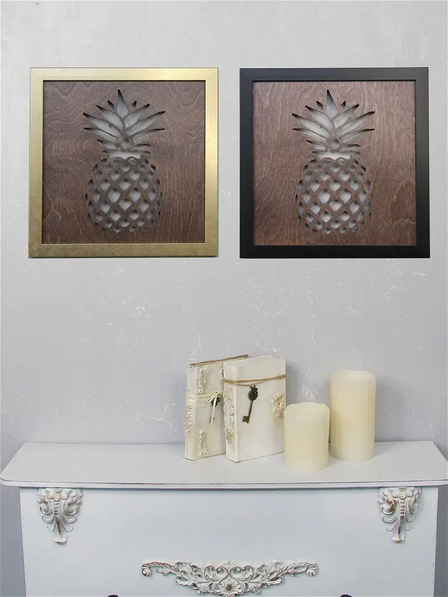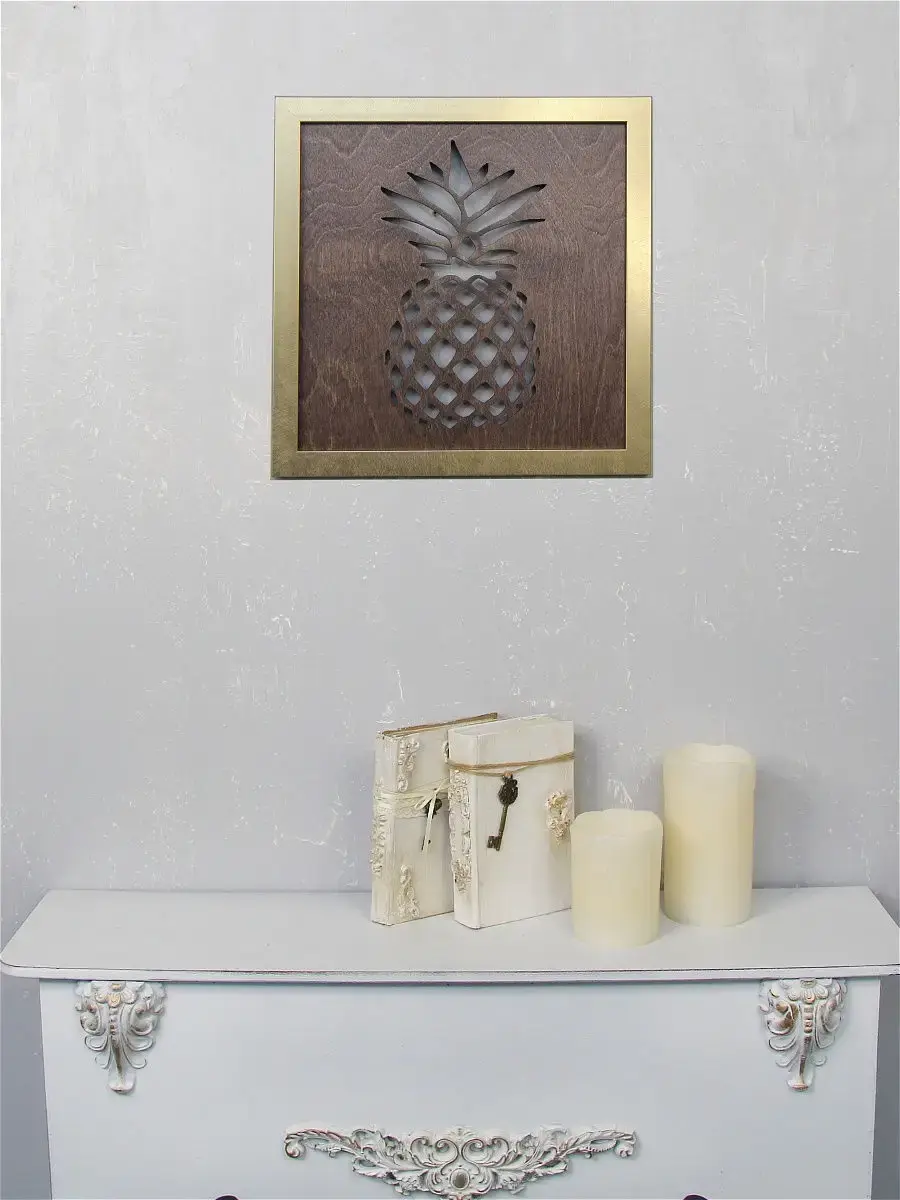 Резной декор из фанеры 4 мм. Покраска морилкой орех с сохранением структуры дерева и лаком водной основе без запаха. Рама из полиуретана, зубчатый крепеж по центру.
