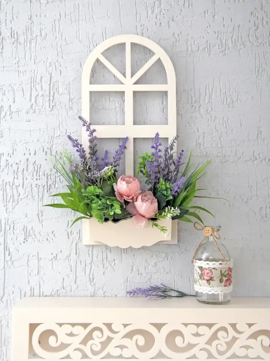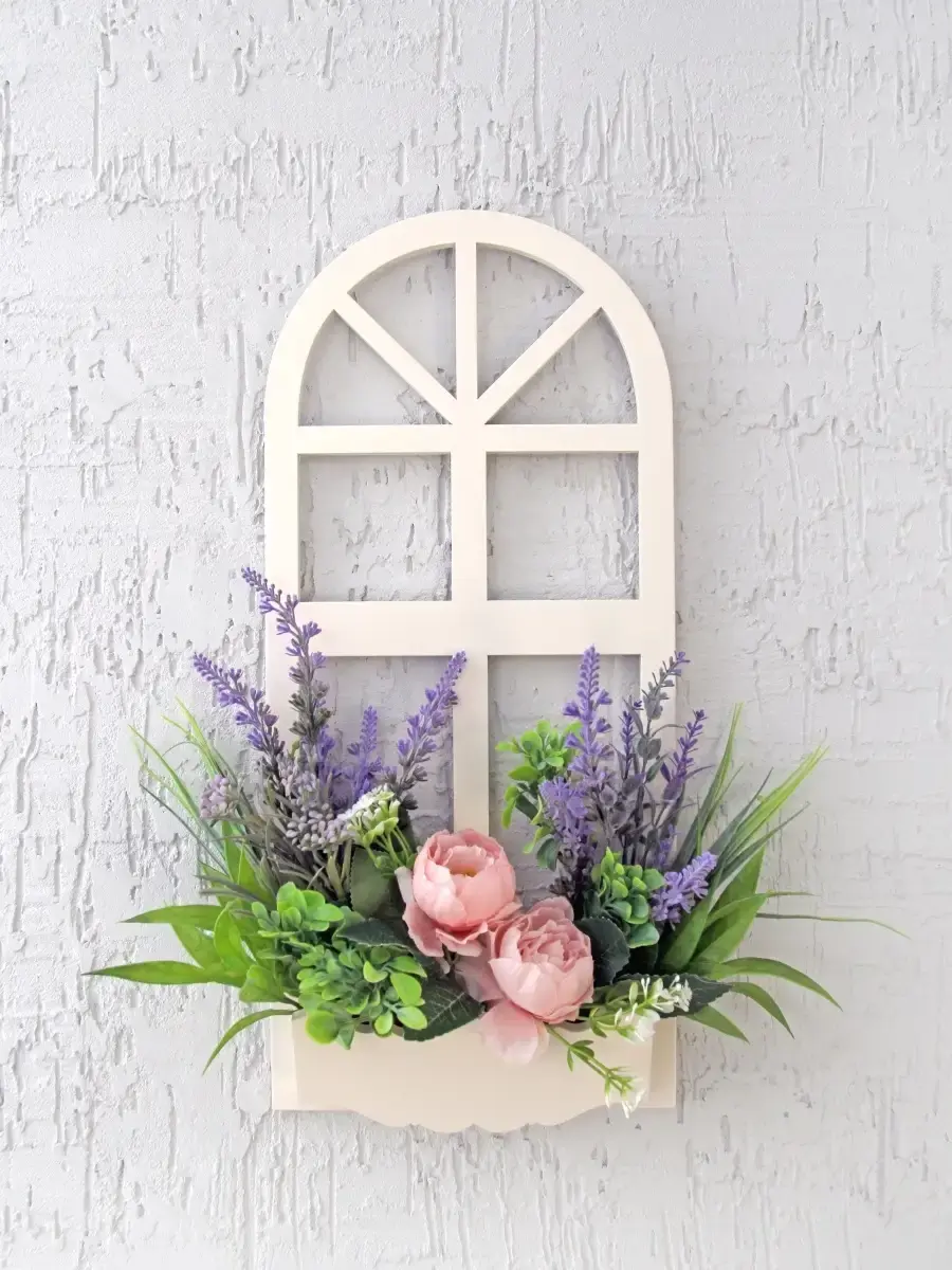 Украшение настенное для интерьера с искусственными интерьерными цветами . Композиция настенная в деревянном кашпо-окно с цветами, ВНИМАНИЕ! Размеры фальш-окна композиций отличаются (18х40см или 38х21см) Размер конкретной модели указан в карусели фотографий. Крепление на зубчатый крепеж , саморез для стены в комплекте. Отличное украшение к зеркалу, в прихожей, ванной или для кухни, где живым цветам недостаточно света. Всегда будут радовать и добавлять уюта в дом. Прекрасный подарок для дома, дачи или салона красоты. По желанию самостоятельно можно дополнить светодиодными нитями (светодиодной гирляндой). Уход : обдуть феном, протирать влажной тканью , обработать антистатиком..