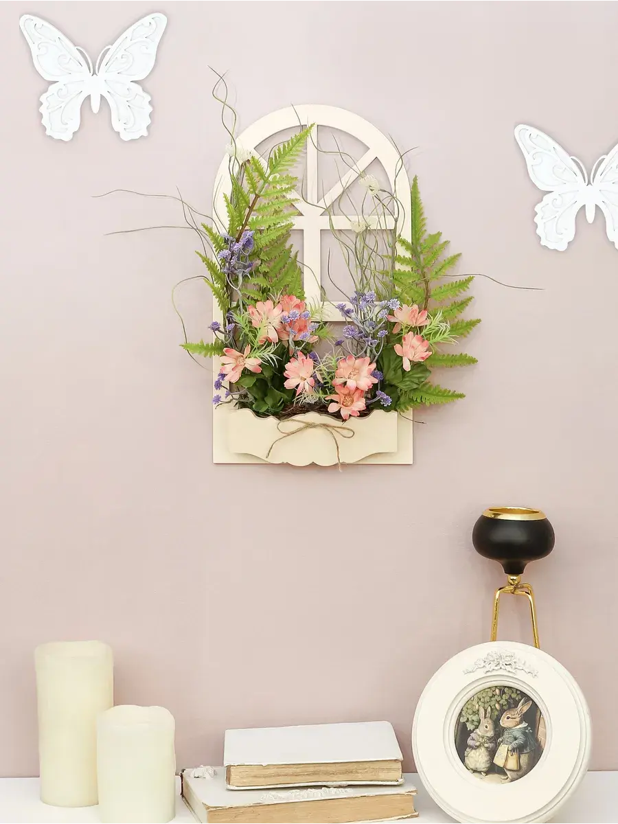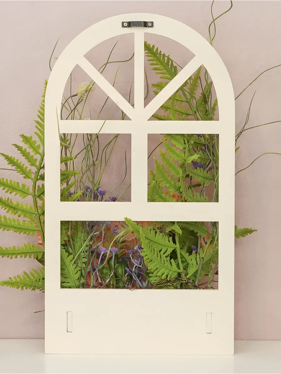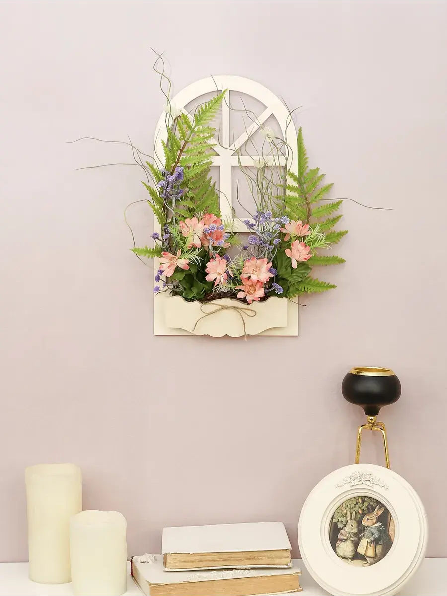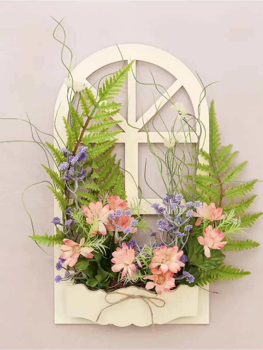 Украшение настенное для интерьера с искусственными интерьерными цветами. Композиции из папоротников, лаванды, ромашек, колокольчиков. Панно декоративное в виде окна с цветами. Цветы надежно закреплены в деревянном кашпо-окно, размер окна 40*18 см. Крепление на зубчатый крепеж , саморез для стены в комплекте. Отличное украшение к зеркалу, в прихожей, ванной или для кухни, где живым цветам недостаточно света. Всегда будут радовать и добавлять уюта в дом. По желанию самостоятельно можно дополнить светодиодными нитями (светодиодной гирляндой). Уход : обдуть феном, протирать влажной тканью , обработать антистатиком.