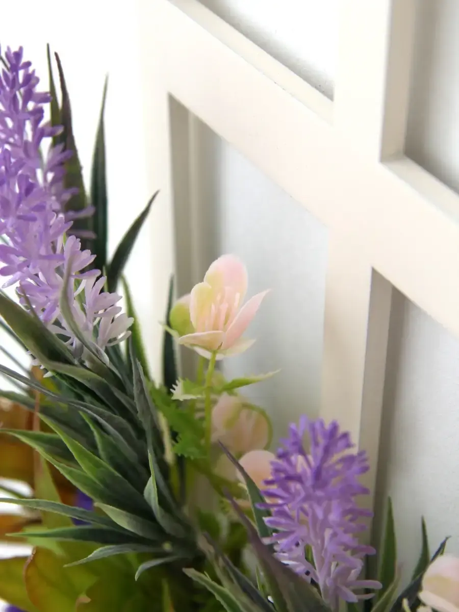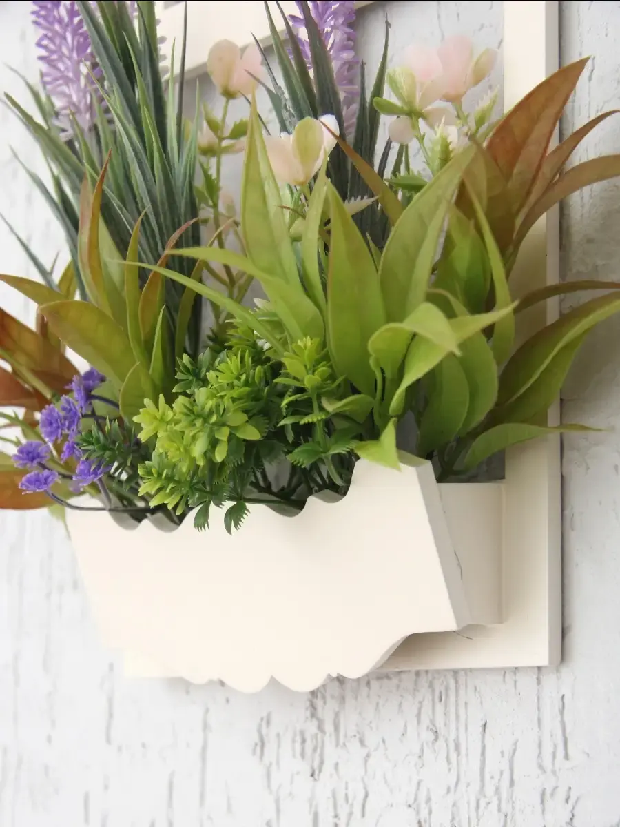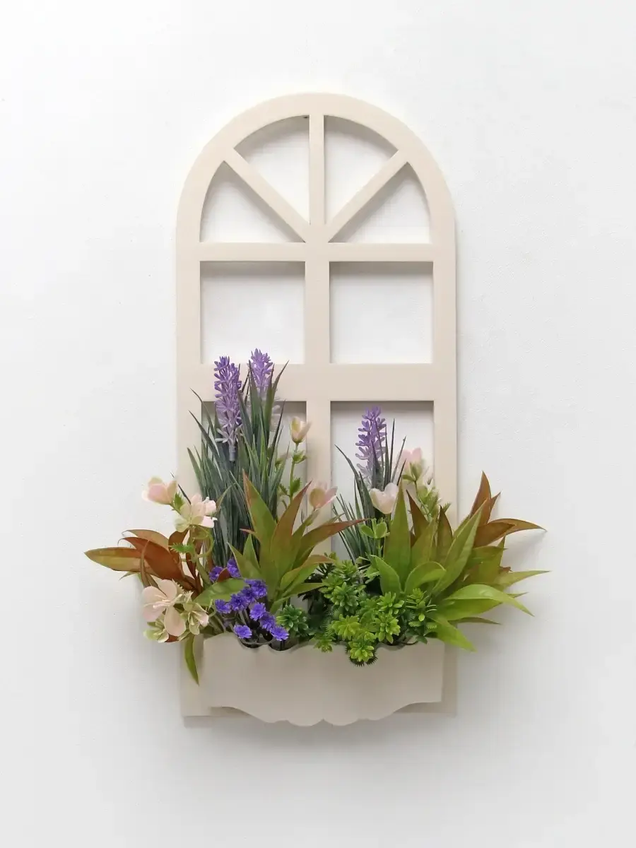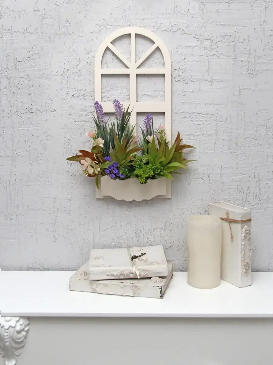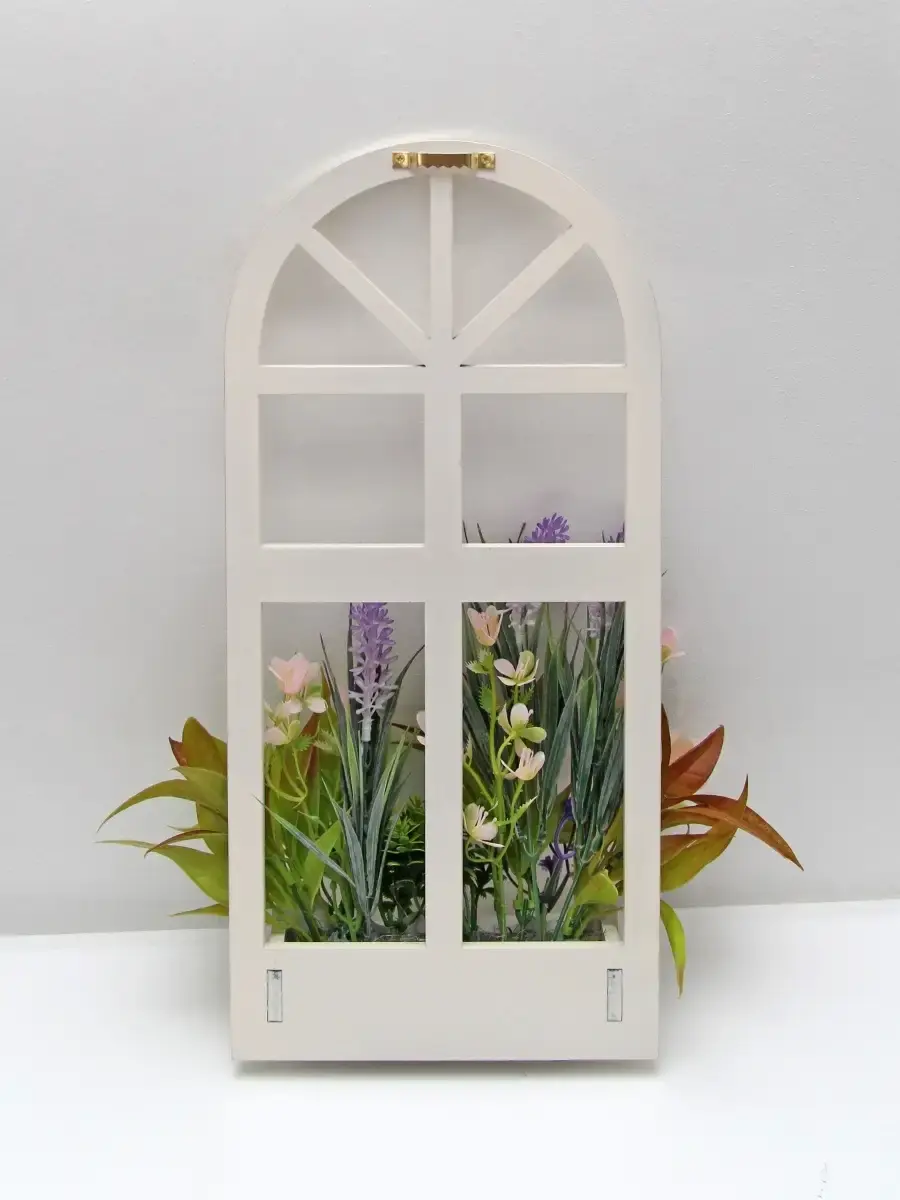 Украшение настенное для интерьера с искусственными интерьерными цветами . Композиция настенная в деревянном кашпо-окно с цветами, ВНИМАНИЕ! Размеры фальш-окна композиций отличаются (18х40см или 38х21см) Размер конкретной модели указан в карусели фотографий. Крепление на зубчатый крепеж , саморез для стены в комплекте. Отличное украшение к зеркалу, в прихожей, ванной или для кухни, где живым цветам недостаточно света. Всегда будут радовать и добавлять уюта в дом. Прекрасный подарок для дома, дачи или салона красоты. По желанию самостоятельно можно дополнить светодиодными нитями (светодиодной гирляндой). Уход : обдуть феном, протирать влажной тканью , обработать антистатиком..