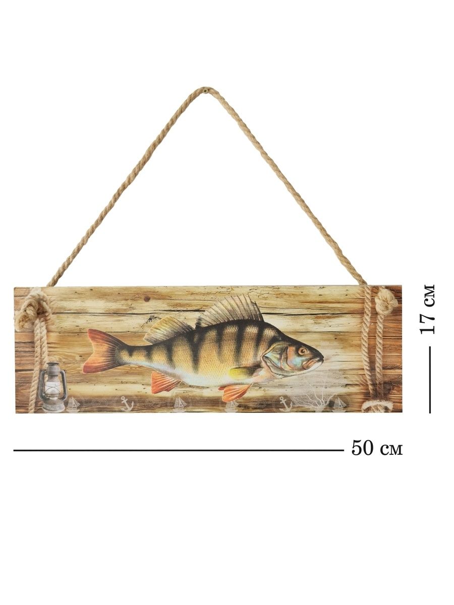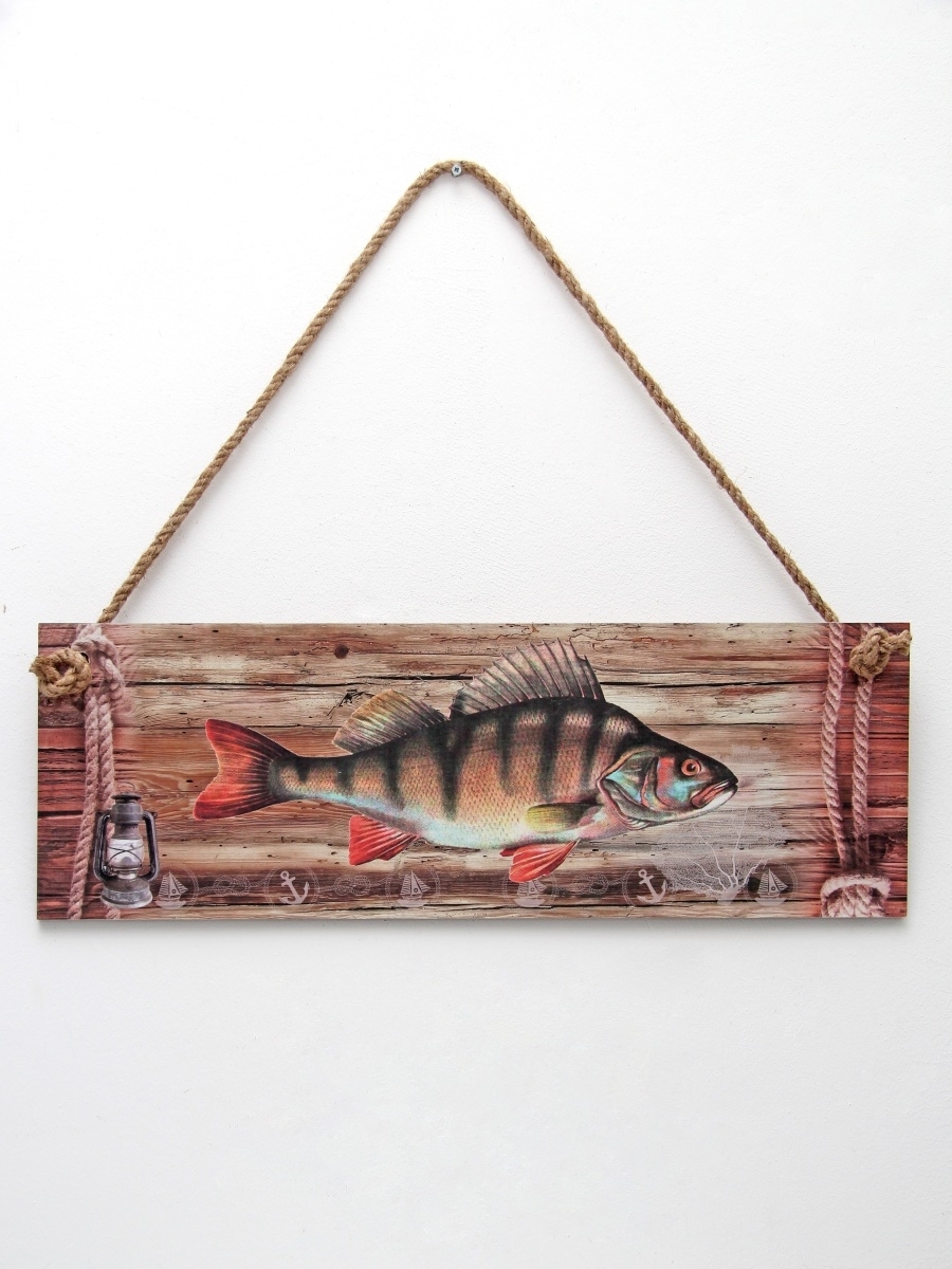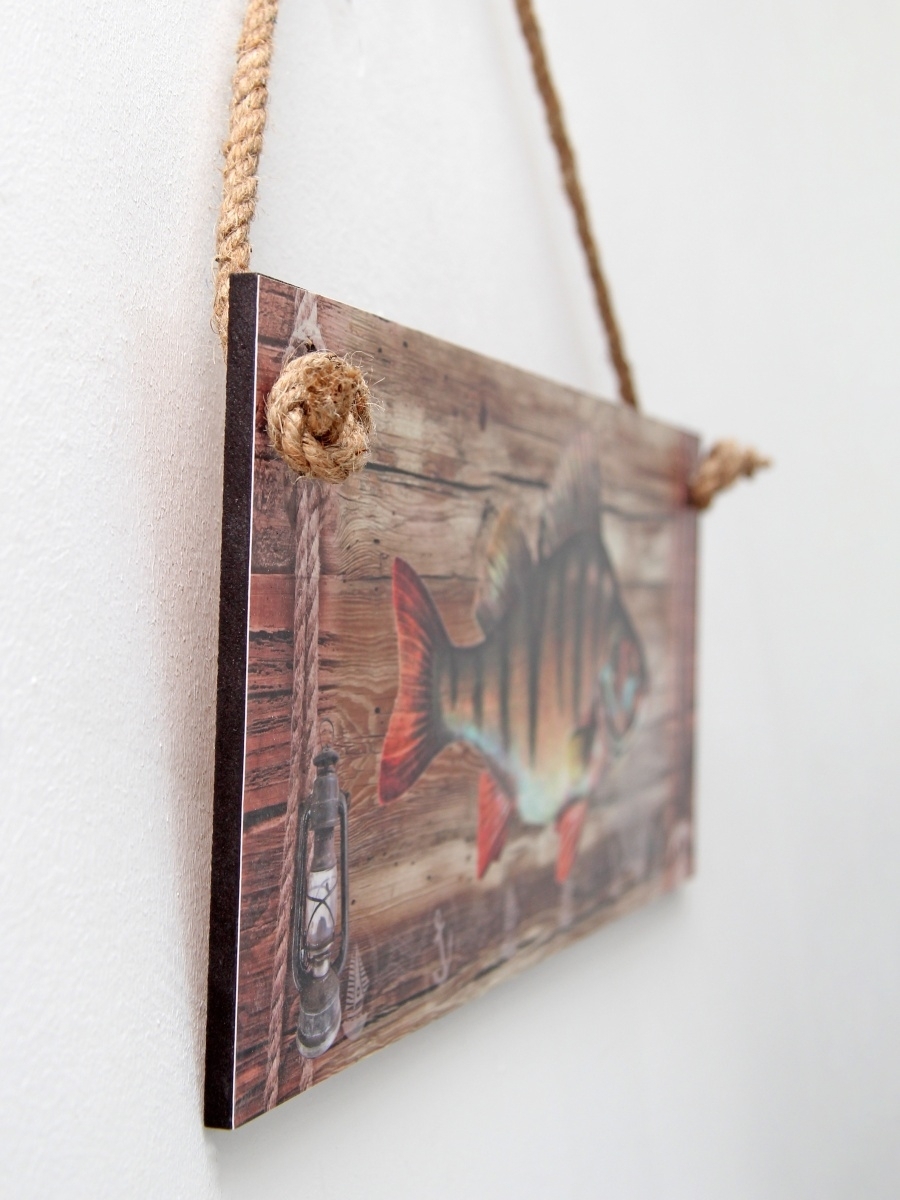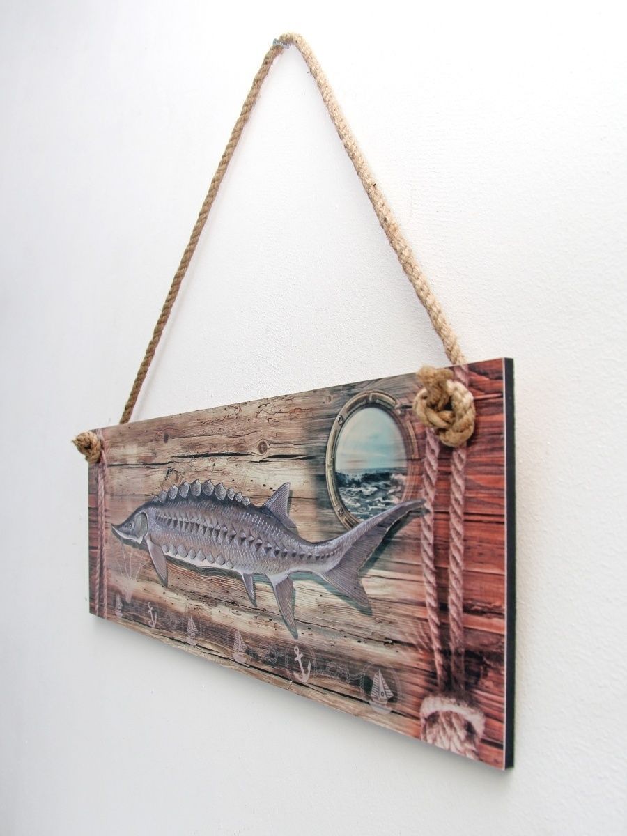 Интерьерная картина с рыбой - оригинальный сувенир-подарок рыбаку. Декоративное настенное панно на канате идеально украсит пространство внутри помещения: мастерскую настоящего мужчины, интерьер рыбацкого кафе и даже интересно будет смотреться в бане. Размер настенного декора 50х17 см. Панно изготовлено из высококачественного МДФ и покрыто горячей ламинацией, что создает защиту картине от влияния окружающей среды. Декор можно протирать влажной тканью.