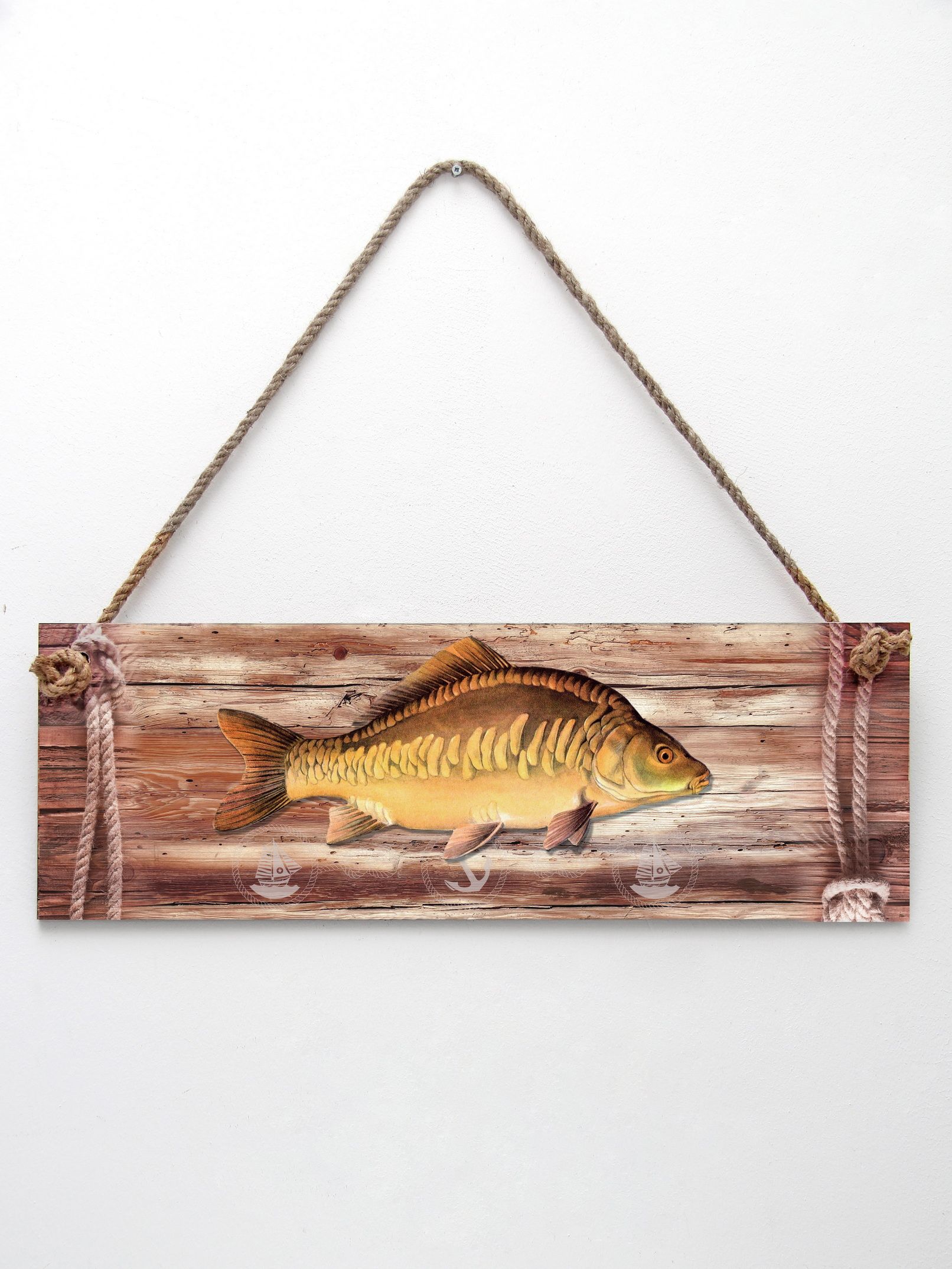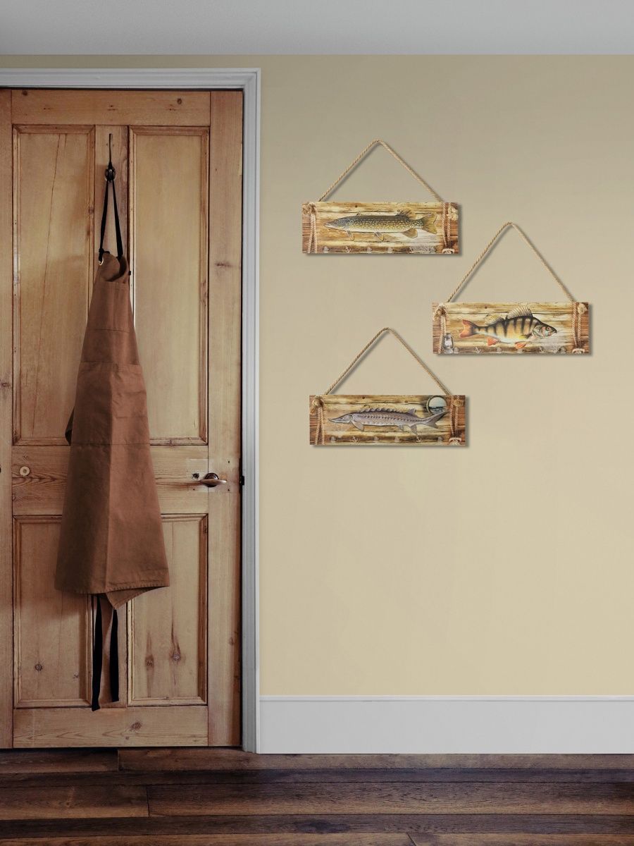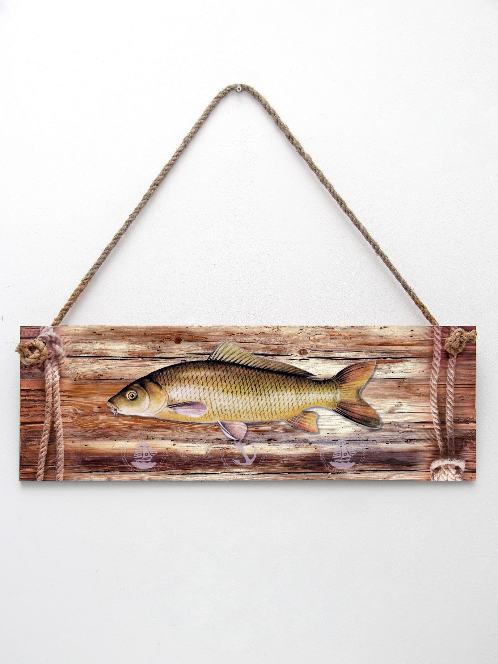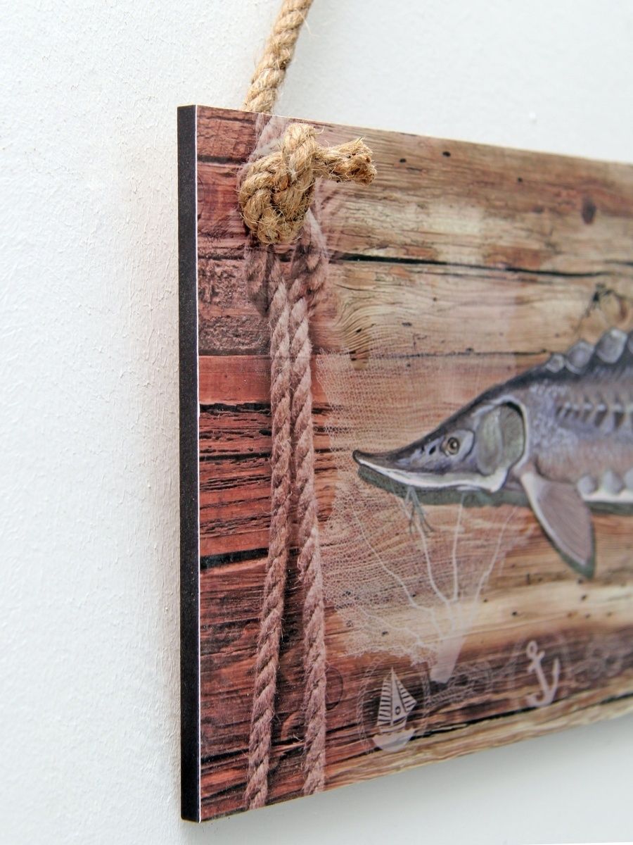 Интерьерная картина с рыбой - оригинальный сувенир-подарок рыбаку. Декоративное настенное панно на канате идеально украсит пространство внутри помещения: мастерскую настоящего мужчины, интерьер рыбацкого кафе и даже интересно будет смотреться в бане. Размер настенного декора 50х17 см. Панно изготовлено из высококачественного МДФ и покрыто горячей ламинацией, что создает защиту картине от влияния окружающей среды. Декор можно протирать влажной тканью.