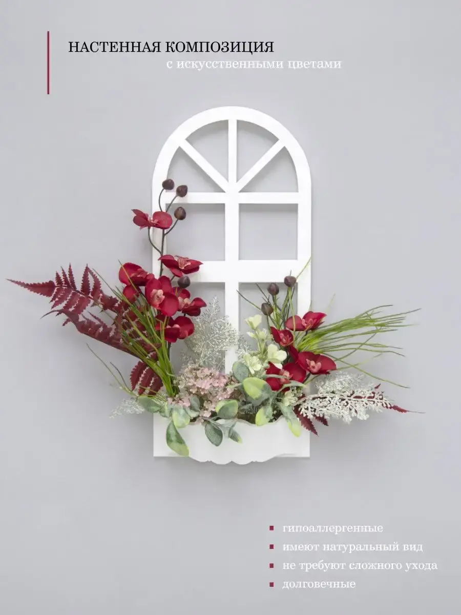 Настенная композиция "Окно с цветами" от HOME GALLERY - это идеальное решение для тех, кто хочет добавить в свой дом элемент природы без необходимости ухода за живыми растениями. Композиция представляет собой изящное окно, украшенное искусственными цветами, выполненными из высококачественных материалов, окно из МДФ. Эти растения не только не требуют полива или ухода, но и не имеют запаха, что делает их идеальным выбором для любого интерьера. Благодаря своей неприхотливости и эстетической привлекательности, настенная композиция "Окно с цветами" станет настоящим украшением вашего дома, привлекая взгляды и создавая атмосферу уюта и комфорта.